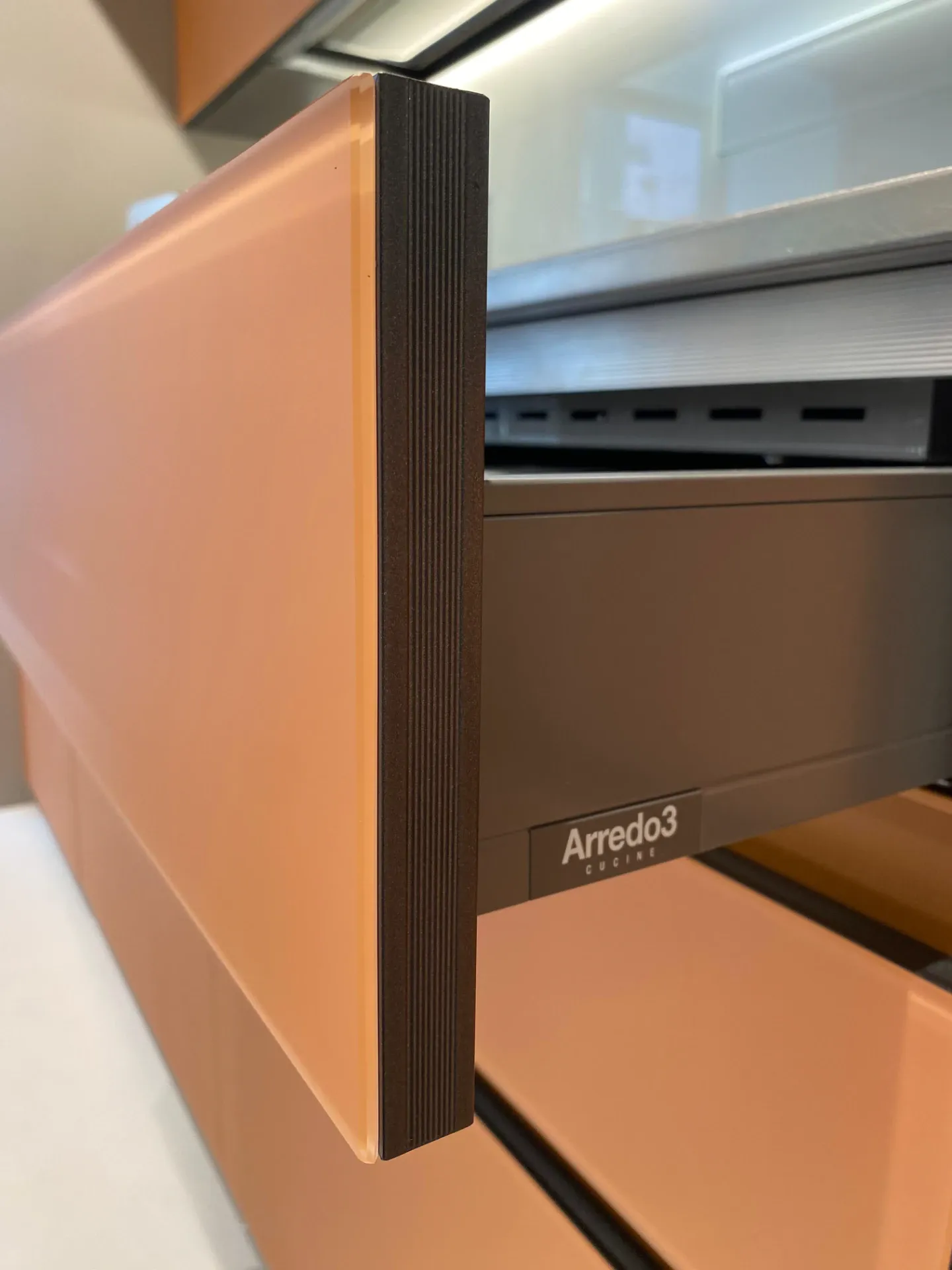La struttura in Visone 08 si fonde armoniosamente con i frontali in vetro Pechino 1399, creando un equilibrio tra calore e raffinatezza. Il vetro, con la sua superficie liscia e riflettente, esalta la luce naturale e regala luminosità a tutto l ambiente.