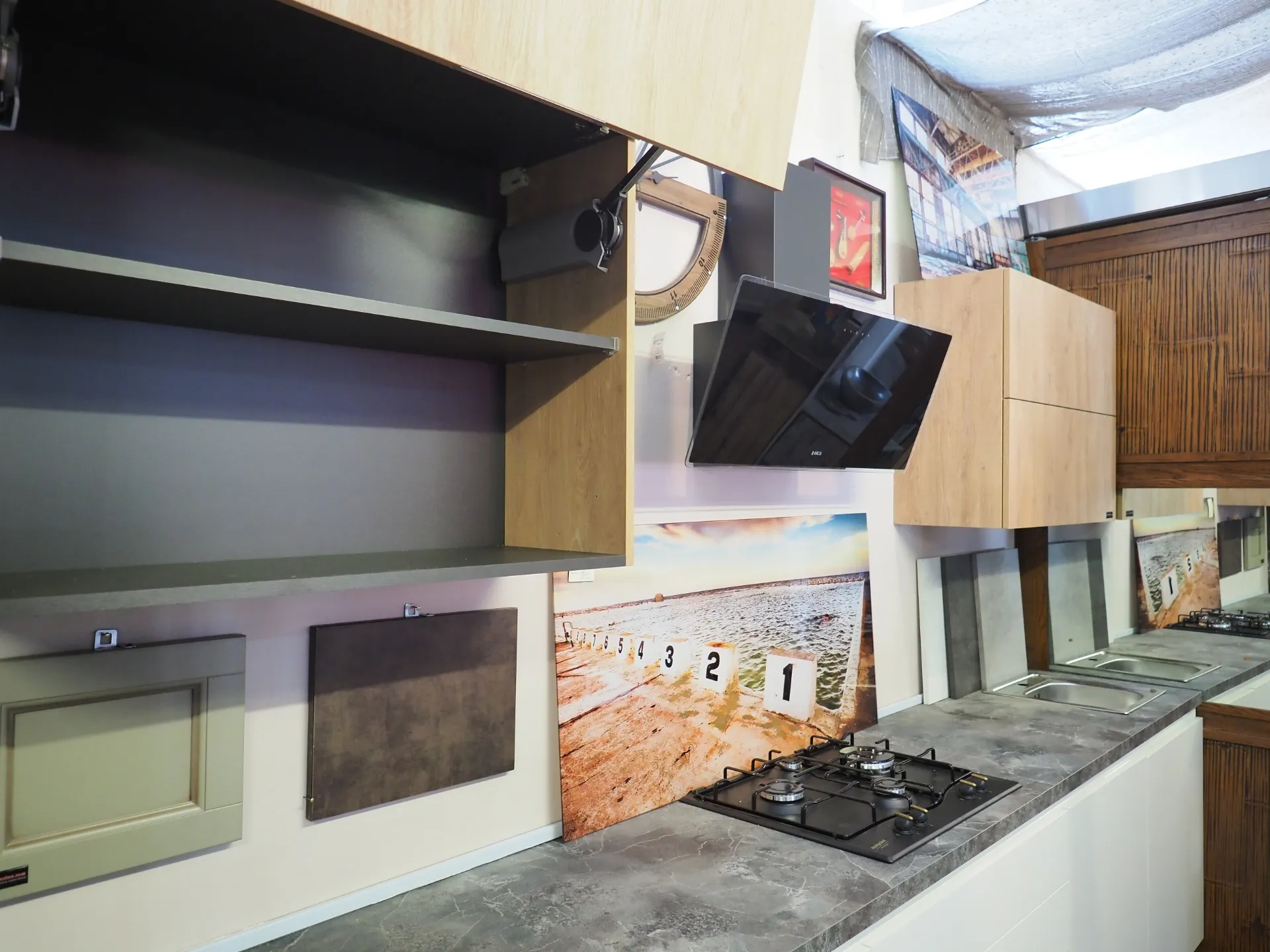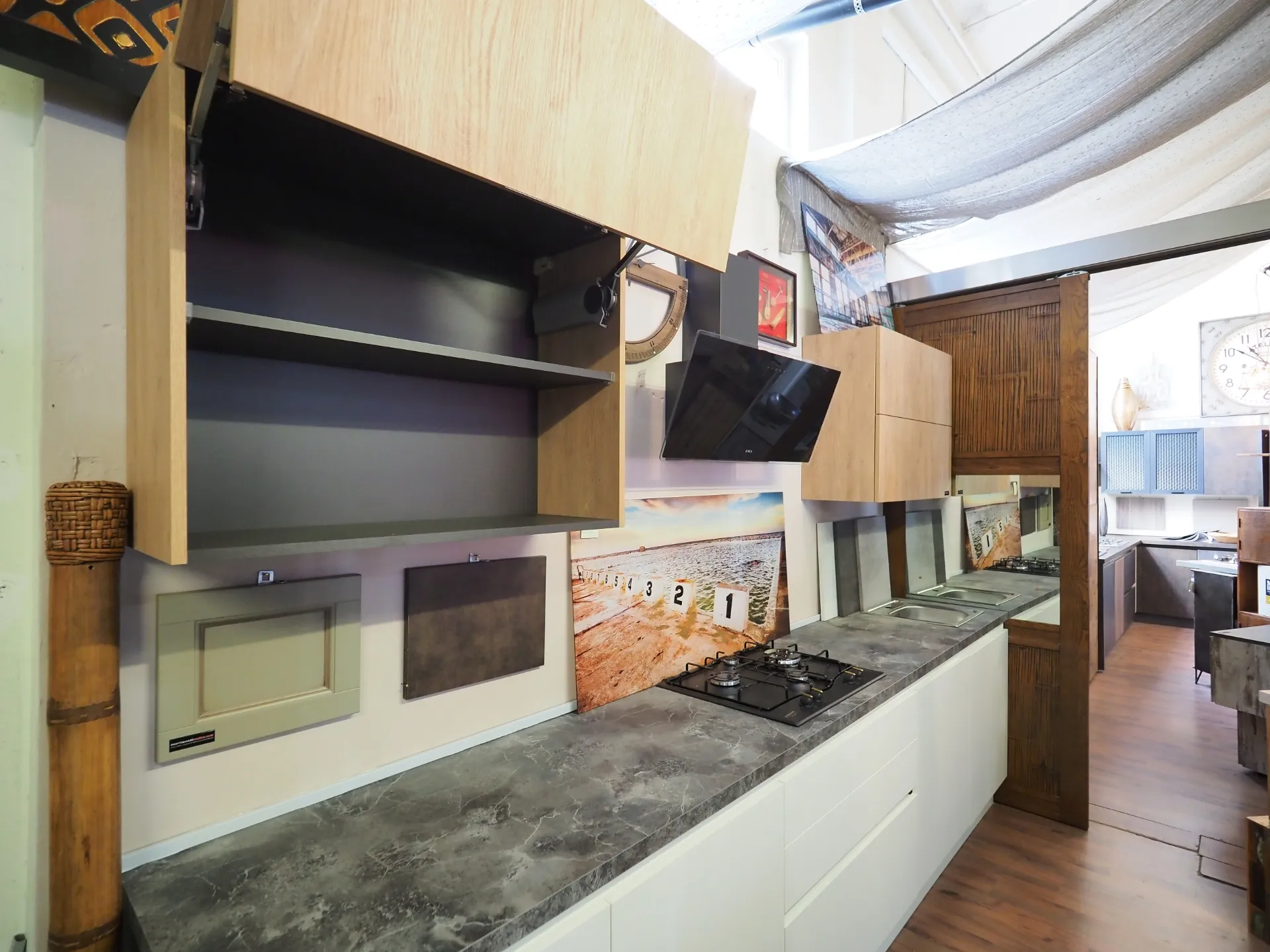 Cucina nella misura da cm da cm 330 completa di set elettrodomestici piano cottura e lavastoviglie hotpoint con aperture ammortizzate e guide rallentate sui cassetti e cestoni con 2 pensili da 90 apertura a libro bloom con cappa design elica stripe glass da 90 aspirante filtrante comandi touch con lavello vasca unica inox oppure vasca e scivolo inox colore dei pensili a libro in natural olmo royal oak con basi da 60 e base da 90 2 cassetti e cestone colore minimal frassinato white pensili colore noce olmo nordico royal oak che creano questo gioco cromatico molto attuale e di tendenza volendo se si vuole si puo' aggiungere una base o colonna forno e frigo tutti elementi da 60 cm portandola cucina a cm 390/420 con una variazione sul prezzo consegniamo in tutta italia spese a parte