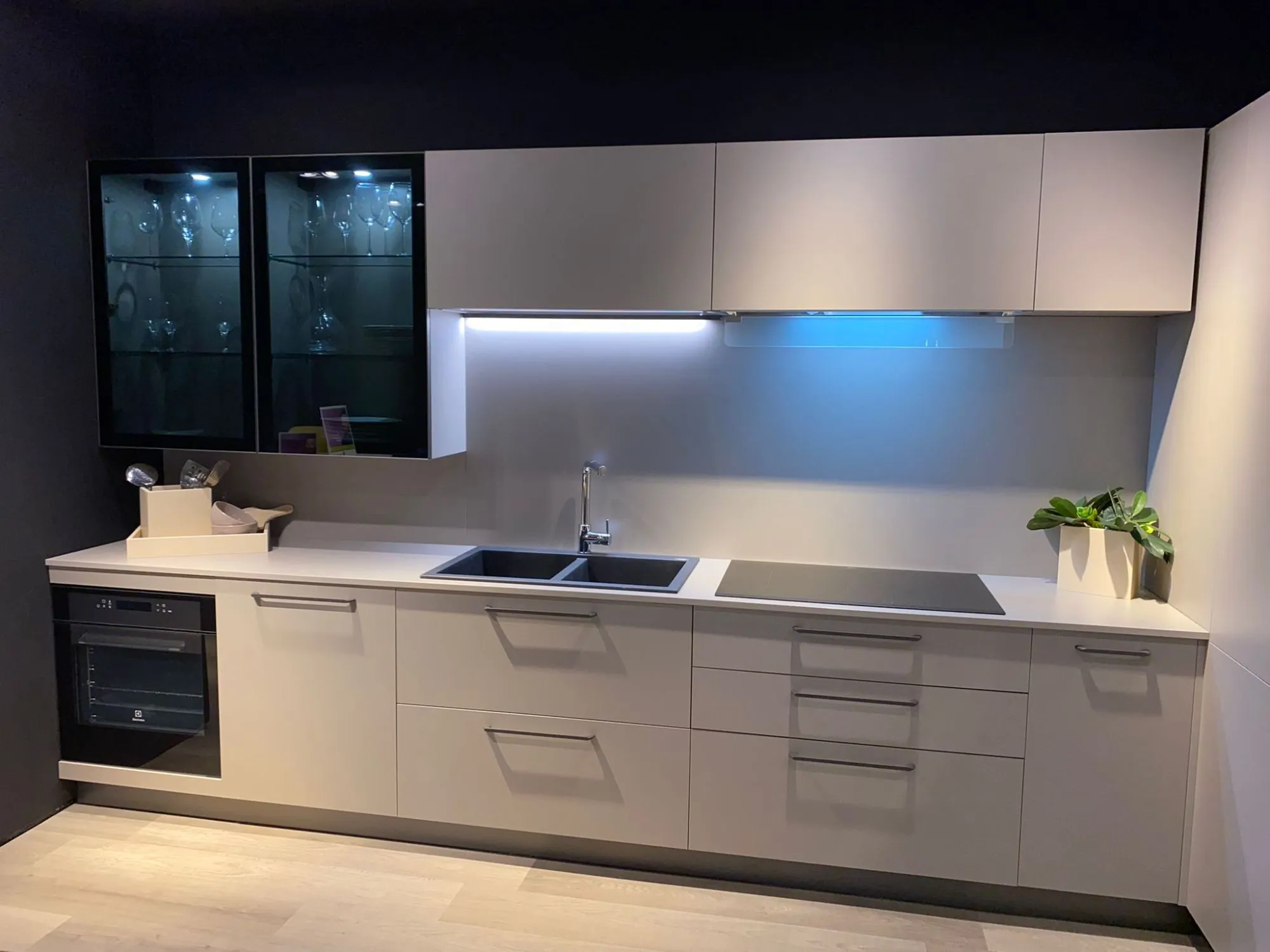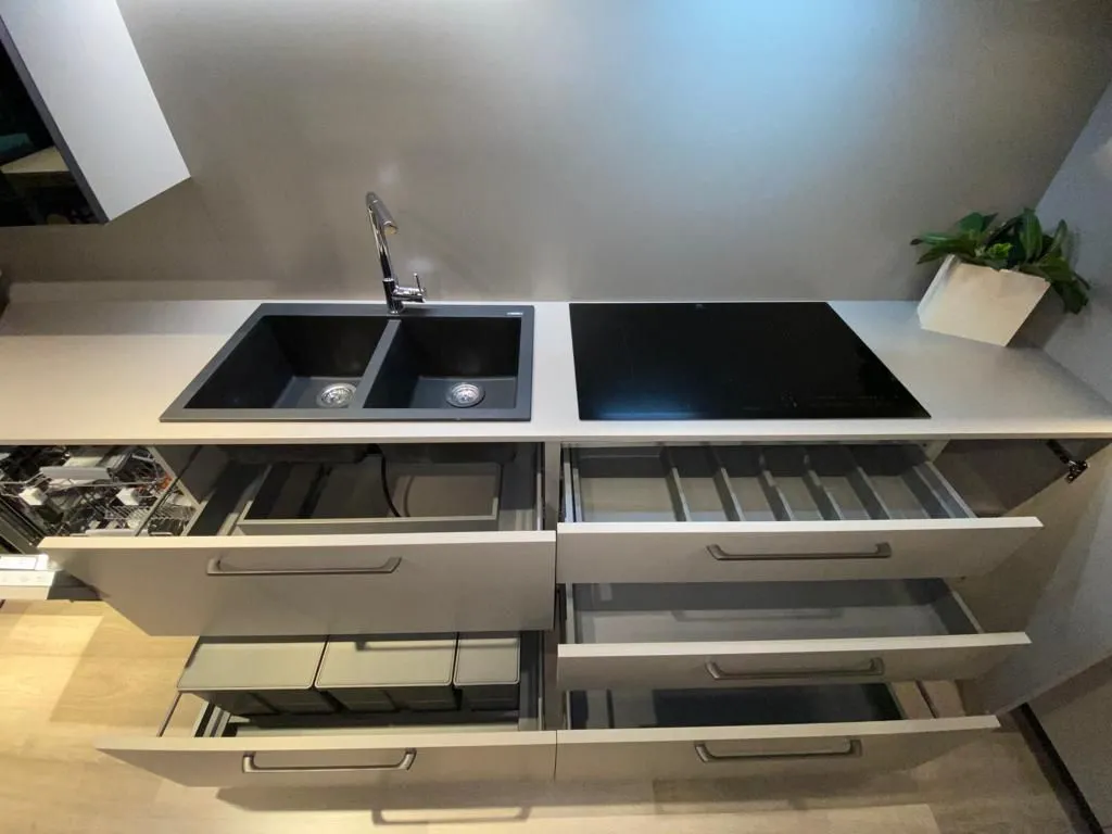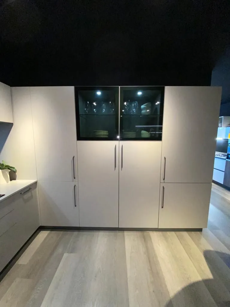 Cucina a "L" contemporanea e funzionale, anta liscia finitura tortora, maniglia e zoccolo finitura piombo, completa di elettrodomestici, frigo congelatore da 75 cm, vetrinette con vetro fume' lux e faretti integrati, colonna ad angolo super capiente. L 400,3 x 3150 prof. 600 altezza 2160 FRIGO ESCLUSO