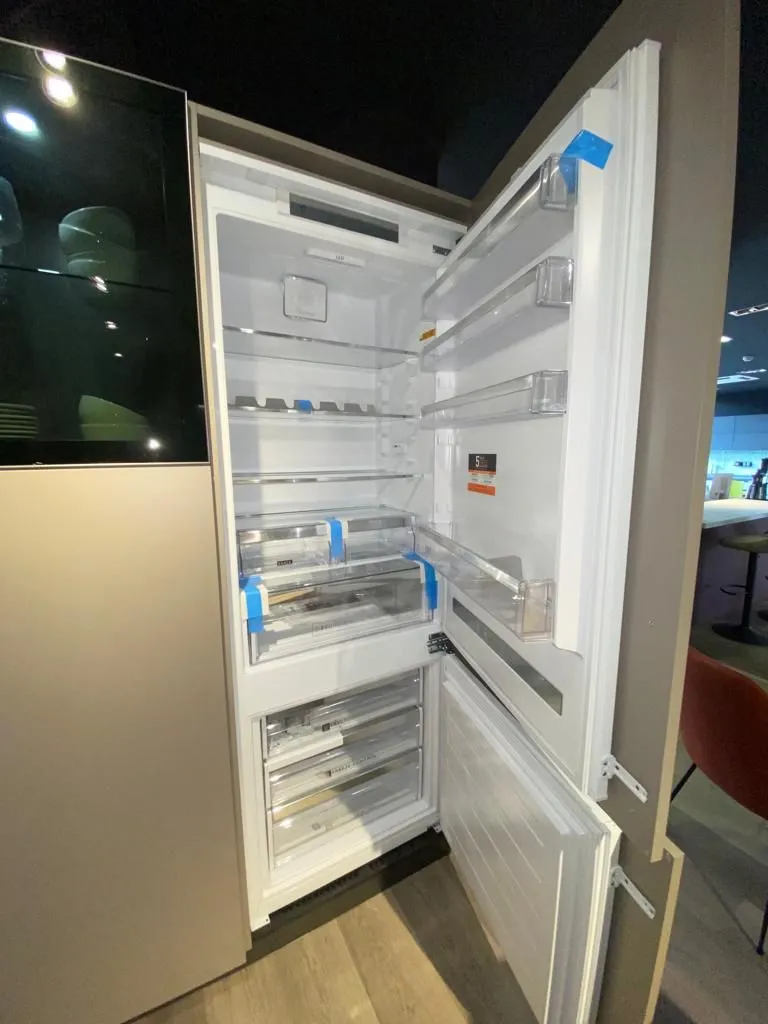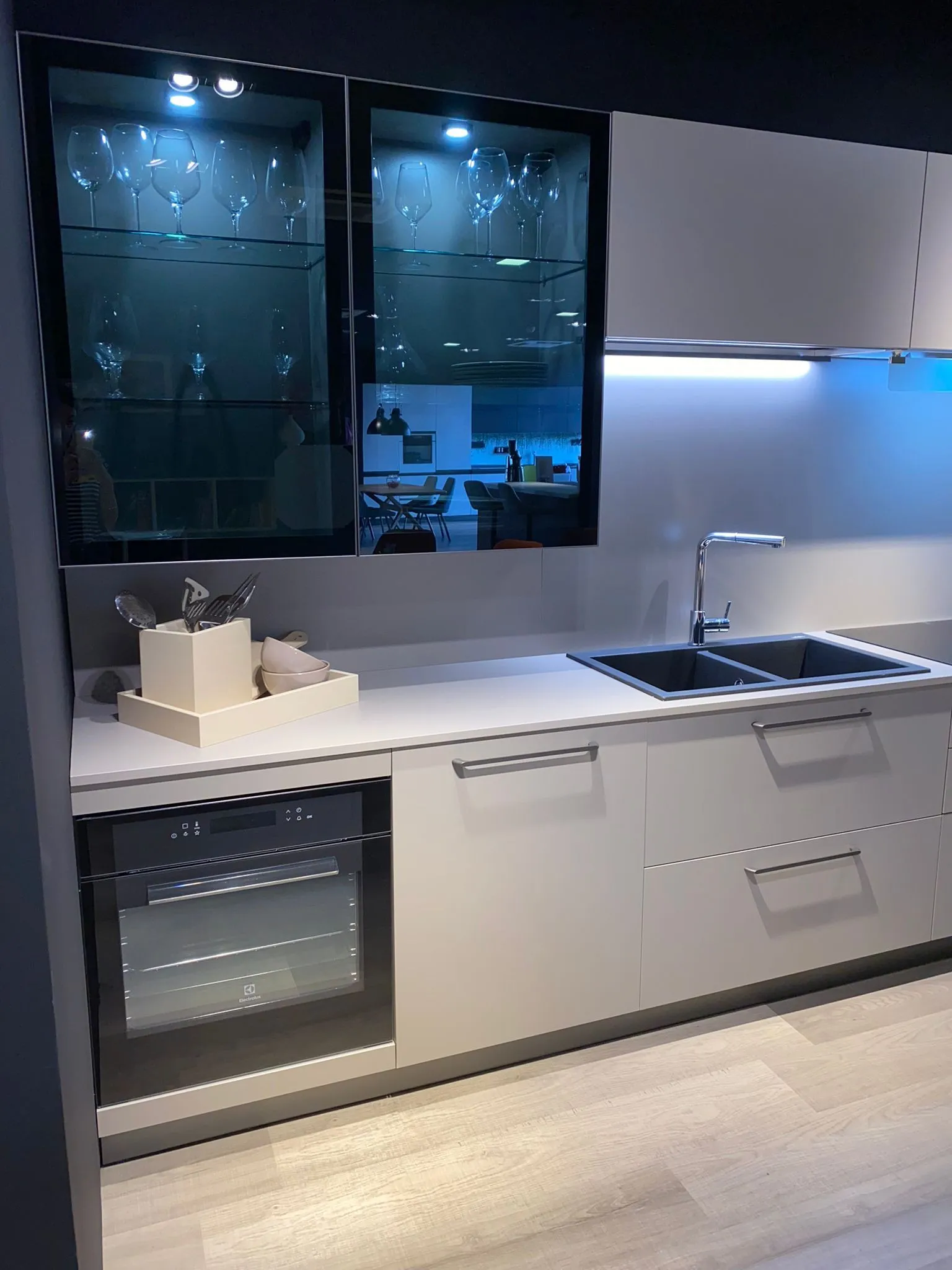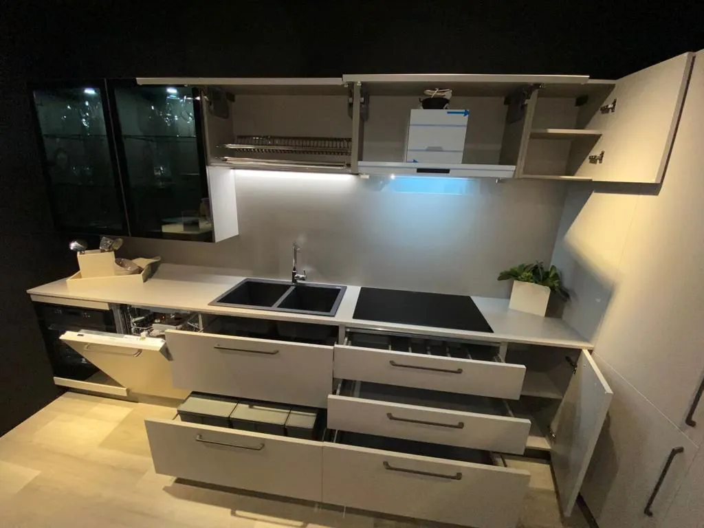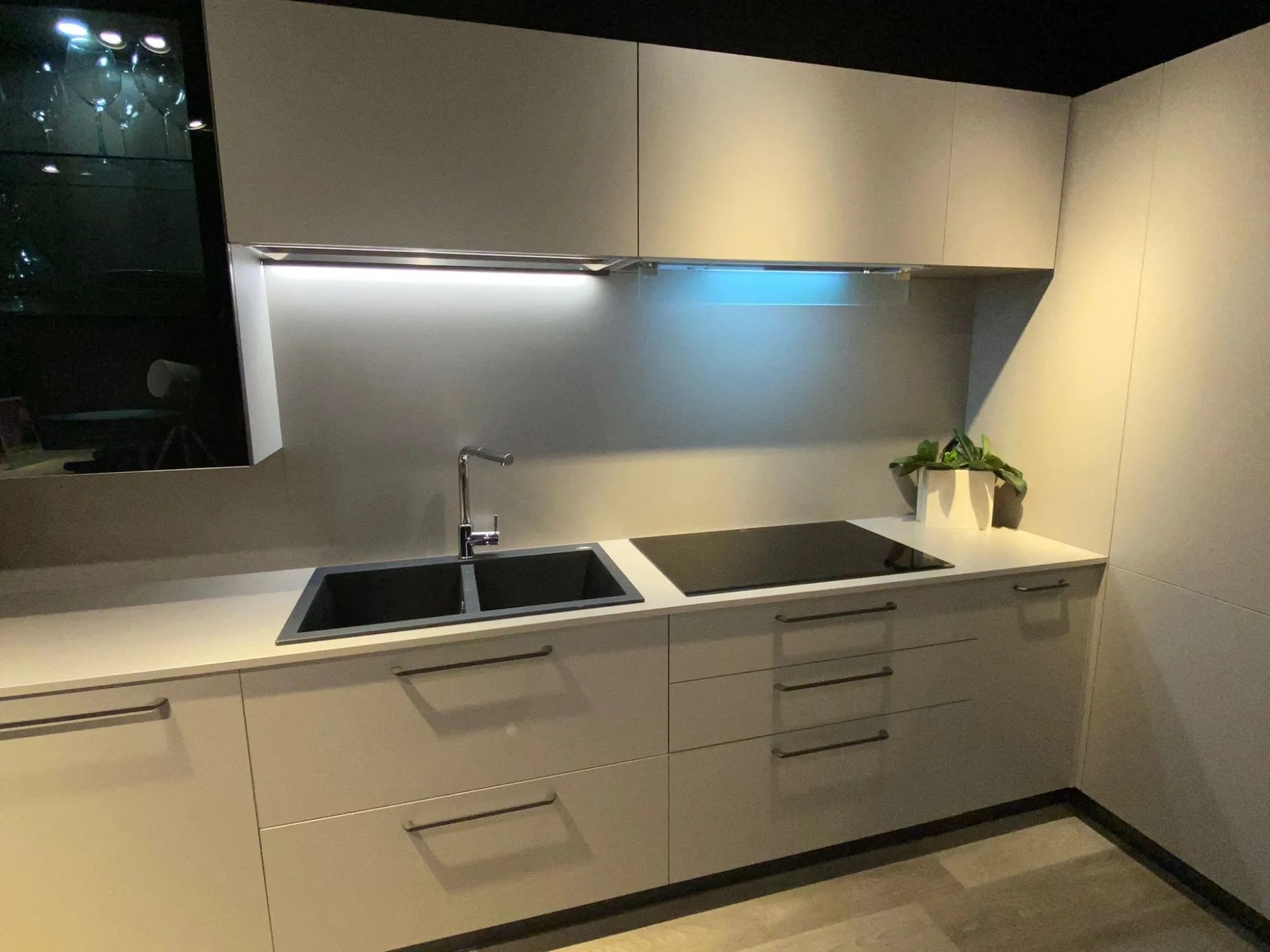 Cucina a "L" contemporanea e funzionale, anta liscia finitura tortora, maniglia e zoccolo finitura piombo, completa di elettrodomestici, frigo congelatore da 75 cm, vetrinette con vetro fume' lux e faretti integrati, colonna ad angolo super capiente. L 400,3 x 3150 prof. 600 altezza 2160 FRIGO ESCLUSO