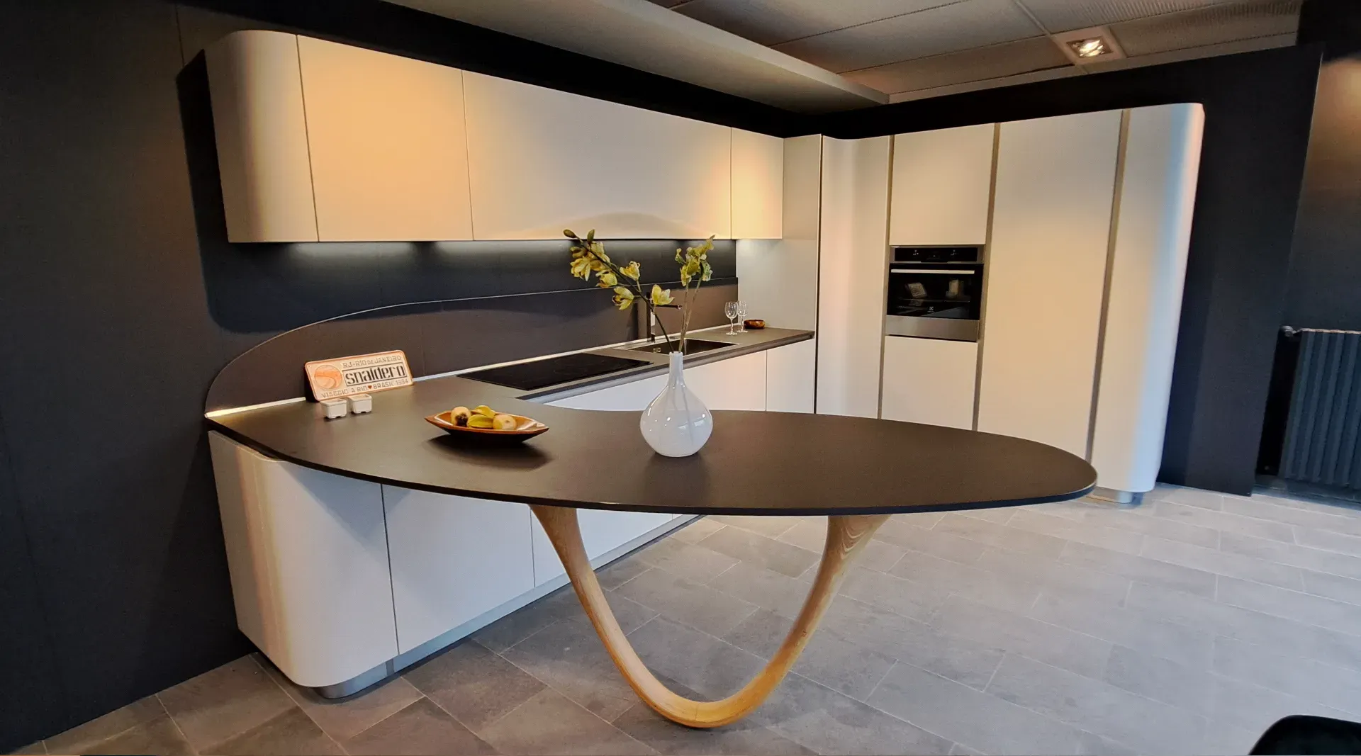 Cucina Snaidero mod. Ola 20 design Pininfarina in laccato opaco micalizzato bianco nordic, gamba tornita in legno massello, completa di illuminazione led sottopensile.