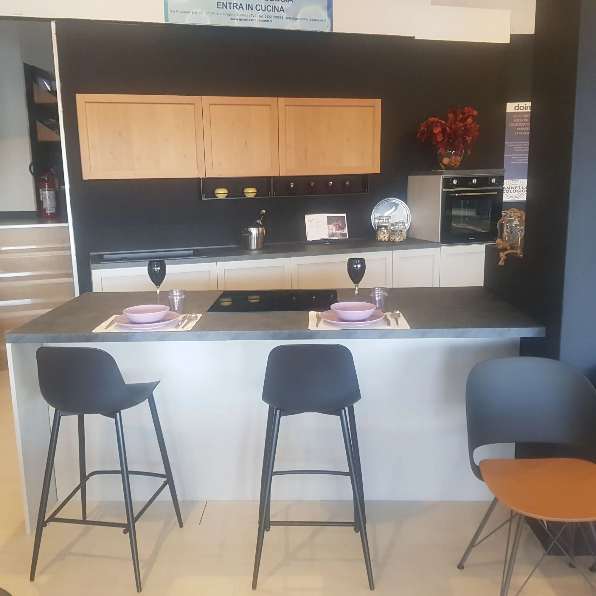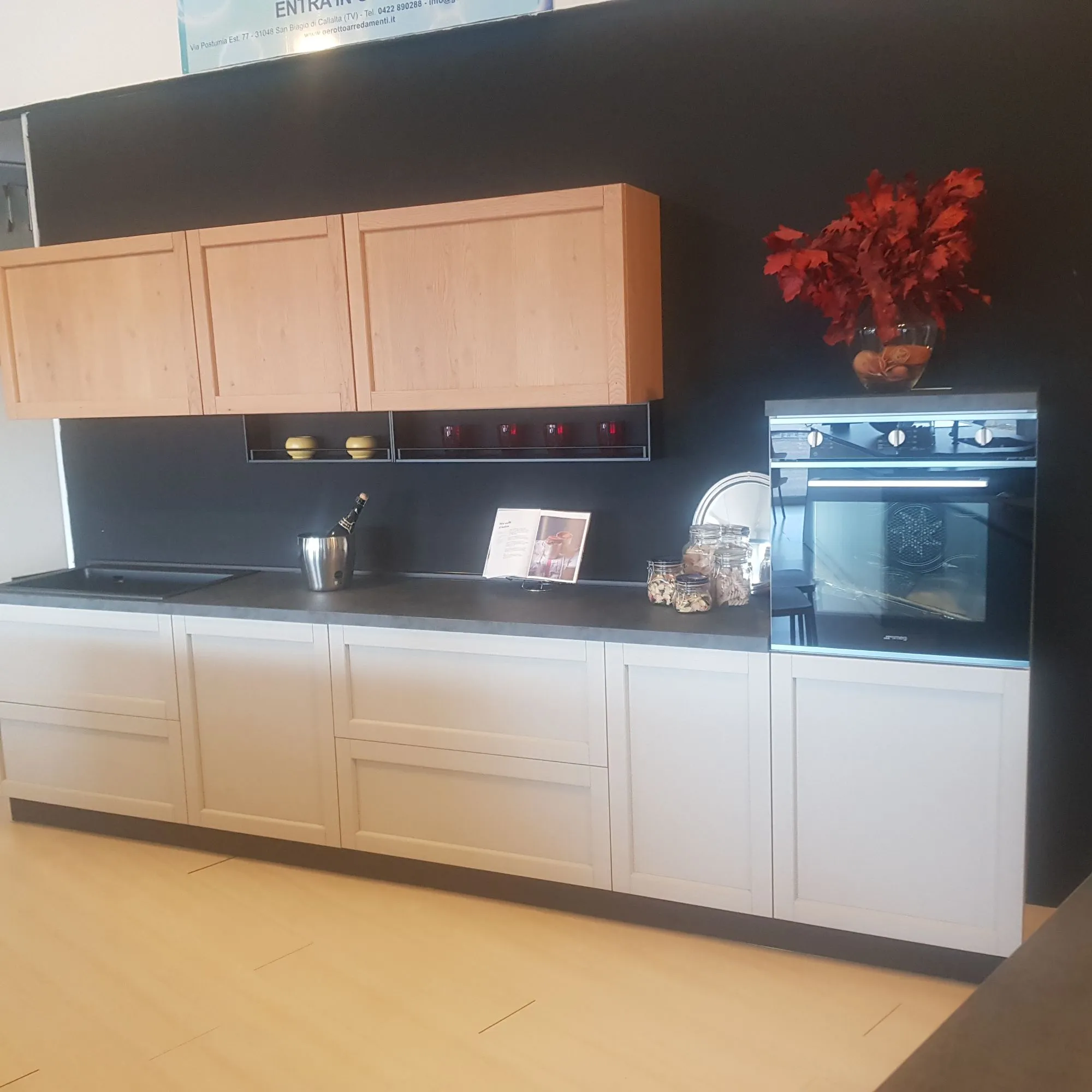 CUCINA COMPONIBILE NOAH CON ANTA IN LEGNO DI ROVERE NATURALE E LACCATO OPACO GHIANDA CON TOP LAMINATO ML. 345 E ISOLA ML. 2,10X90 TOP IN LAMINATO SP. 4 FRIGO A PARTE INOX DA 60 H. 190 SIEMENS ELETTRODOMESTICI SMEG
