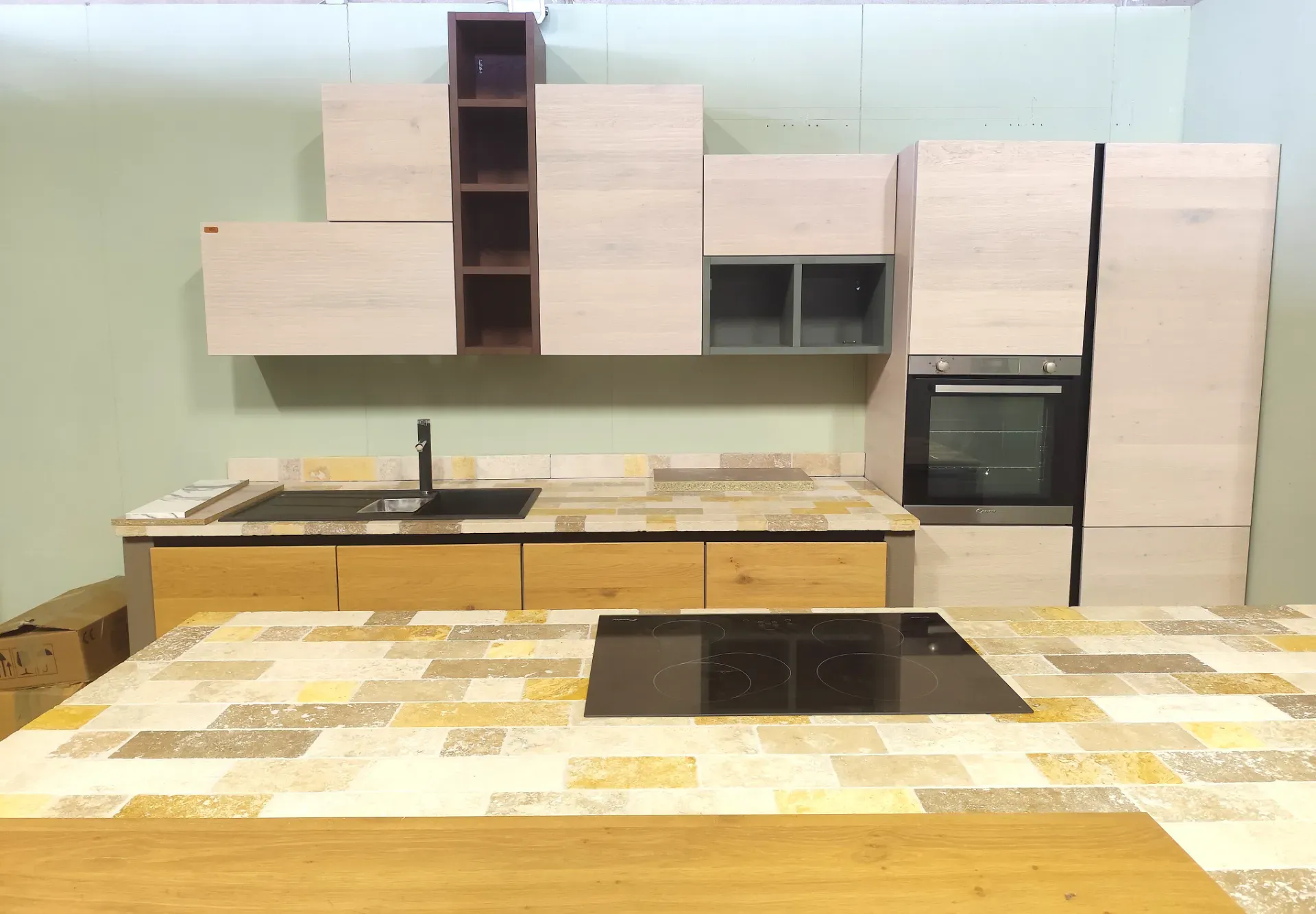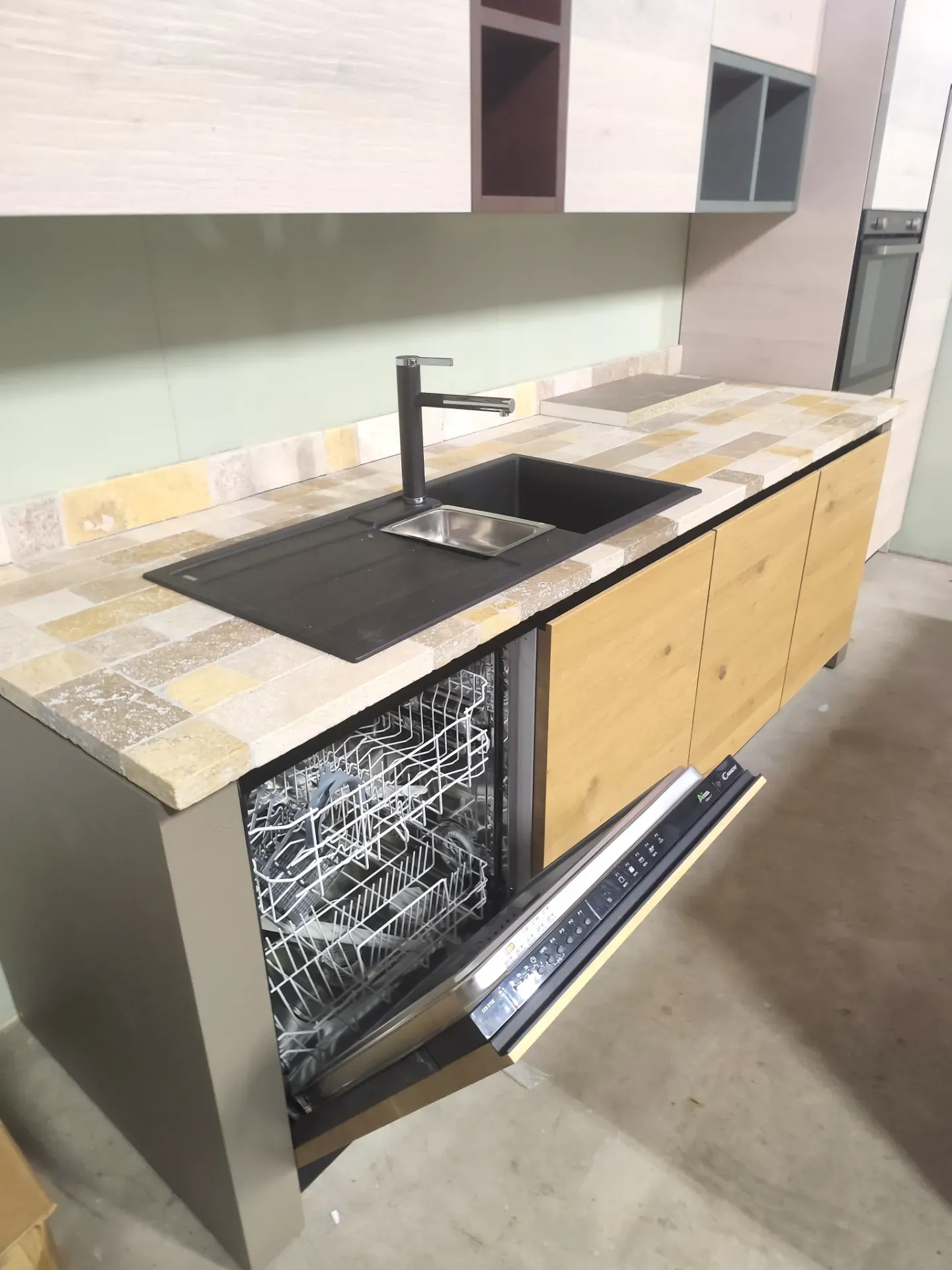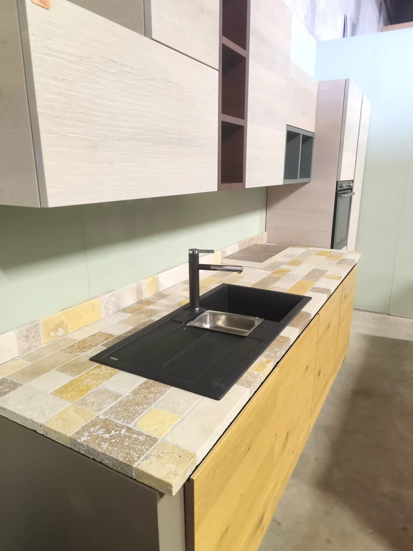 Punto di forza è il PIANO DI LAVORO in sassi del Piave fantasia Travertino, sia per la parte lineare che per l isola. Il piano sporgente di quest ultima invece è impiallacciato in tinta rovere naturale, perfetto come appoggio per mangiare.