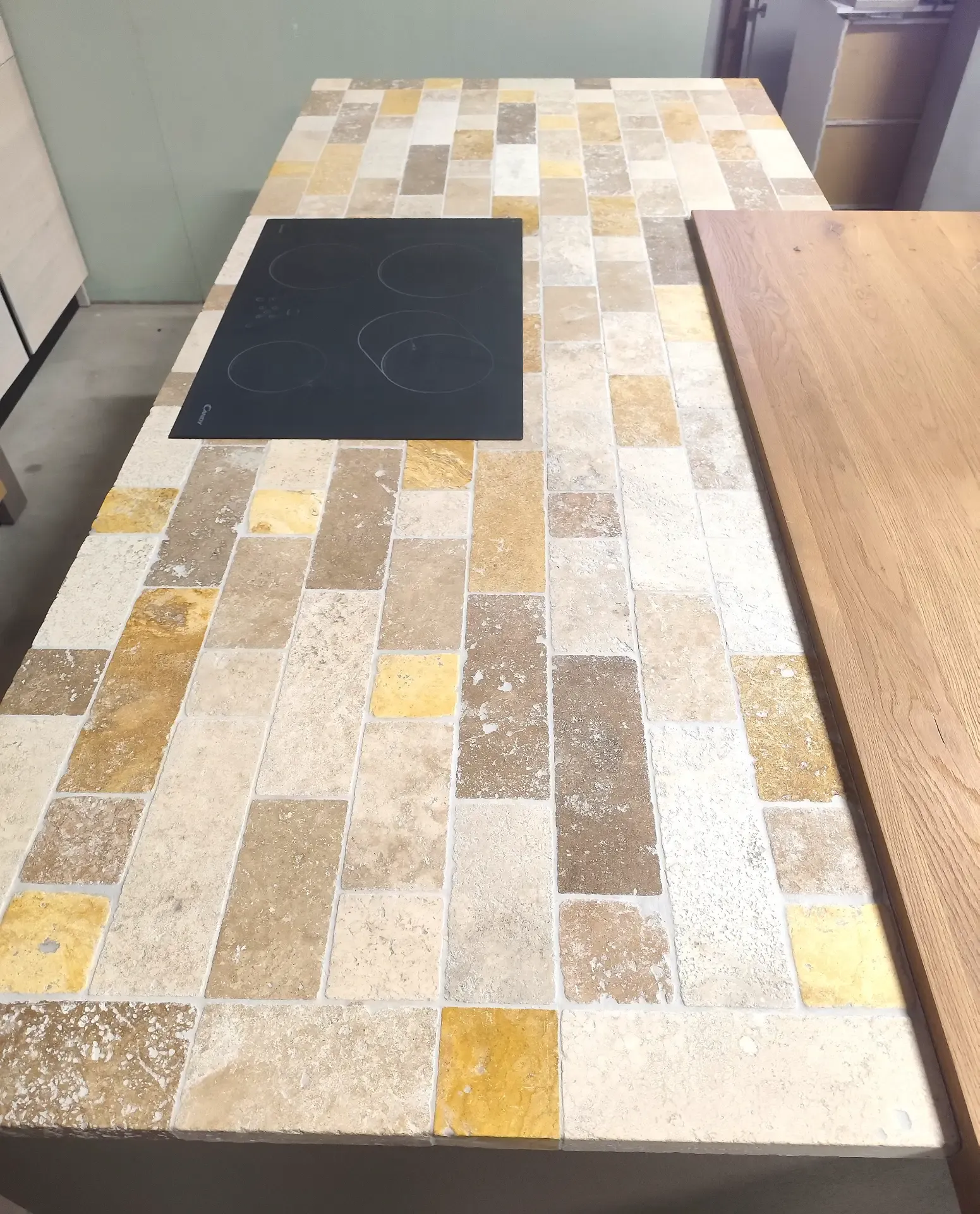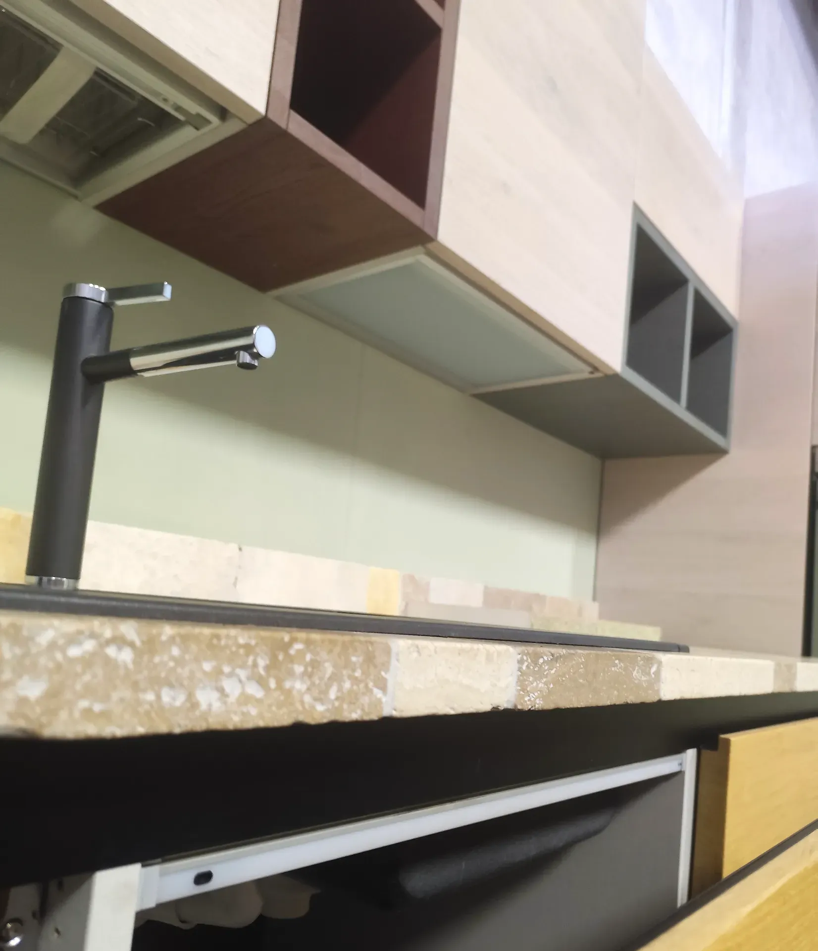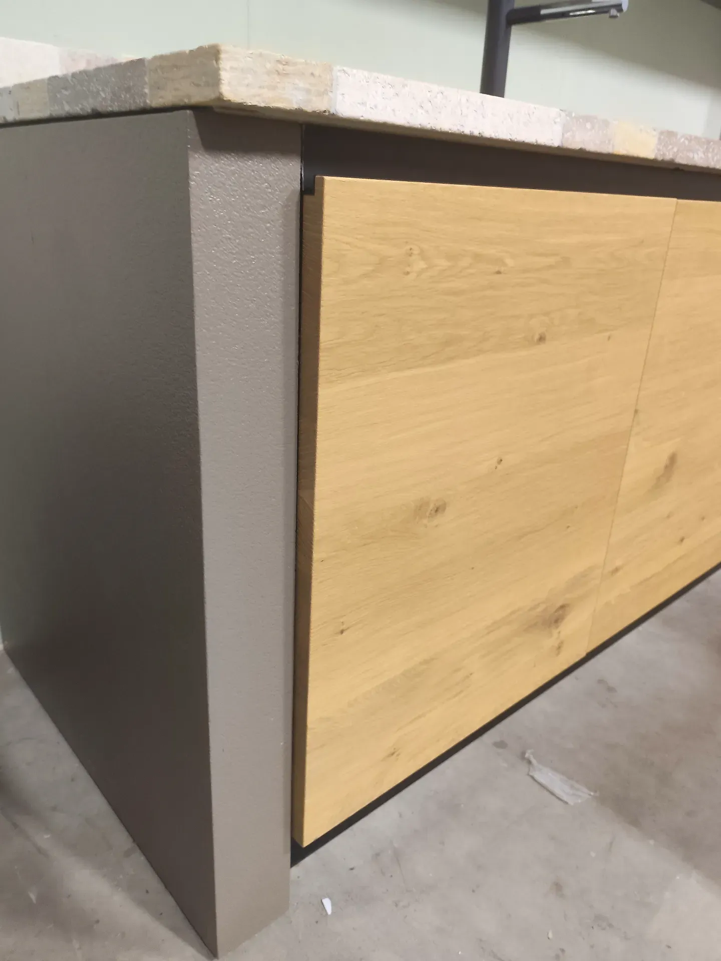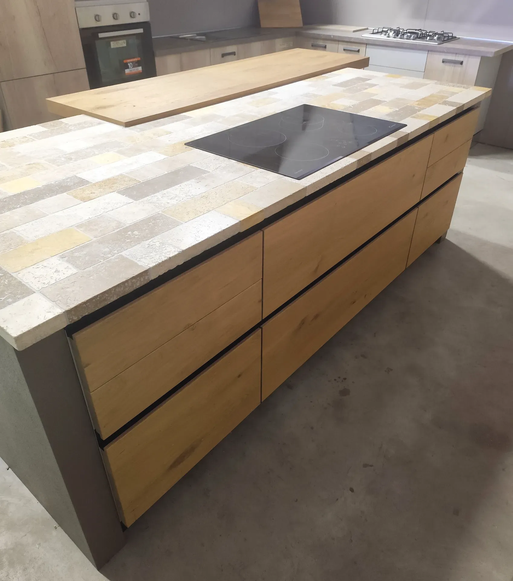 Punto di forza è il PIANO DI LAVORO in sassi del Piave fantasia Travertino, sia per la parte lineare che per l isola. Il piano sporgente di quest ultima invece è impiallacciato in tinta rovere naturale, perfetto come appoggio per mangiare.