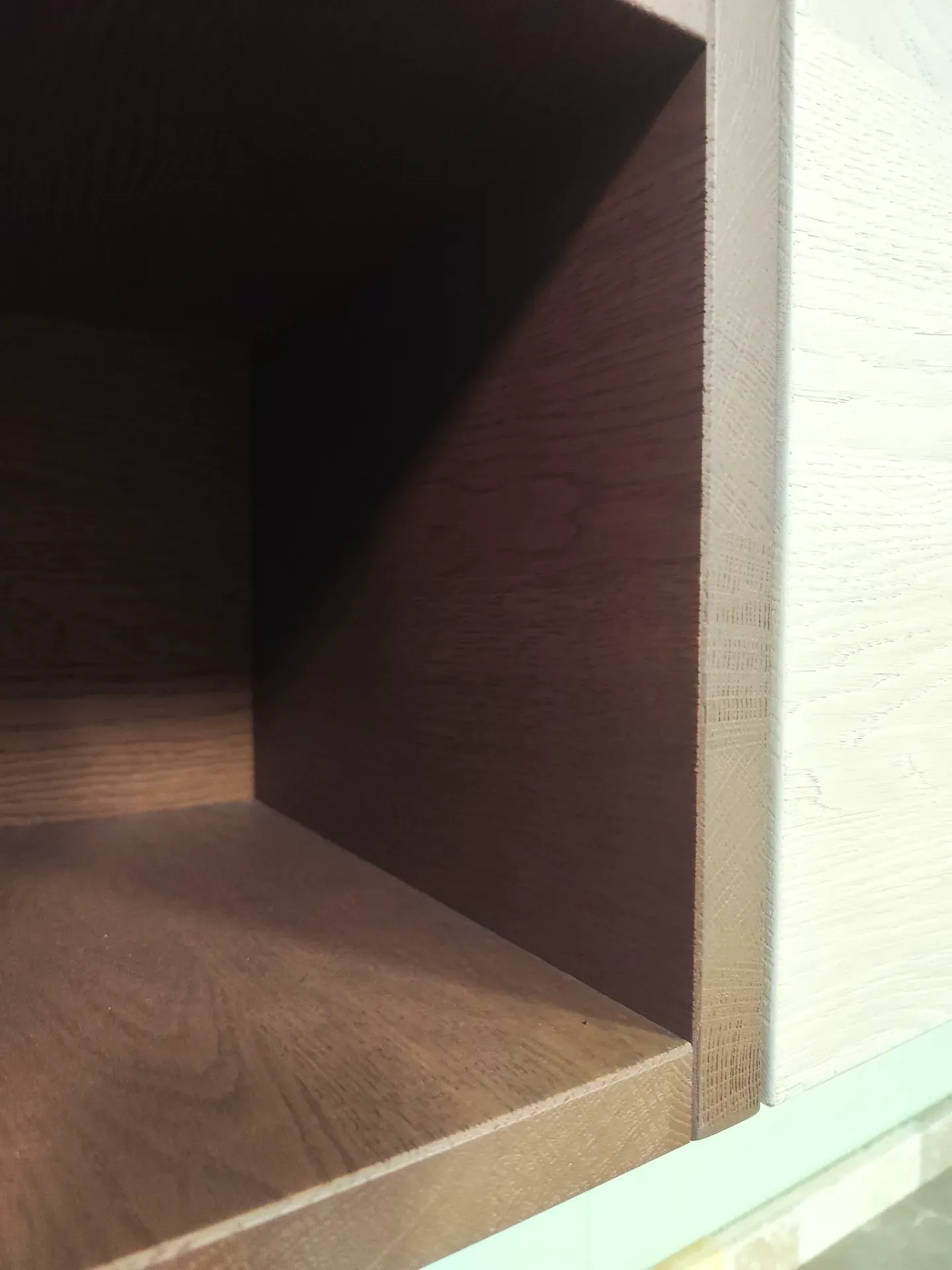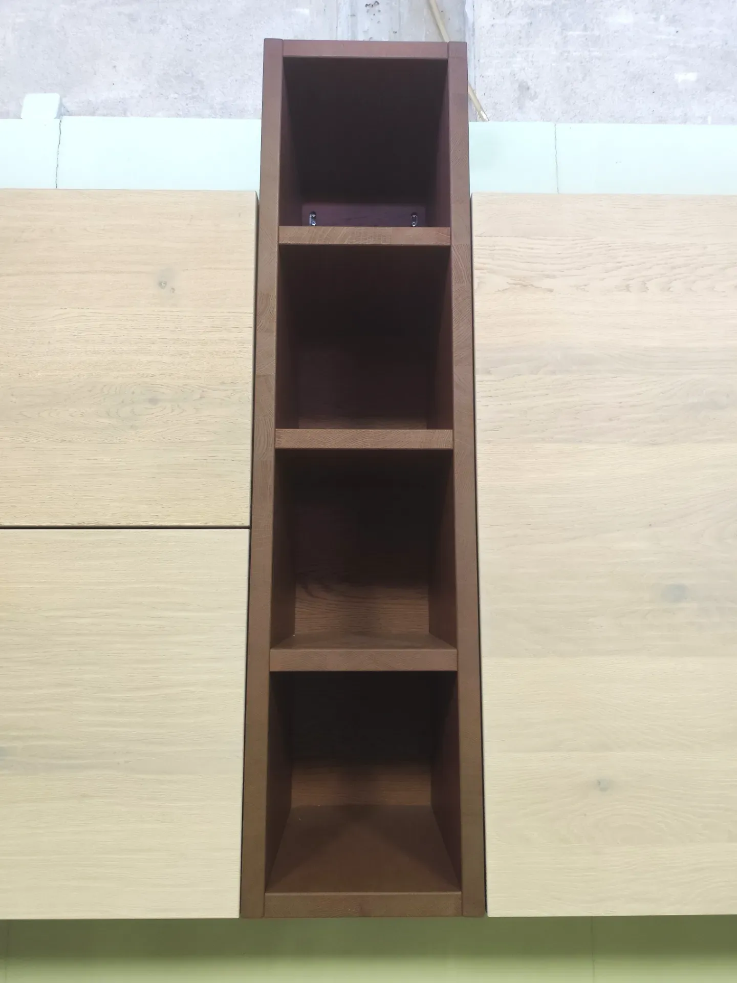 I pensili e le colonne sono in rovere naturale impiallacciati color Cielo, mentre i pensili a giorno sono rispettivamente tinta vinaccia quello scuro e tinta petrolio quello più chiaro.