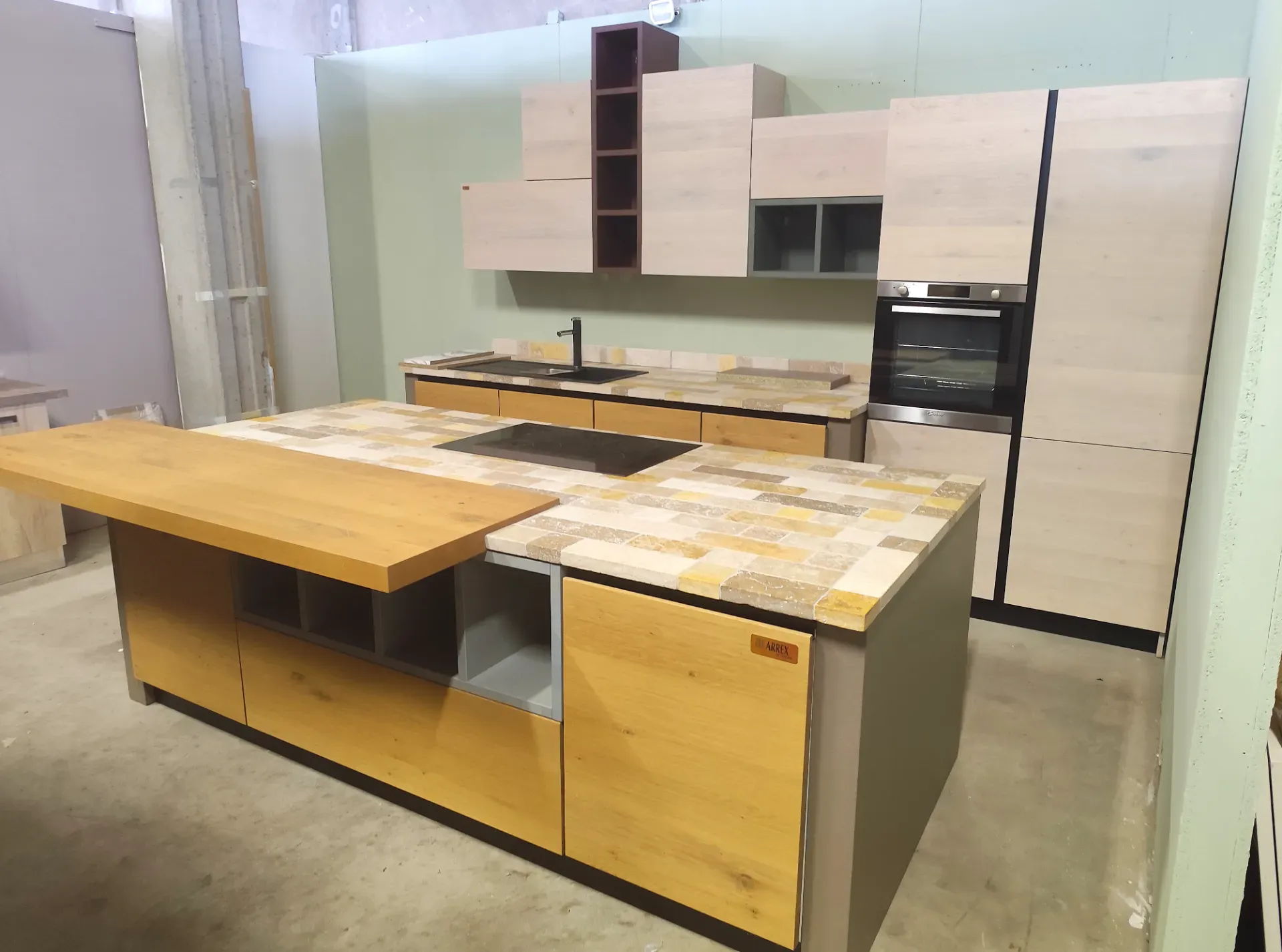 Cucina di mostra con isola centrale unico pezzo modello Zenzero ditta Arrex Le Cucine.