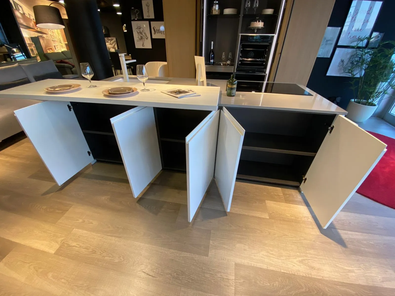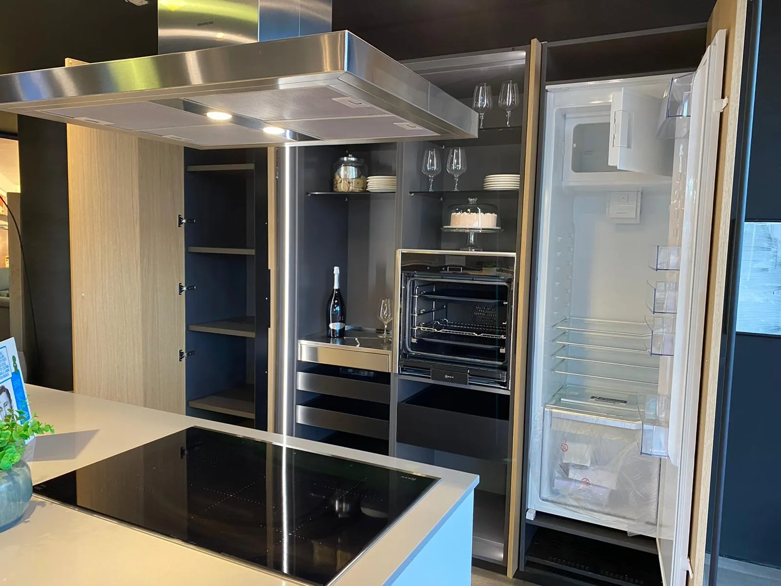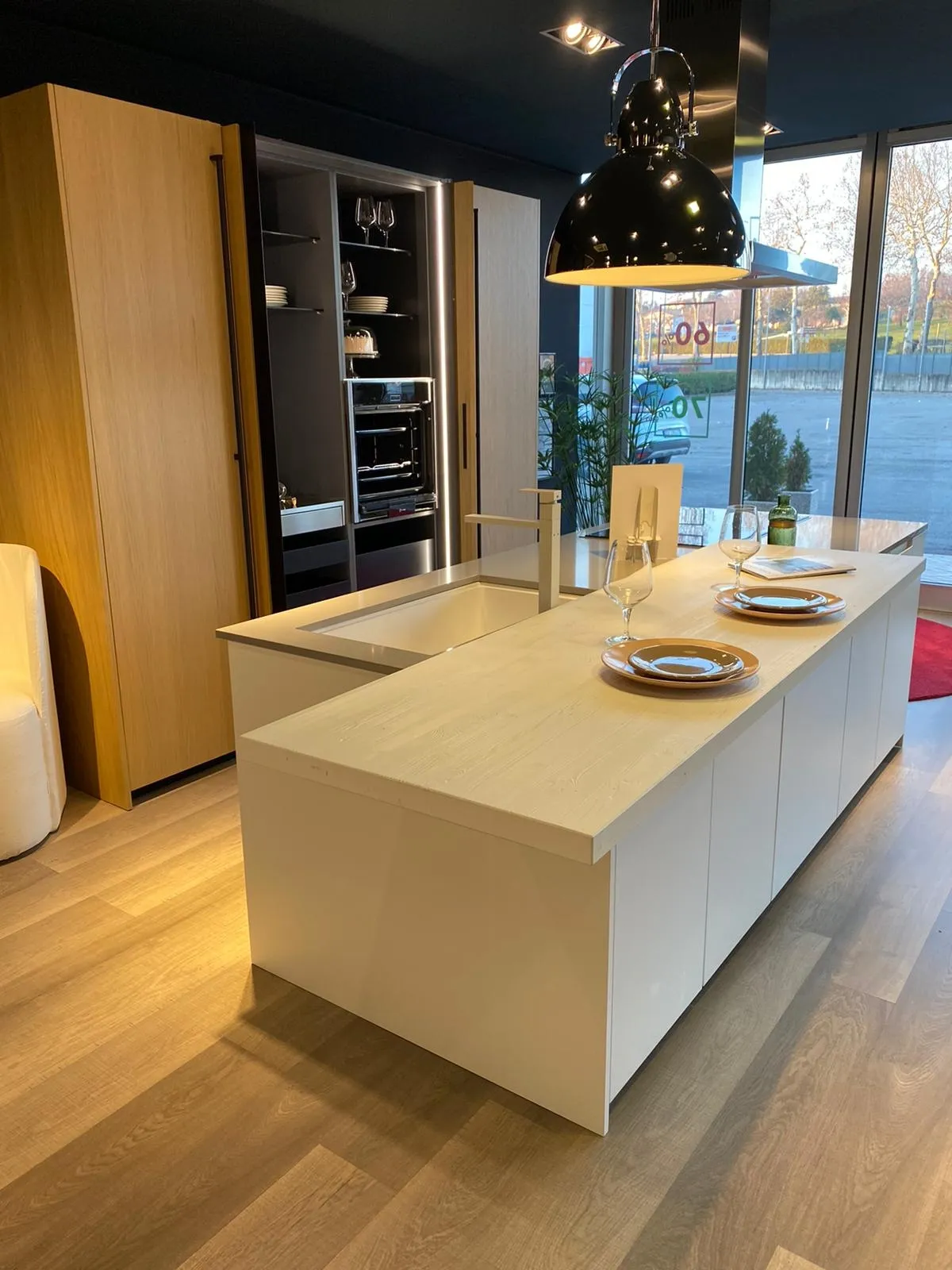 CUCINA CON COLONNE CON ANTA A SCOMPARSA IMPIALLACCIATE ROVERE E RIPIANO ESTRAIBILE IN ACCIAIO ISOLA CONTENITIVA IN ENTRAMBI I LATILACCATA BIANCO GHIACCCIO TOP IN QUARZO SP. 2 FINITURA GRIGIO PERLA LAVELLO FRAGRANITE BIANCO 1 VASCA SOTTOTOP CON MISCELATORE IN TINTA BANCONE SOVRAPPOSTO IN ROVERE LACCATO BIANCO