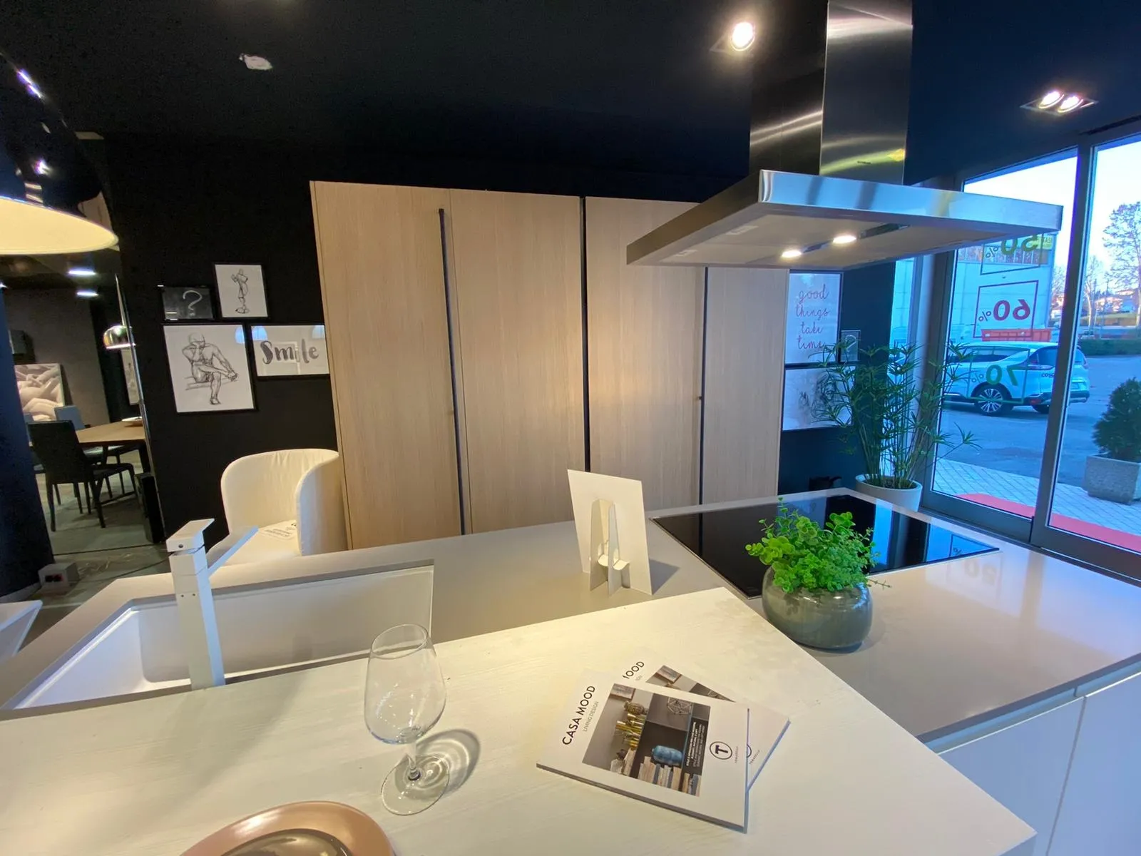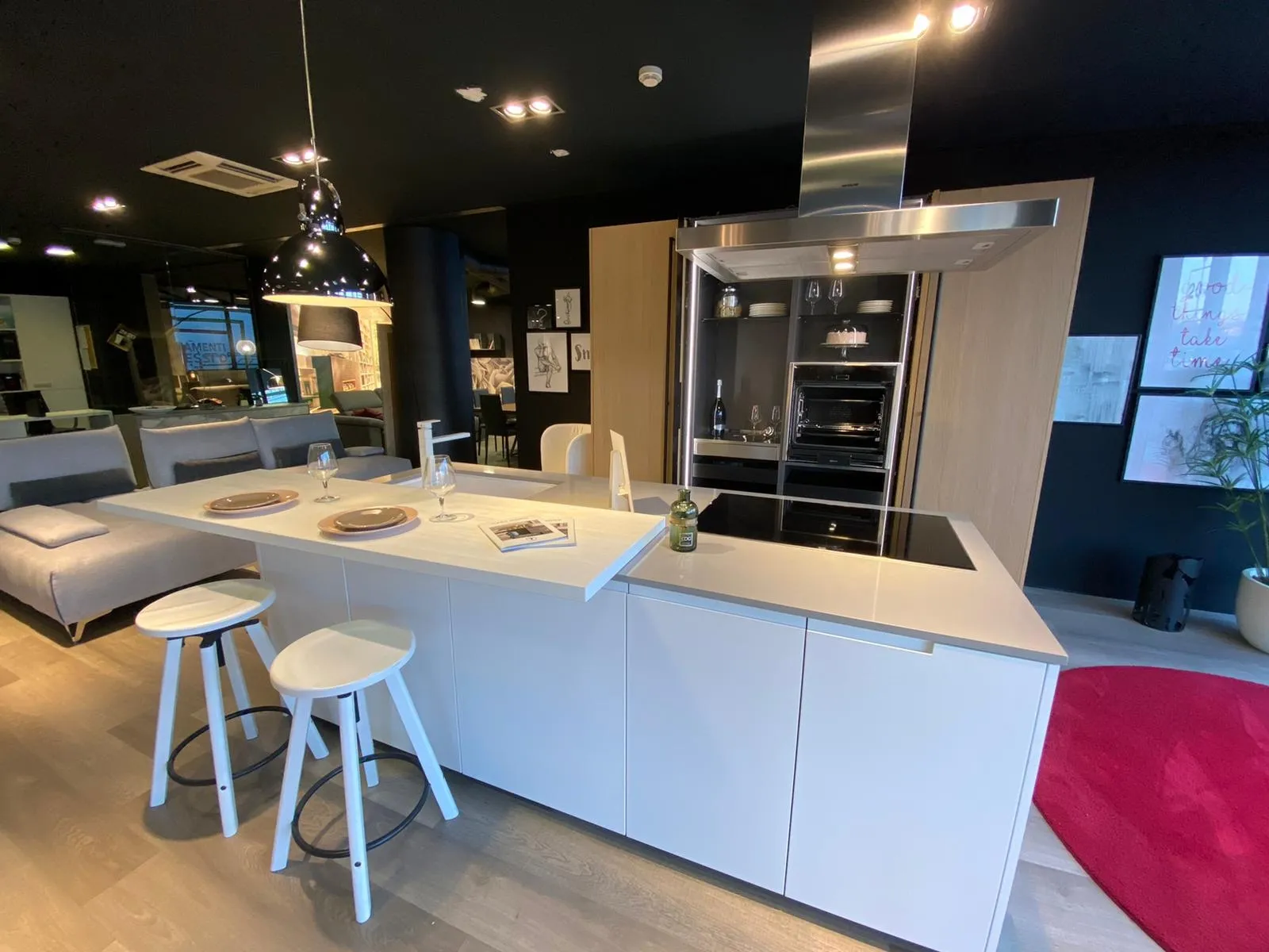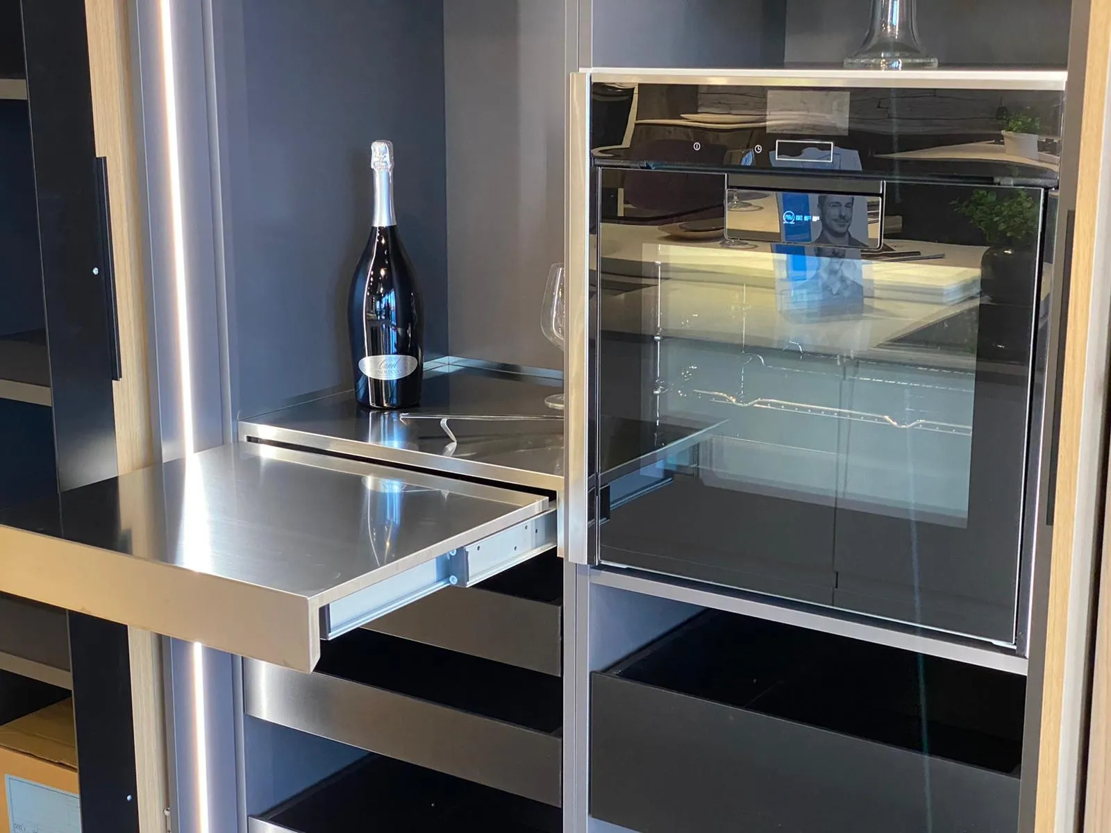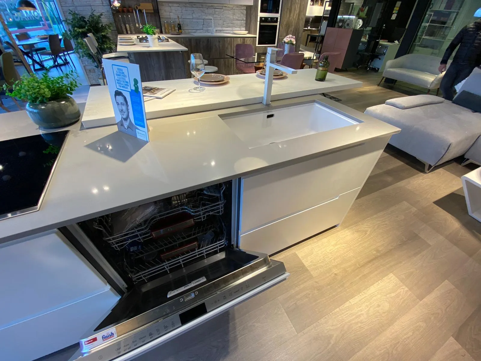 CUCINA CON COLONNE CON ANTA A SCOMPARSA IMPIALLACCIATE ROVERE E RIPIANO ESTRAIBILE IN ACCIAIO ISOLA CONTENITIVA IN ENTRAMBI I LATILACCATA BIANCO GHIACCCIO TOP IN QUARZO SP. 2 FINITURA GRIGIO PERLA LAVELLO FRAGRANITE BIANCO 1 VASCA SOTTOTOP CON MISCELATORE IN TINTA BANCONE SOVRAPPOSTO IN ROVERE LACCATO BIANCO