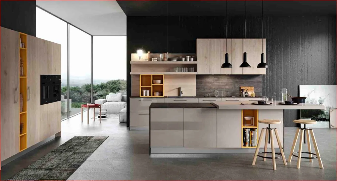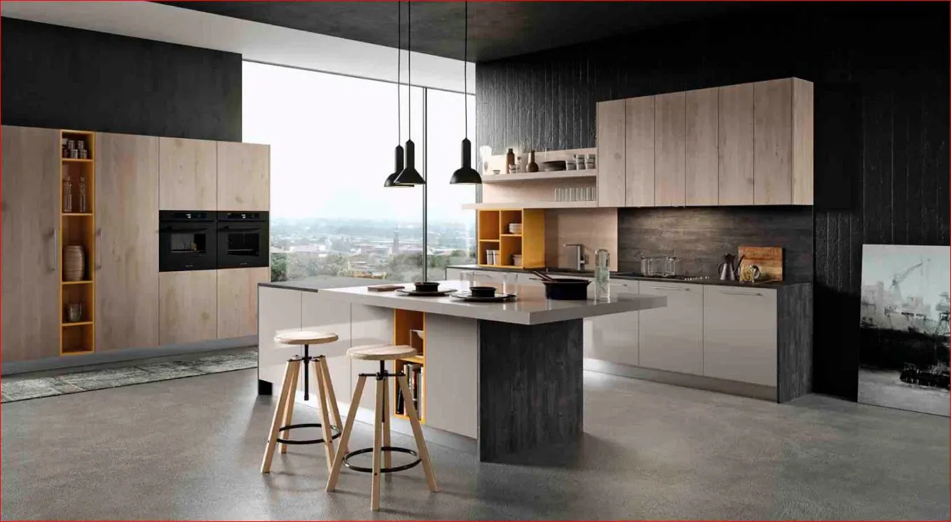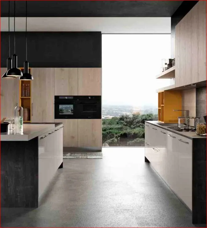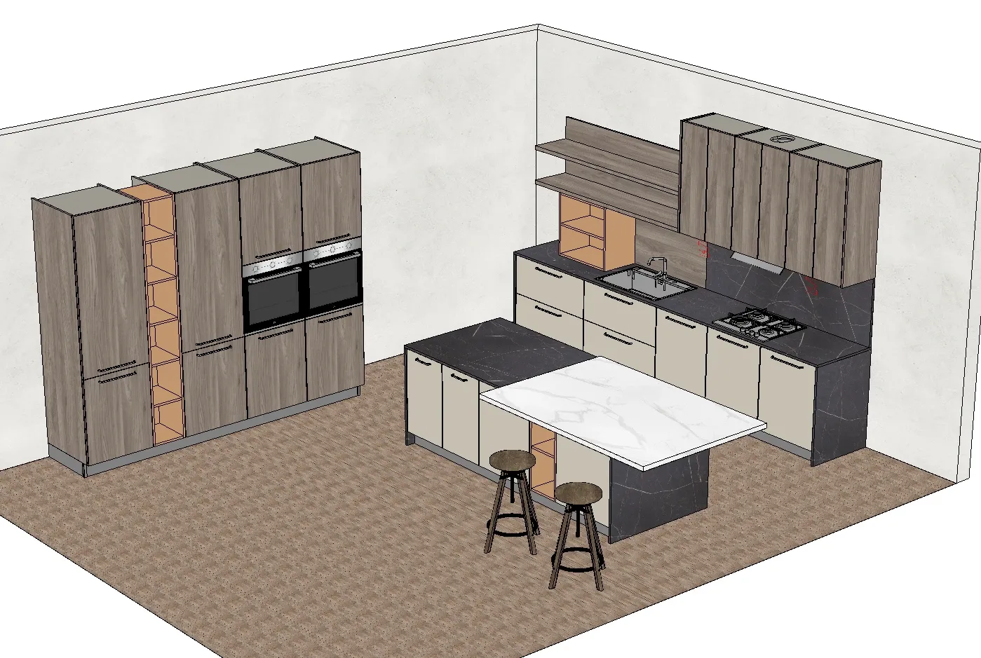 Composizione cucina ROUND 4 su progettazione dove in questo caso spicca la grande isola con piano snack spessore cm.6 a sbalzo, accompagnata da 2 composizioni a parete con vani a giorno laccati opaco - lato colonne in altezza cm. 216 mentre lato pensili in altezza 240 - Top in laminato sp. cm.2 con fianchi terminali e schienale con la stessa finitura. Composizione scontata a Euro 9.300,00 iva e trasporto inclusi ( no isole )