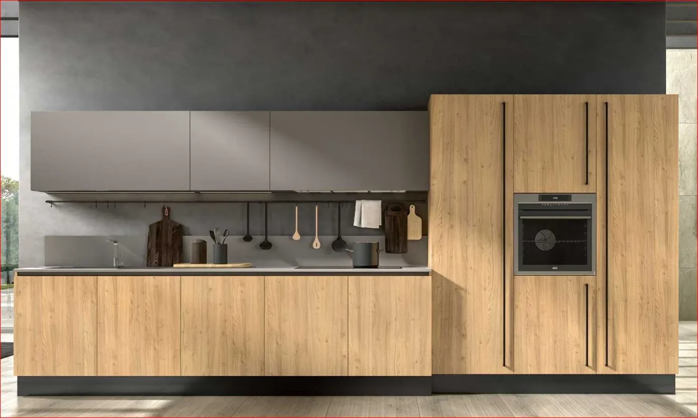 Cucina KALI 10. Questa è la nostra composizione più venduta. Le basi proposte in laminato ROVERE con il piano in prof. cm.70 così da avere un piano di lavoro più comodo e l'apertura con la gola strutturale, si integrano con le colonne con maniglione in metallo a tutta altezza e la colonna forno con apertura Push-pull. Pensili in laminato FENIX in finitura TITANIO con apertura gola e meccanismo Vasistas. Piano in laminato in sp. cm.2 e schienale in altezza cm.30 - Naturalmente tutto è configurabile a vostro piacere come finiture e disposizione in base alle misure della vostra abitazione.