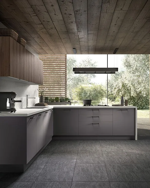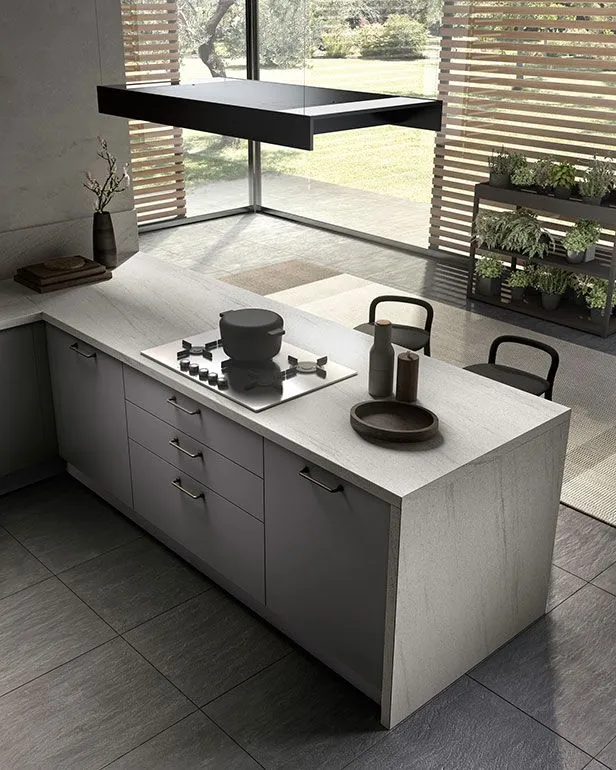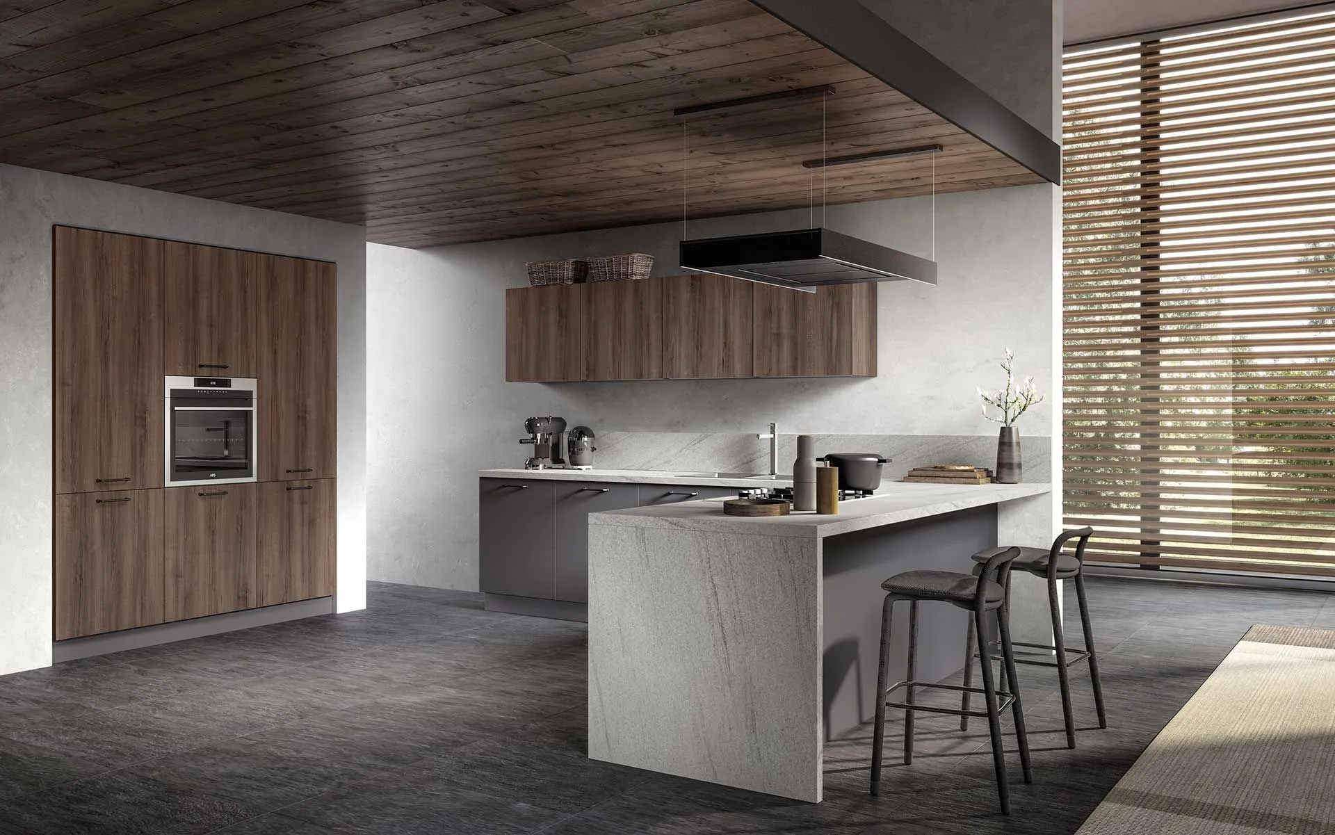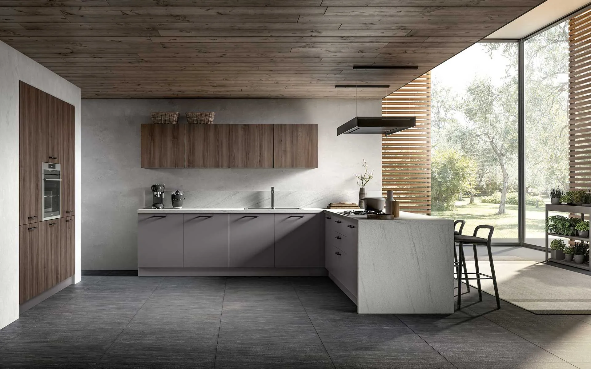 Dalla collezione Arredo 3 Cucine, presentiamo cucina moderna con basi in melaminico grafite, pensili e colone in melaminico rovere cotto, Top lamcolor , maniglia MA376 grigio ferro e zoccoli finitura piombo. Nuova cappa sospesa Light, acciaio e alluminio in finitura nera, dotata di pulsantiera elettronica e telecomando. Meccanismi angolo Combi's, assolutamente funzionali ed esteticamente raffinati offrono il massimo della praticità. Basi e colonne melaminico Grafite, pensili ed elementi a giorno melaminico , piani top lamcolor Vulcano pietra e tavolo laminato Rovere chiaro C003. Ante con nuova maniglia C integrata in finitura piombo. Il lato penisola della cucina può essere integrato sul lato sinistro, come la colonna forno. Disponibile nelle diverse finiture. Dispone di elettrodomestici marchiati Hotpoint; Forno multifunzione con display, frigo congelatore, lavastoviglie, piano a gas inox cinque fuochi, lavello, cappa Falmec integrata. Lunghezza cucina 330 cm, Larghezza penisola 277cm, Larghezza colonna forno 180cm. La consegna è compresa nel prezzo in tutto il territorio nazionale ( escluso isole ), 40-50 giorni lavorativi. L'offerta per la cucina CLOE 3 è di euro 7.900,00. Approfitta dello sconto e contattaci via mail! Oppure passa a trovarci nel nostro showroom.