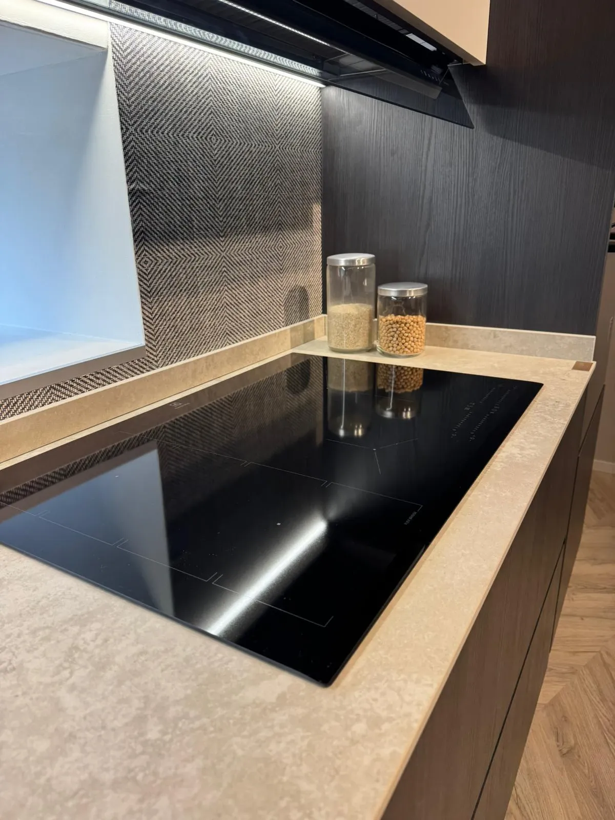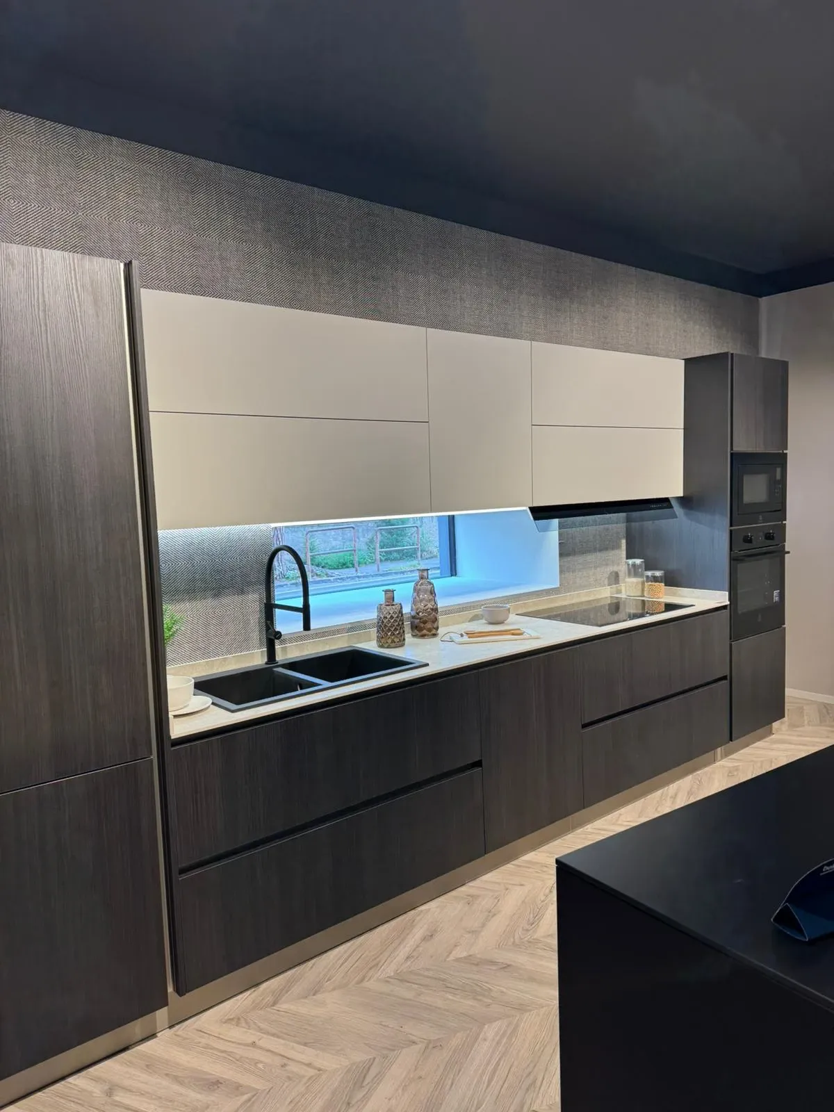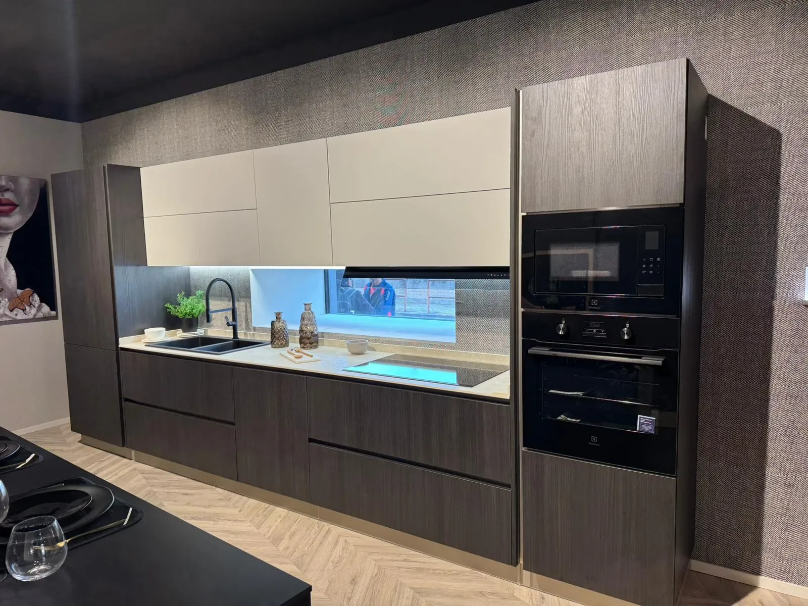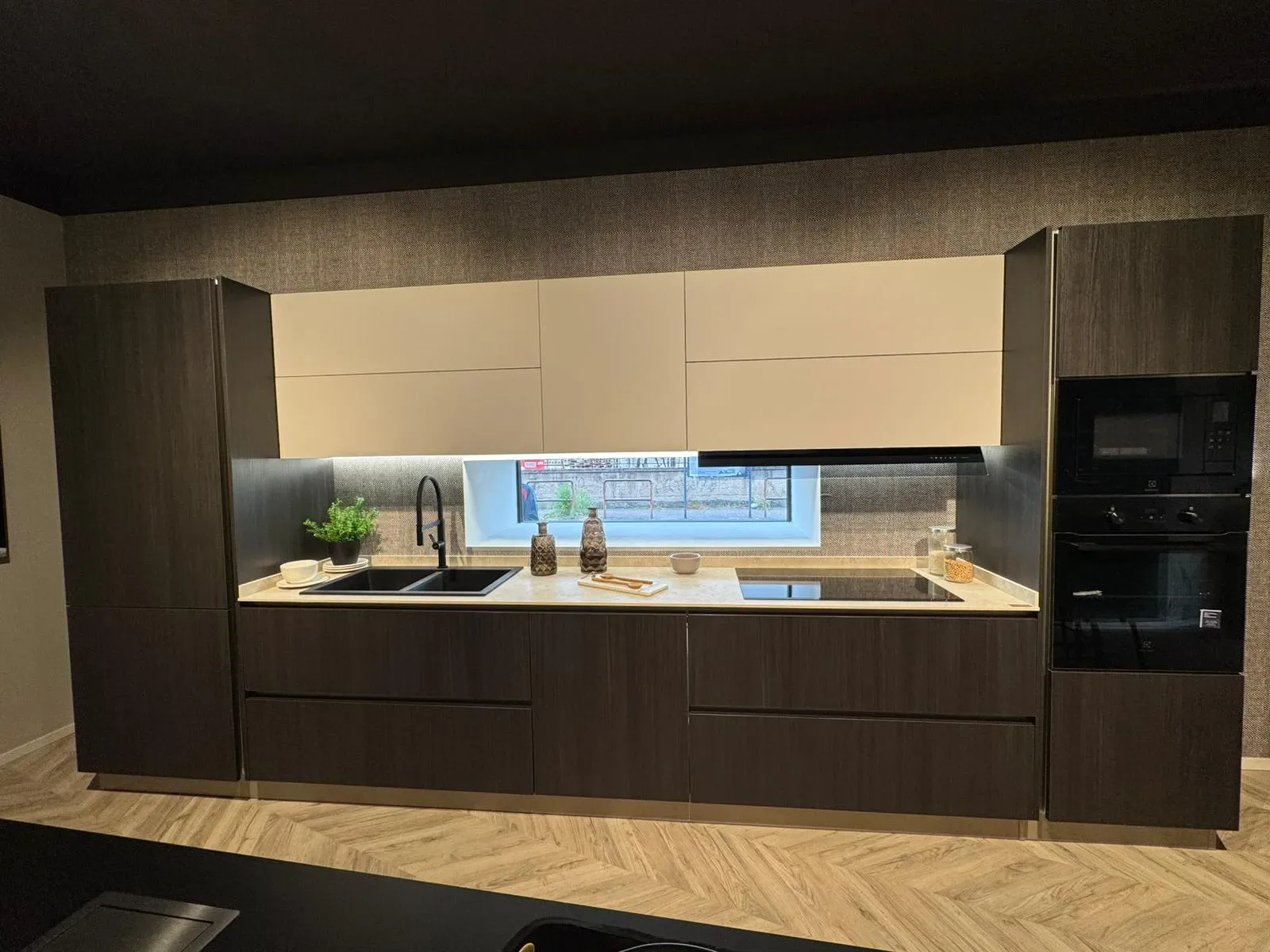 La cucina Young rovere moro Stosa scontata è perfetta per stanze di ogni richiamo stilistico e misura.