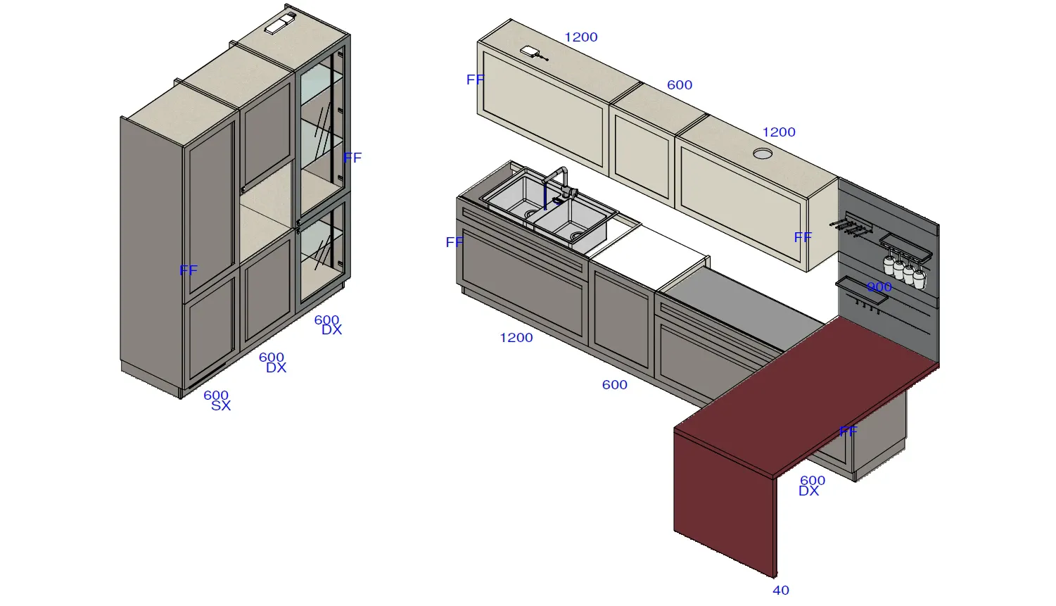 Questa proposta è con penisola, ma al fine di offrire composizioni arredative ideali per le necessità individuali saremo in grado di offrirti ulteriori configurazioni.