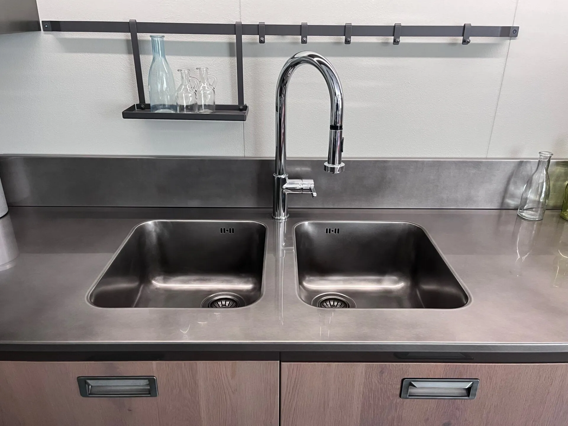 Zona lavaggio con 2 vasche in acciaio integrate nel top