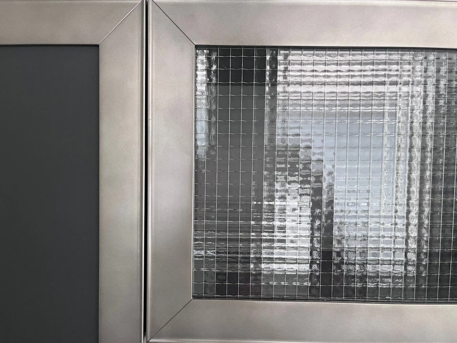 Pensili con telaio laccato Drip Metal, pannello lavagna e vetro retinato