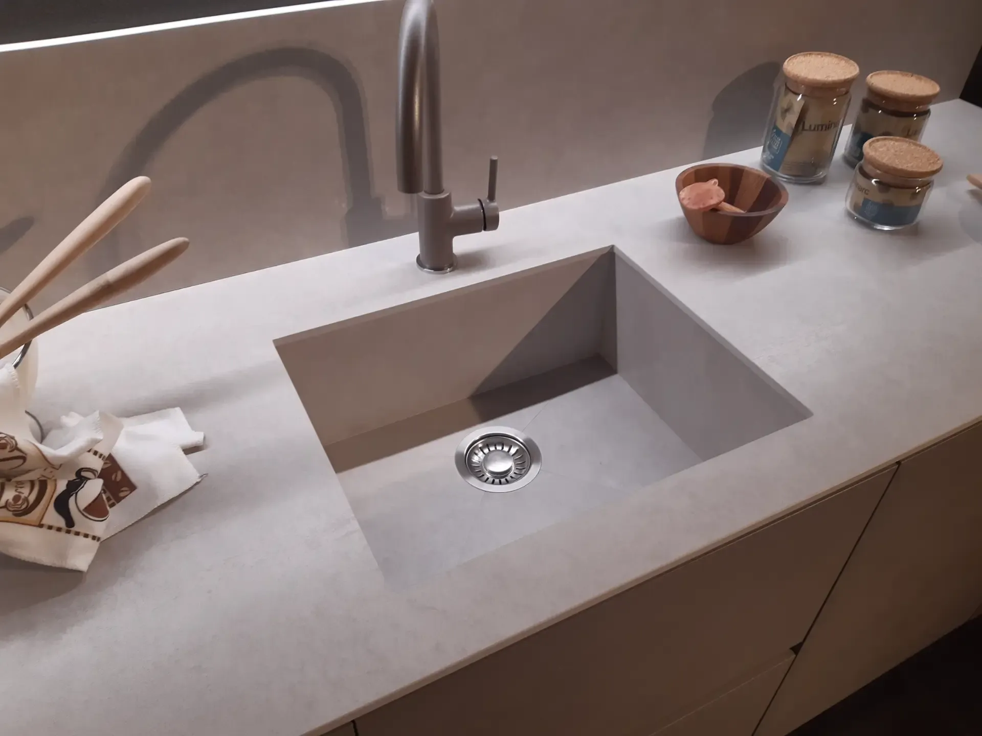 Il top e gli schienali sono in Gres Laminam realizzati ad angolo con il lavello ad una vasca realizzata sempre in Laminam e fissata sottotop: materiale resistentissimo e soprattutto anticalore.