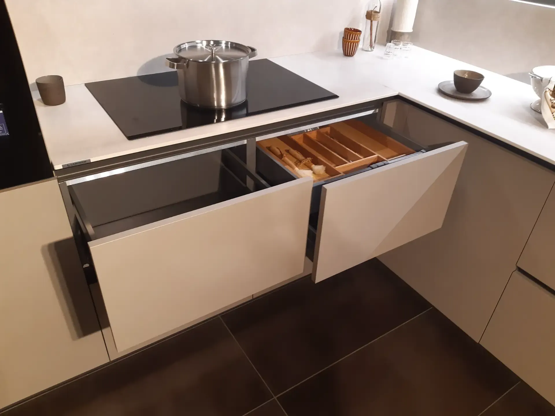 Nel pensile sopra il piano cottura è inserita la cappa Falmec modello Virgola NoDrop, specifica anticondensa, indispensabile per i piani cottura ad induzione.
