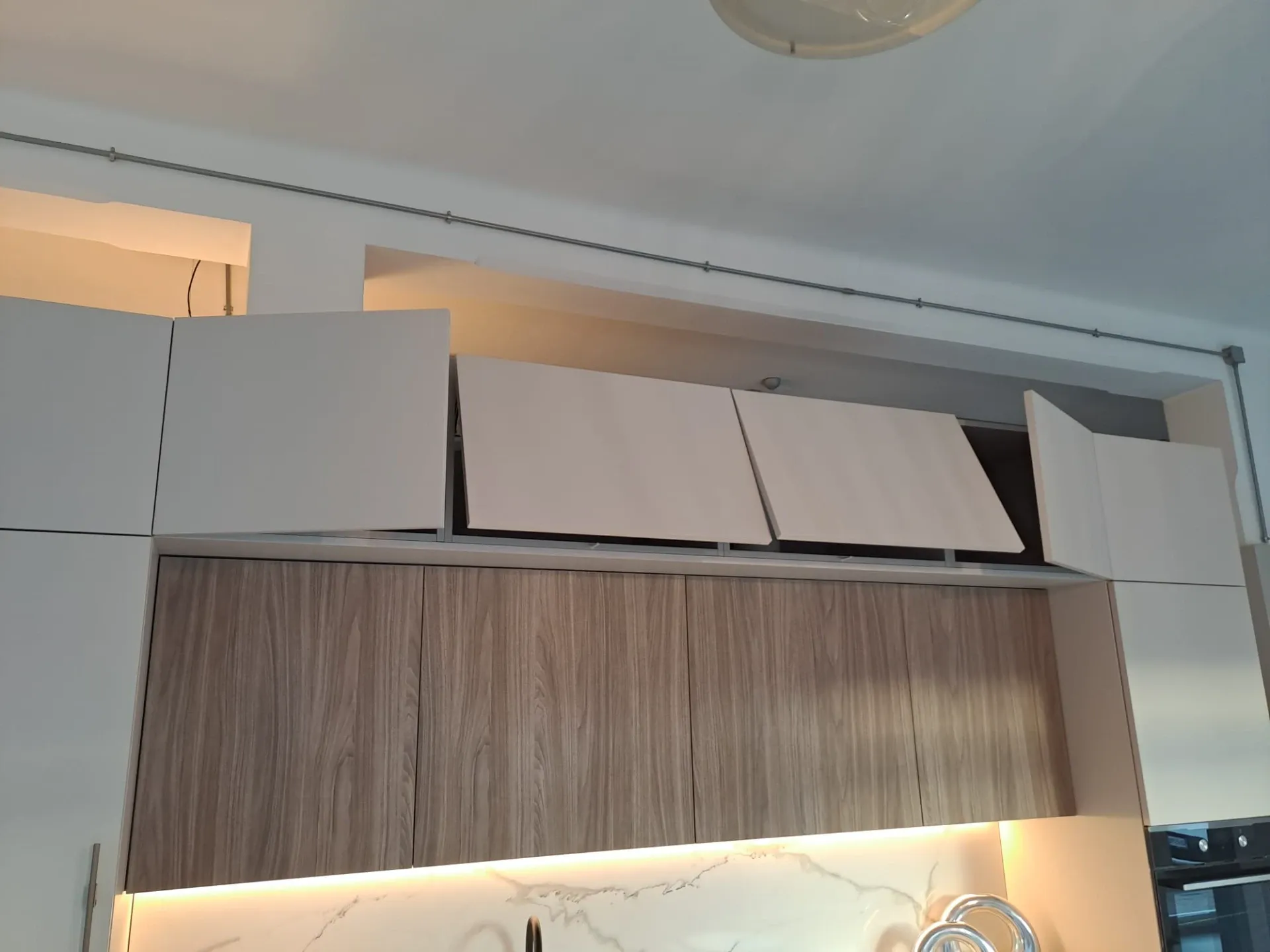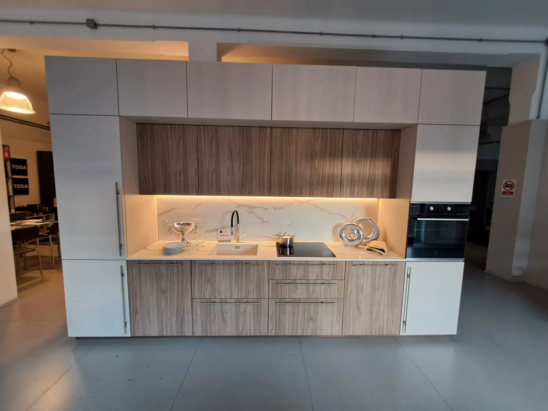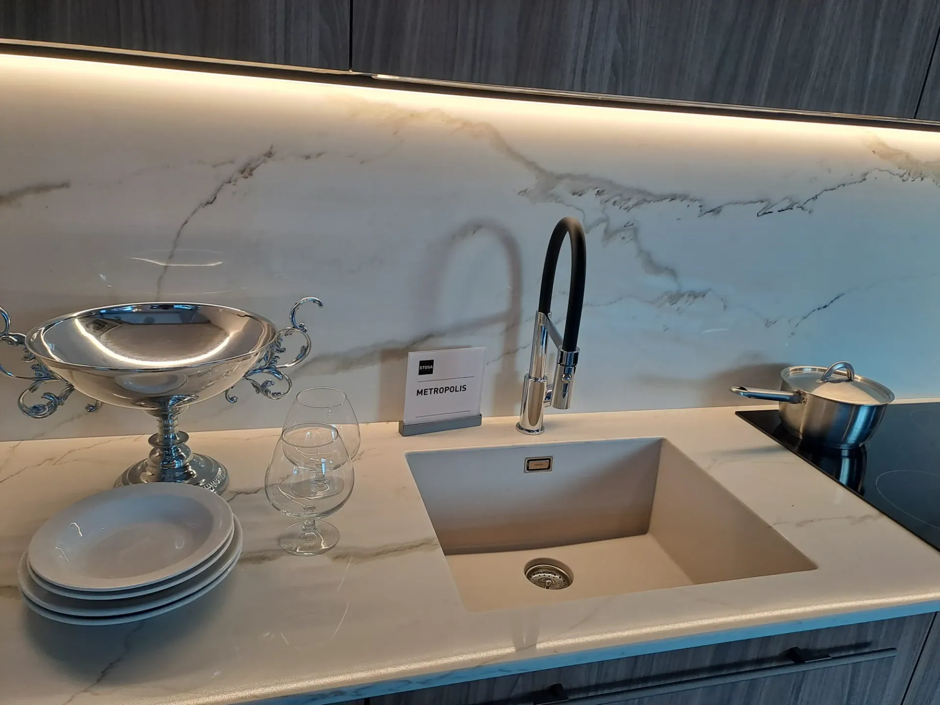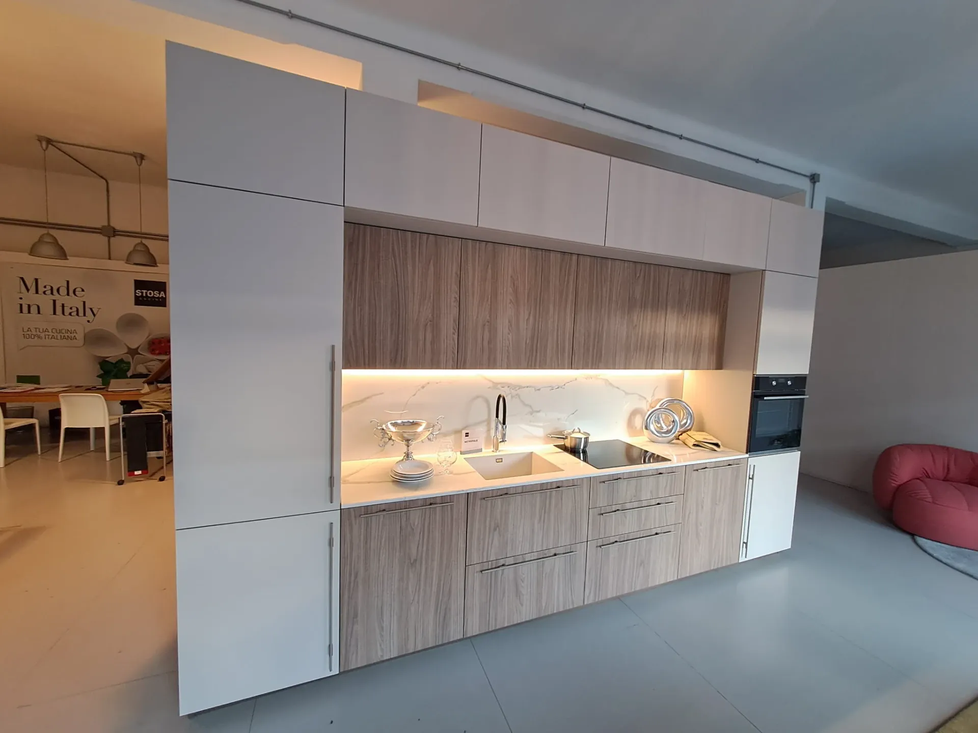 Cucina Stosa mod. Metropolis in laminato pet beige seta opaco e laminato eucalipto, apertura mediante maniglie color bronzo .Elementi caratterizzanti: portale superiore h 48 profondità cm 60 ,top e schienale in quarzo Calacatta Oro sp 20 mm con lavello in fragranite integrato nel piano,zoccoli color bronzo alti cm 8 . Cucin attrezzata con : pattumiere e portadetersivi nel cestone sottolavello, portaposate da cm 75 .luce sottopensile ,cappa anticondensa particolarmente adatta per il piano cottura ad induzione.Frigo Electrolux con tecnologia low frost, altezza maggiorata :capienza lt 290
