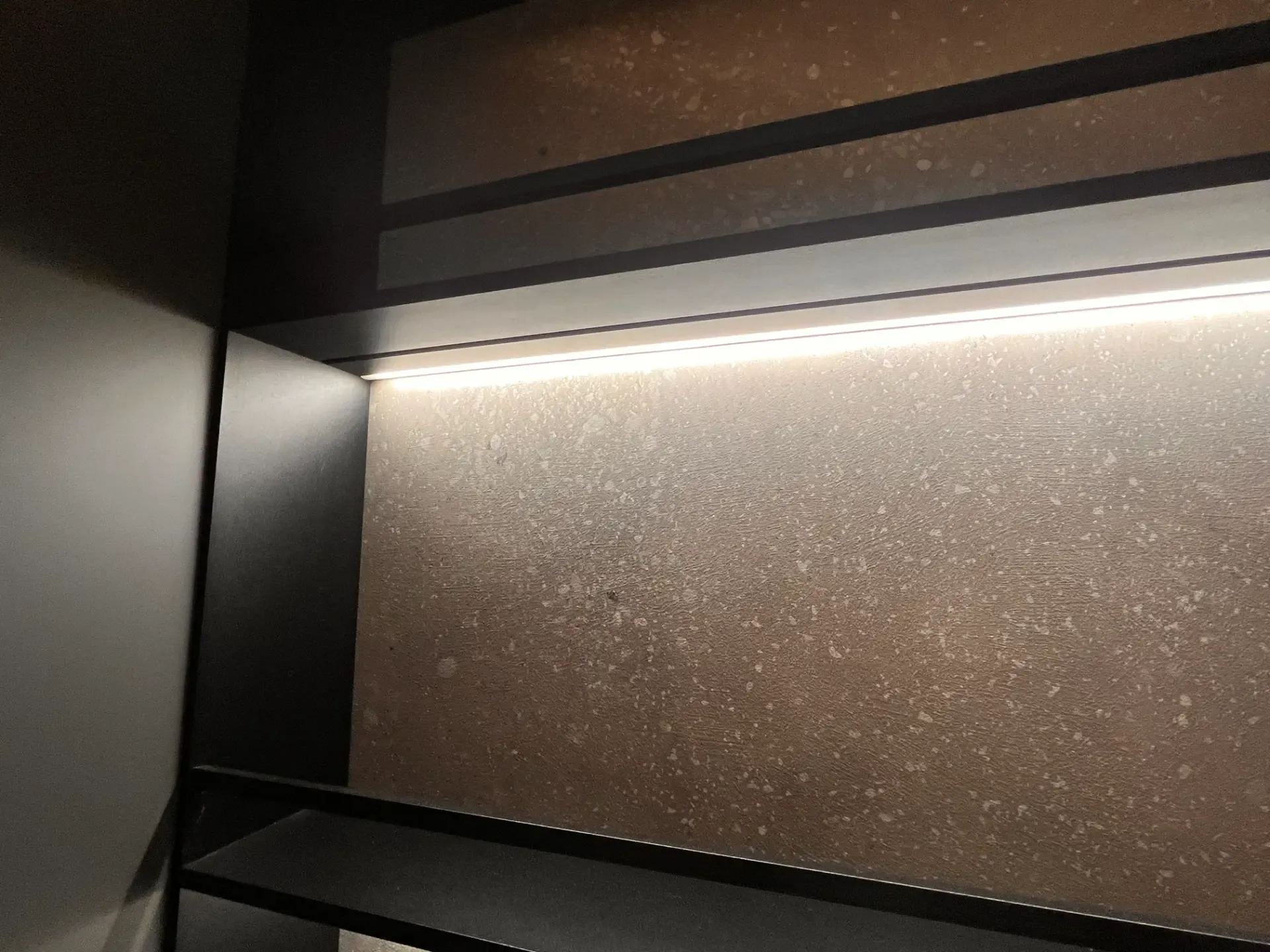 L'elemento a giorno in metallo con luci integrate non solo illumina l'ambiente ma aggiunge anche un tocco di modernità alla cucina. La presenza di illuminazione LED garantisce una visibilità ottimale durante la preparazione dei pasti, creando al contempo un'atmosfera accogliente.