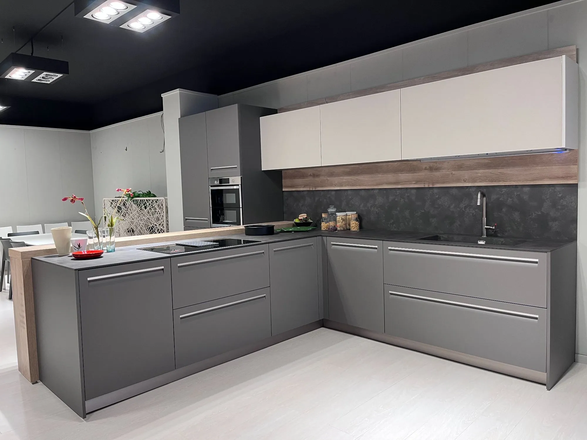 Cucina mod. Tekna con penisola, in finitura laminato lavagna matt c/maniglia 1029. Comprensivo di n.2 colonne per forni e frigorifero combinato e n.3 pensili mod. Glass in finitura nebbia opaco 1119 con led. Piano snack e boiserie in finitura quercia Light. Zoccolo in finitura metal26 H10. PACCHETTO ELETTRODOMESTICI FORMATO DA : Lavello x fondo 74 Maxfel finitura 810 Miscelatore 60203#149 Gessi inox/red officine v Lavastoviglie DW60M5070IB Samsung Forno NV75N5641RS Samsung 60 dual cook flex Frigorifero BRB26705FWW sx Samsung Piano cottura Nikolatesla Prima BL/F/83 Elica filtrant TOTALE PACCHETTO ELETTRODOMESTICI SCONTATO € 4.114,00