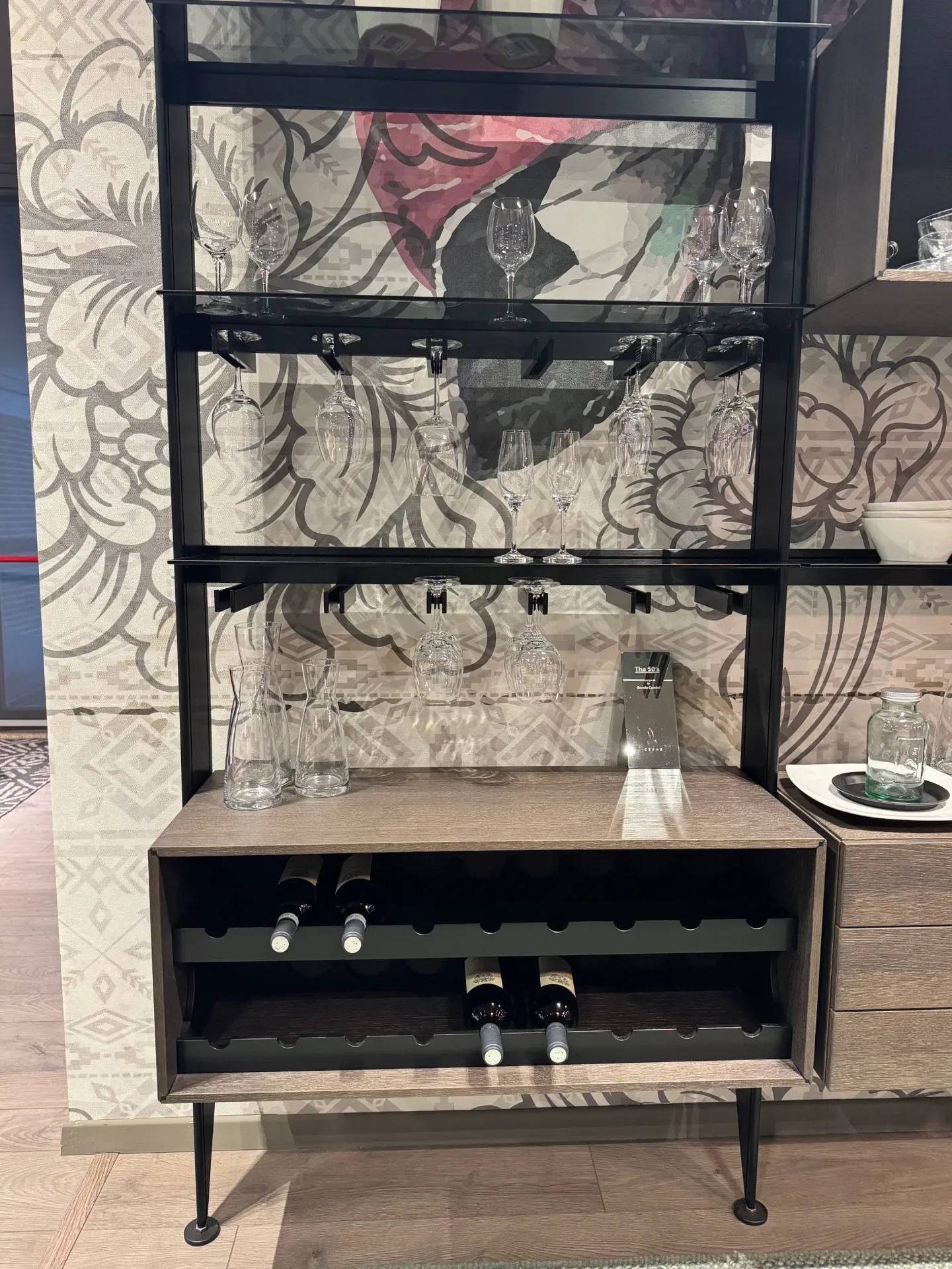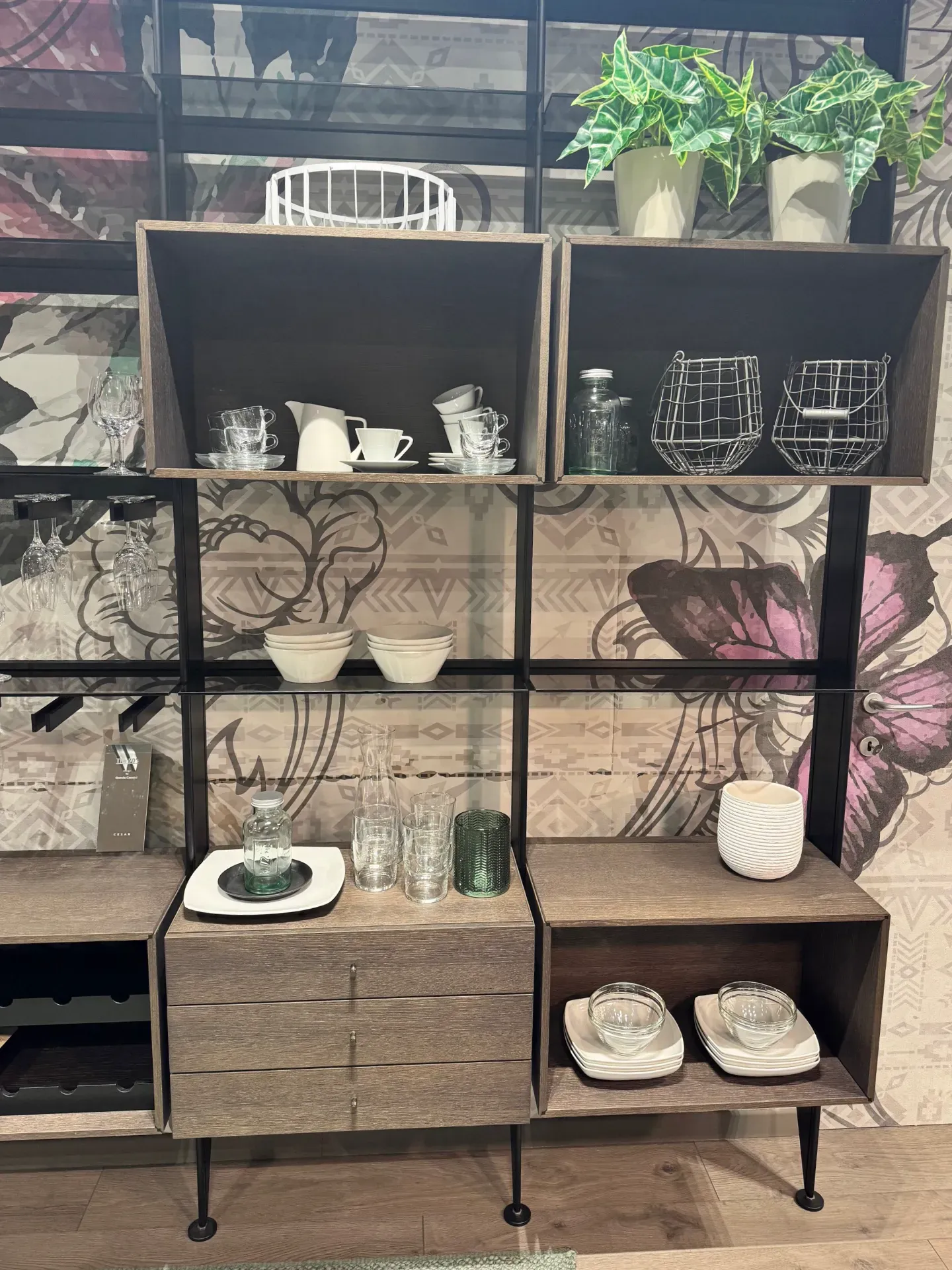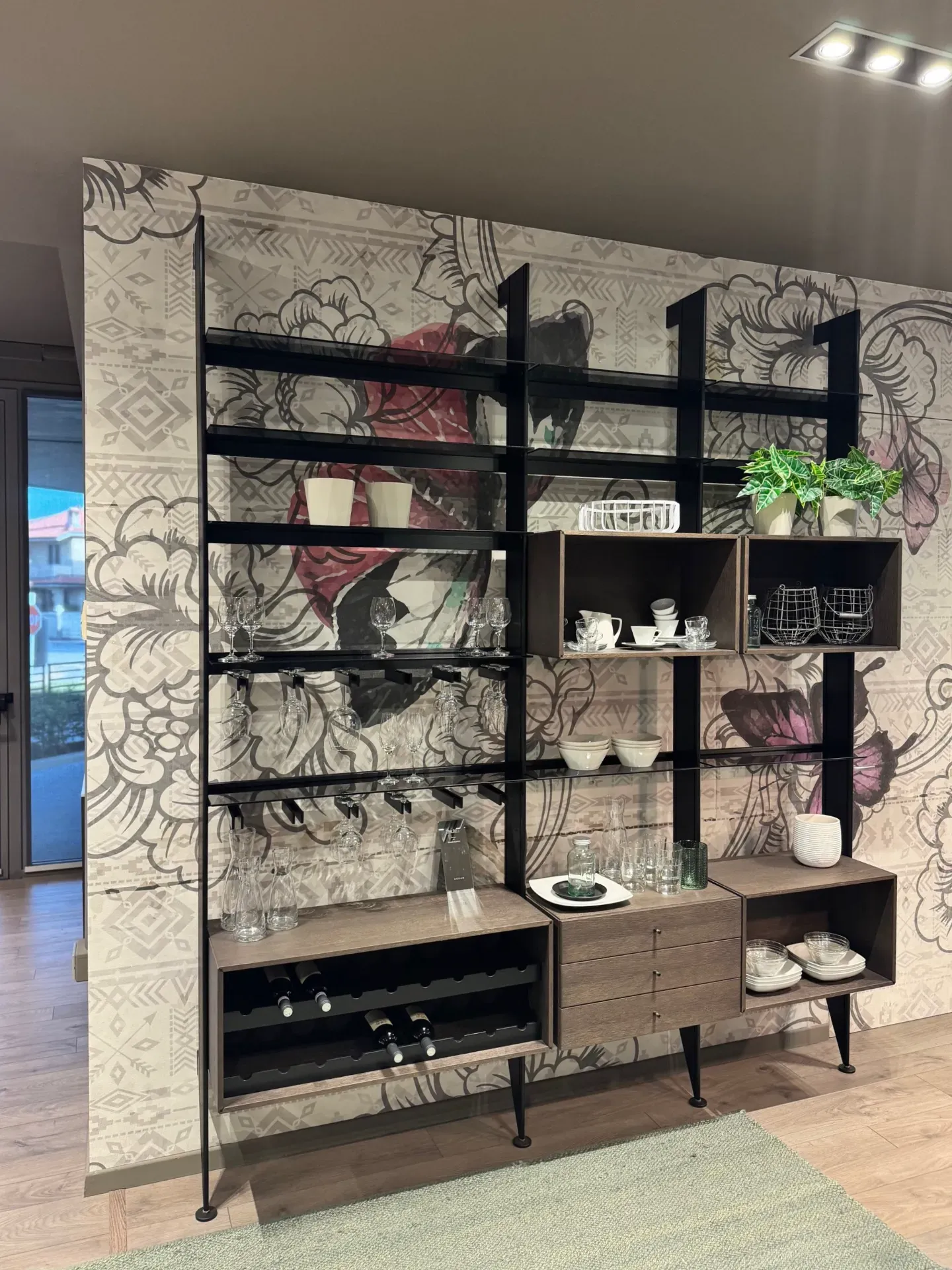 The 50's reinterpreta in chiave contemporanea i sistemi di contenimento degli anni cinquanta, arricchendosi però di nuove funzioni. Il sistema può essere attrezzato per la cucina, per il living o per entrambe le funzioni. The 50's di Cesar è caratterizzata dai dei montati a parete in estruso di alluminio anodizzato nero, sui quali vengono agganciate mensole in vetro, mensole con portacalici, contenitori a giorno e portabottiglie in essenza rovere fossile e una cassettiera tre cassetti in essenza rovere fossile. Il montante a parete, versatile ed elegante, termina con un piedino in finitura nero opaco. La 50's è composta da un modulo di larghezza 90 e da due moduli di larghezza 60 centimetri. Dimensioni composizione: larghezza 218,5, profondità 42,5, altezza 260 centimetri. The 50's di Cesar la trovate in offerta a 7.560,00 euro. Potrete vedere la composizione nella nostra esposizione a Giussano, vicino a Milano. Per maggiori informazioni non esitate a contattarci.