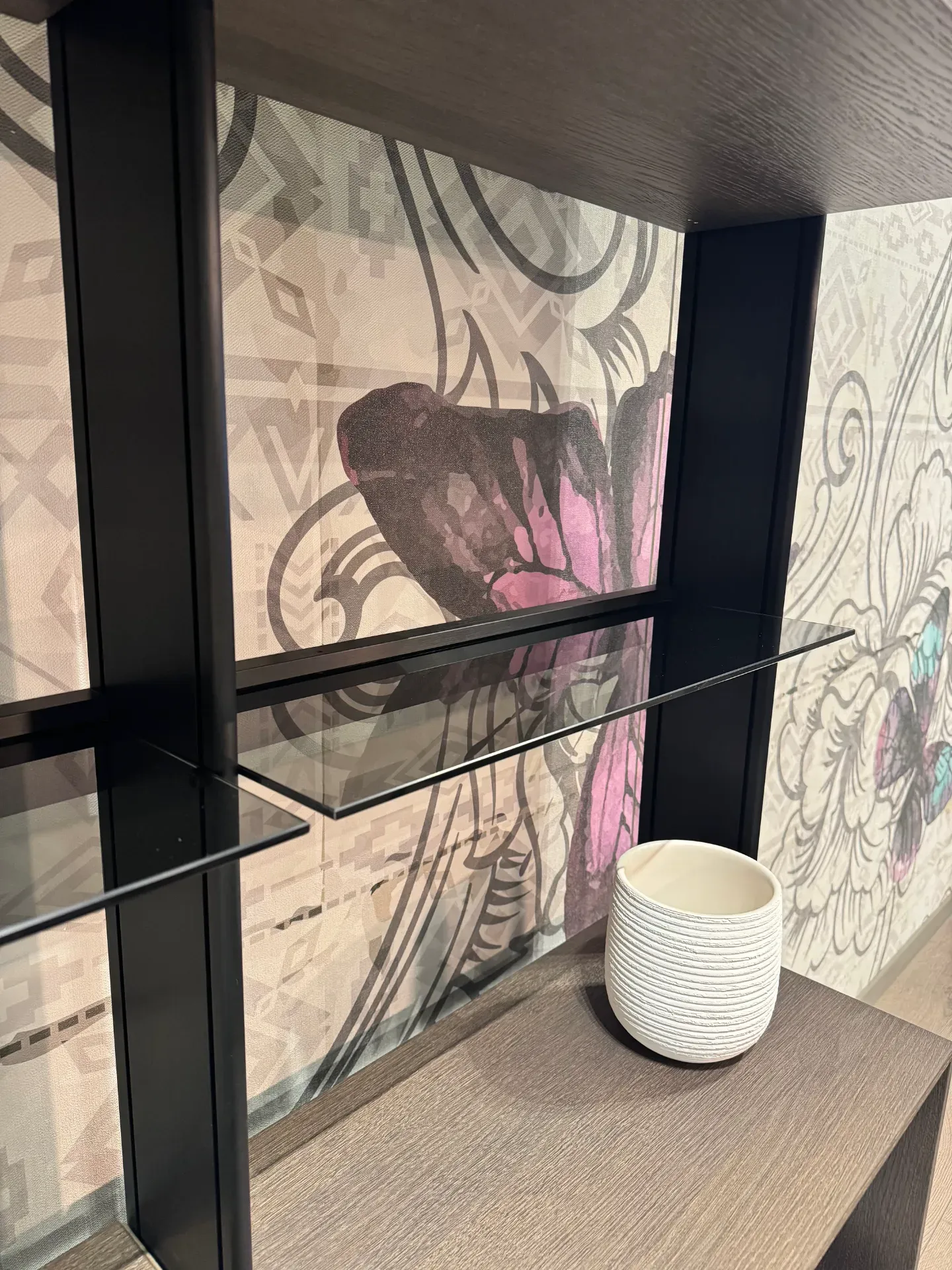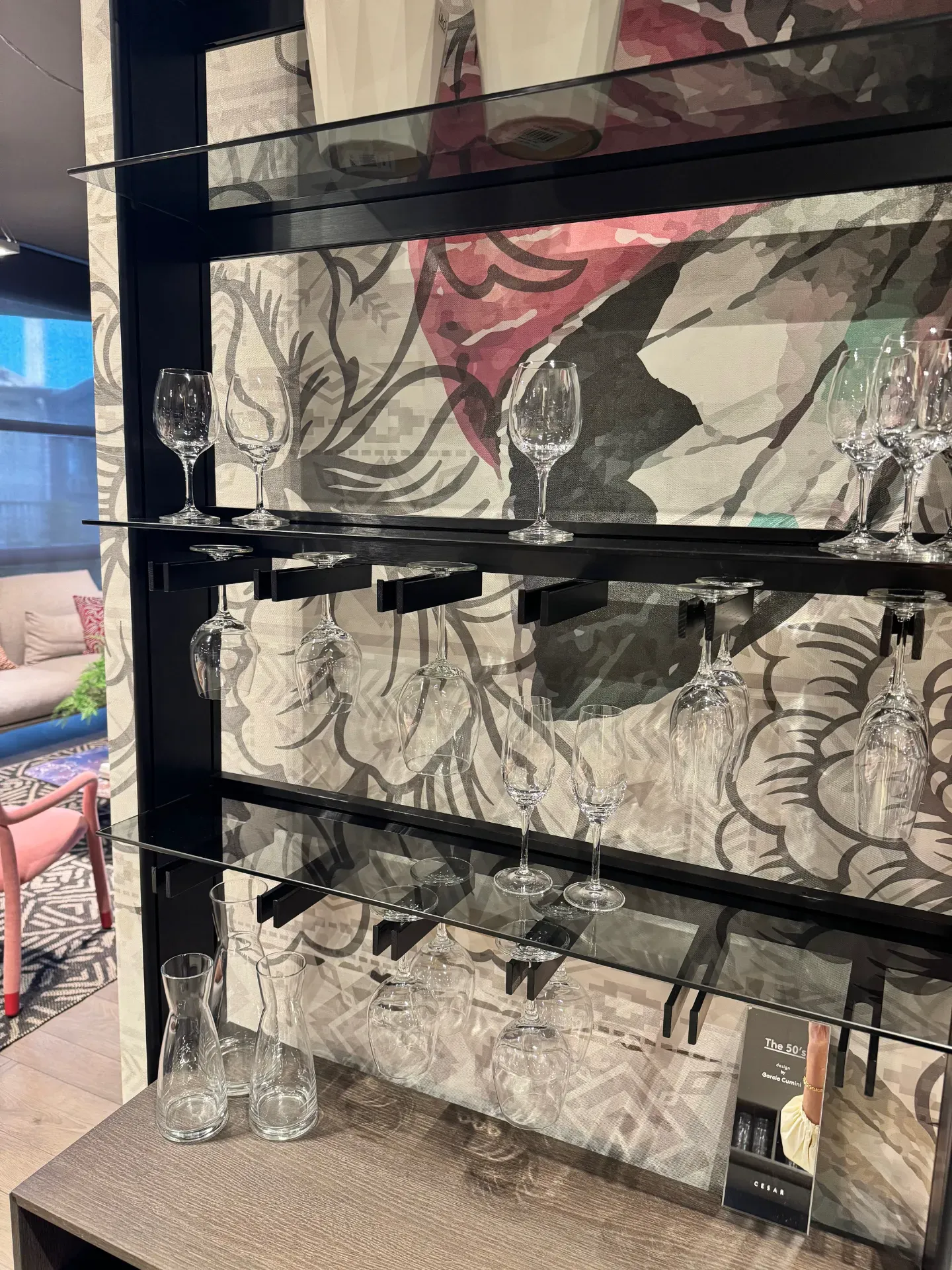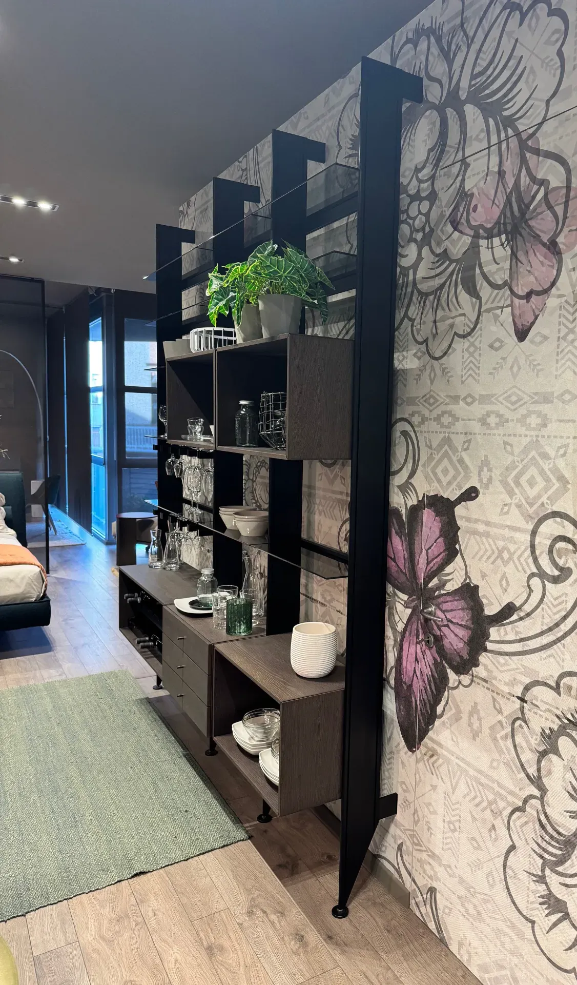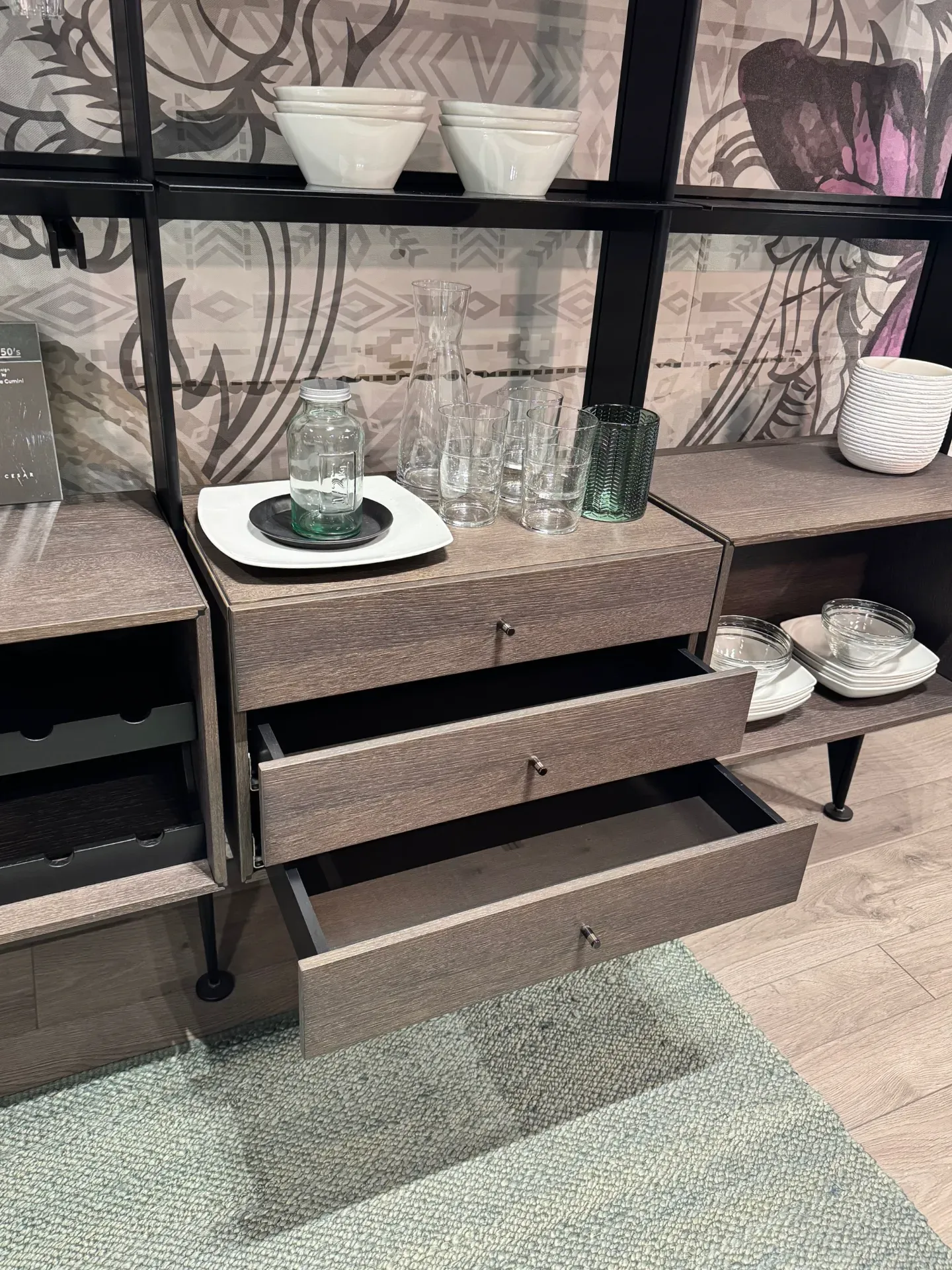 The 50's reinterpreta in chiave contemporanea i sistemi di contenimento degli anni cinquanta, arricchendosi però di nuove funzioni. Il sistema può essere attrezzato per la cucina, per il living o per entrambe le funzioni. The 50's di Cesar è caratterizzata dai dei montati a parete in estruso di alluminio anodizzato nero, sui quali vengono agganciate mensole in vetro, mensole con portacalici, contenitori a giorno e portabottiglie in essenza rovere fossile e una cassettiera tre cassetti in essenza rovere fossile. Il montante a parete, versatile ed elegante, termina con un piedino in finitura nero opaco. La 50's è composta da un modulo di larghezza 90 e da due moduli di larghezza 60 centimetri. Dimensioni composizione: larghezza 218,5, profondità 42,5, altezza 260 centimetri. The 50's di Cesar la trovate in offerta a 7.560,00 euro. Potrete vedere la composizione nella nostra esposizione a Giussano, vicino a Milano. Per maggiori informazioni non esitate a contattarci.