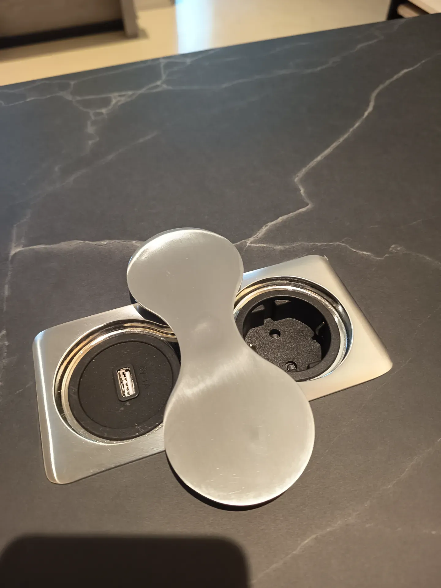 Composizione cucina Arredo 3 modello Time con isola centrale, completa di elettrodomestici, zona boiserie con mensole in metallo, persa USB e normale inserita nel piano, due sgabelli compresi nel costo.