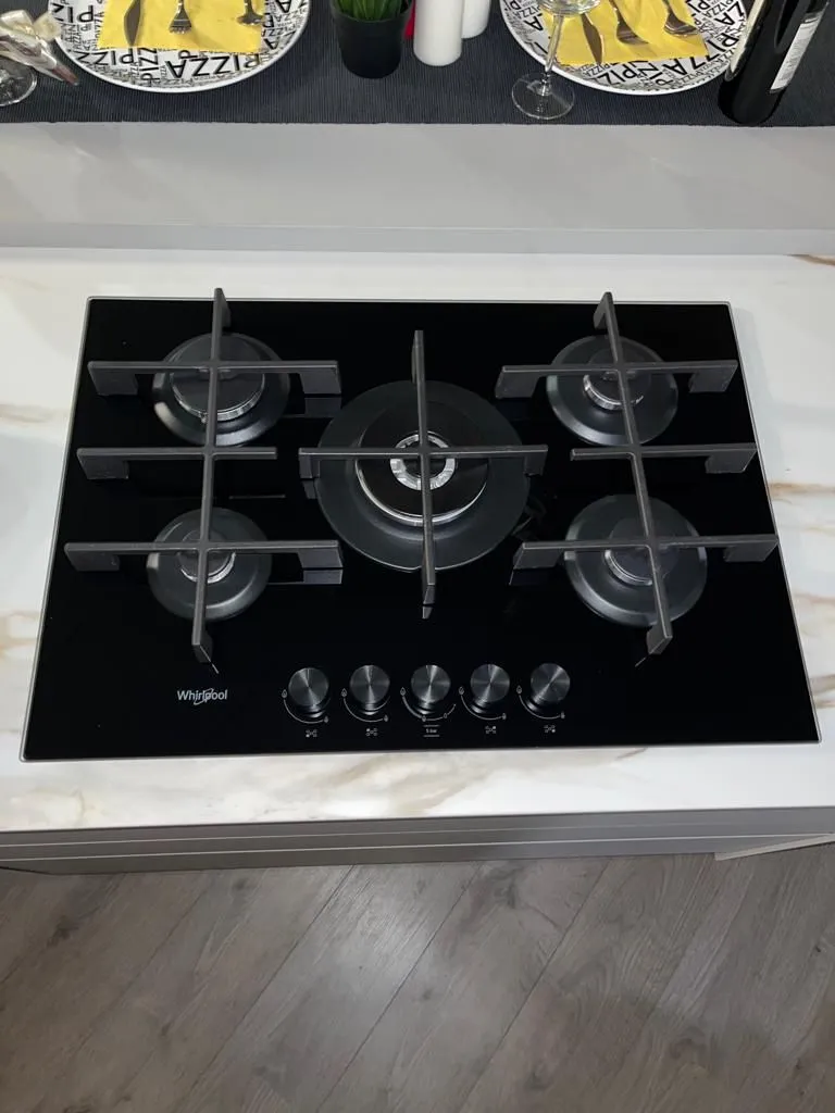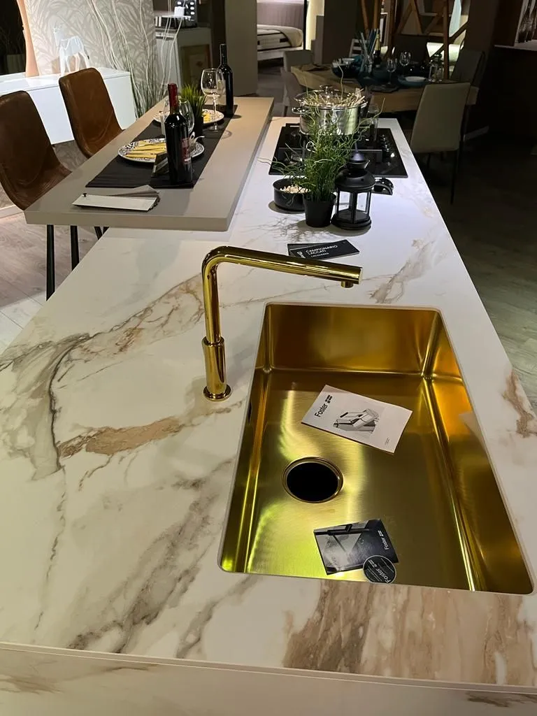 cucina con ante in fenix , gola e zoccolatura laccate oro .completa di elettrodomestici e top in gres disponibile in varie finiture , componibile .disponibilità di pagamento rateizzabile