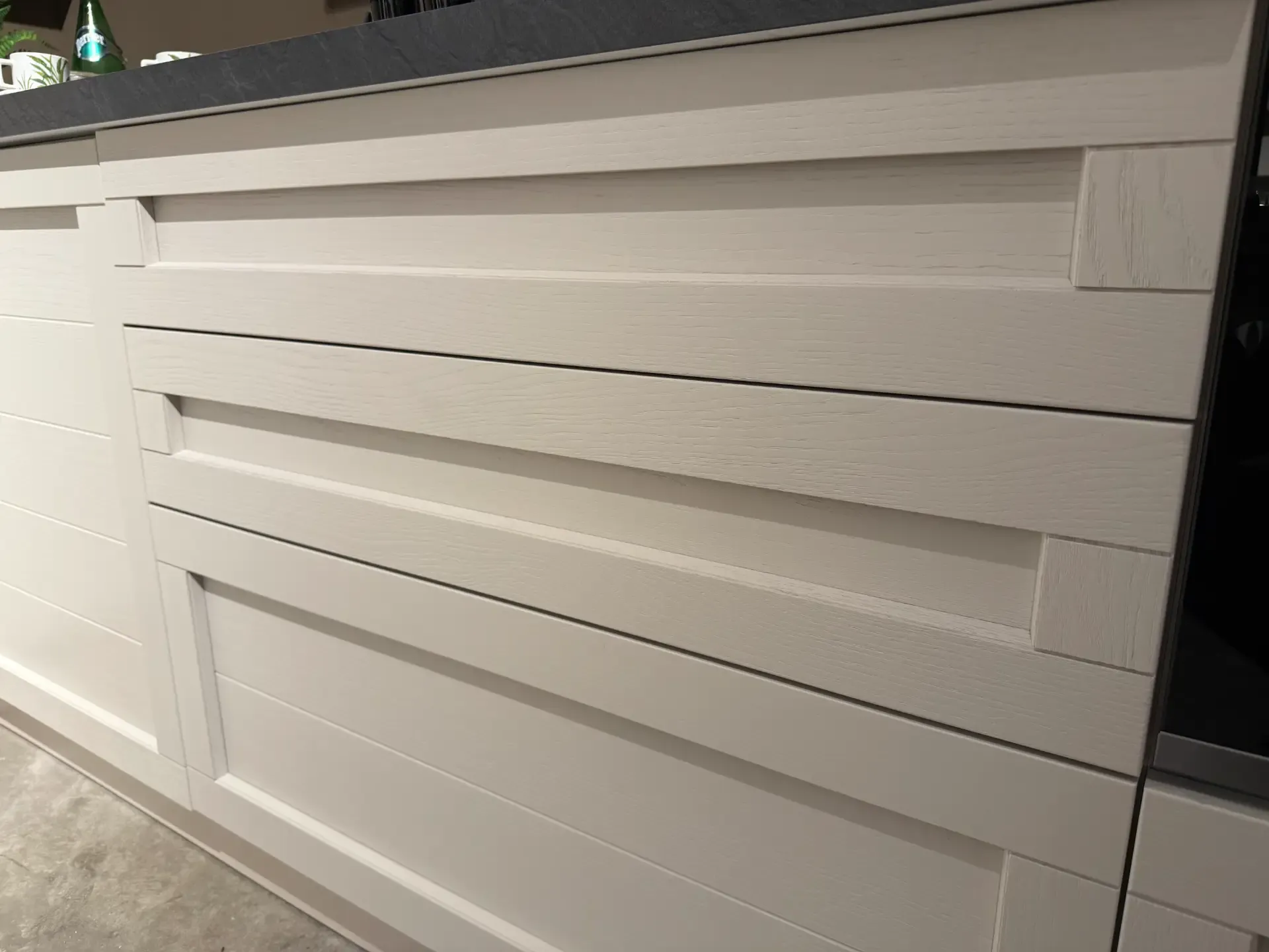 Le ante in legno massello di frassino non solo garantiscono una robustezza senza pari, ma aggiungono anche un fascino naturale che si sposa perfettamente con qualsiasi stile d'arredo. Il top in laminato da 4 cm, oltre a essere resistente e facile da pulire, offre una superficie ampia e versatile per tutte le attività culinarie.
