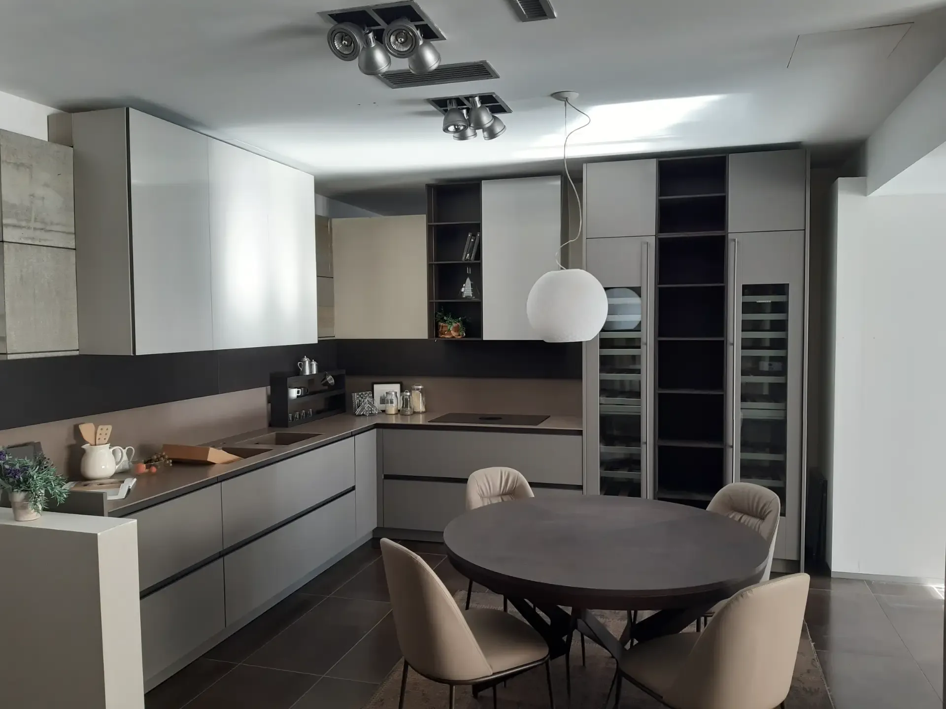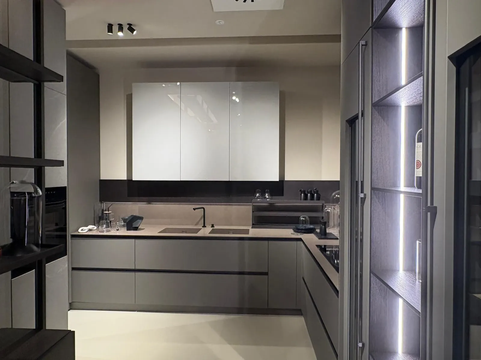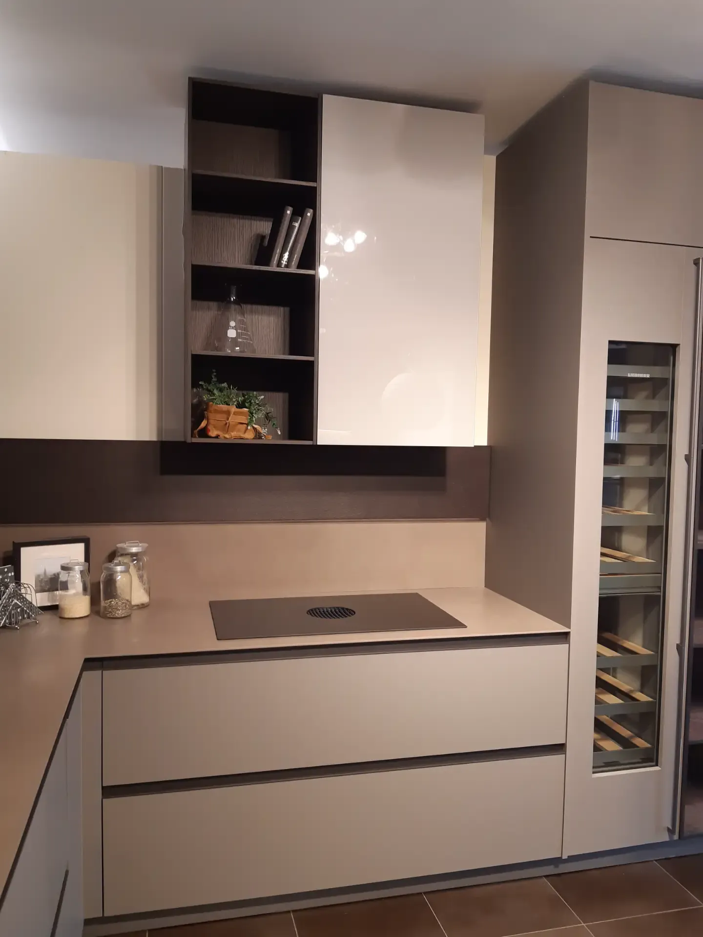 I pensili, con struttura laccata opaca colore Arena e ante in vetro lucido Greige, sono dotati di illuminazione interna a led che si attiva all'apertura. La colonna a giorno in legno Fashion Wood Rovere Carbone è arricchita da doppio led verticale integrato, mentre le due colonne cantina vini Liebherr possono ospitare fino a 75 bottiglie ciascuna.