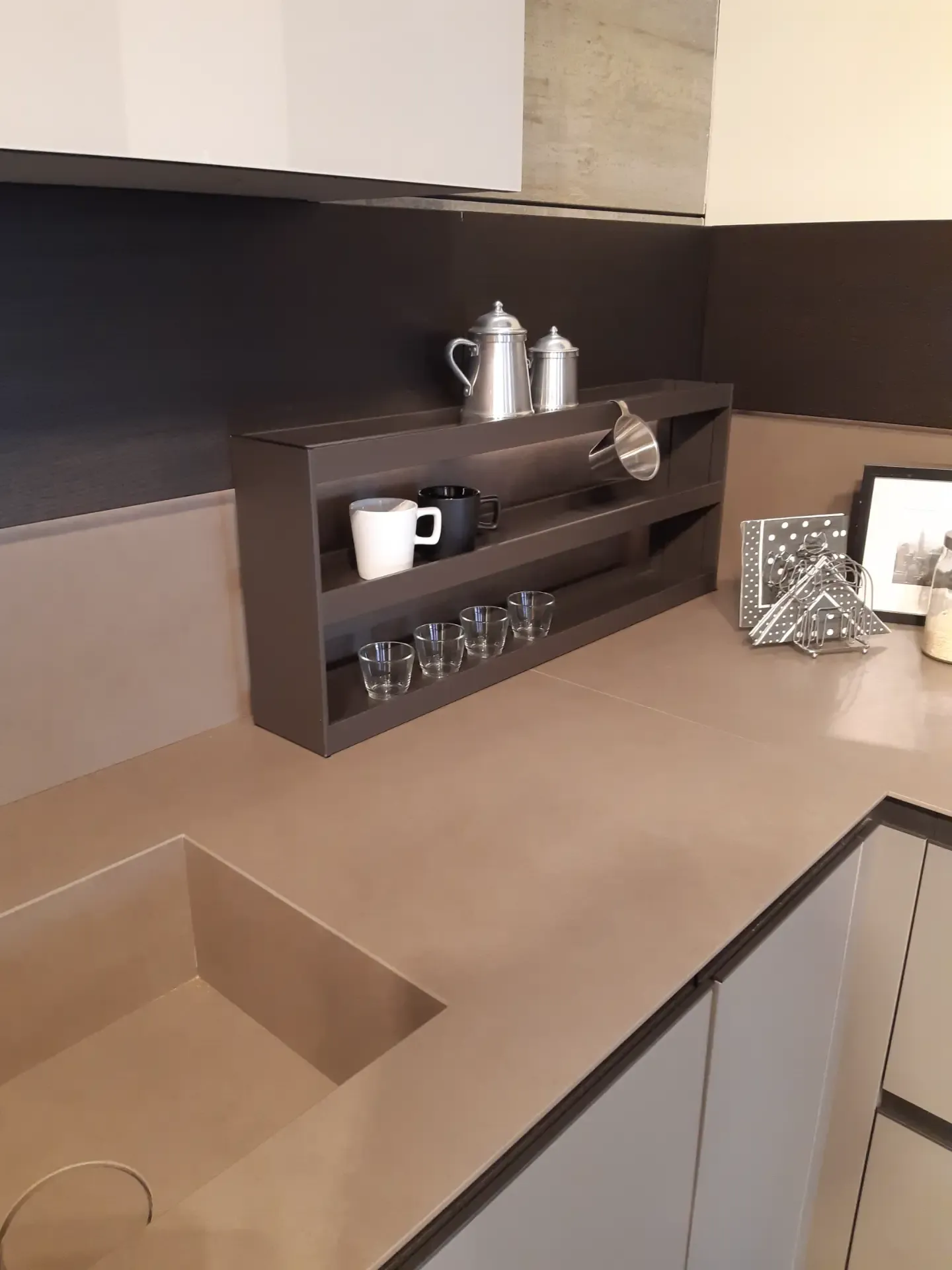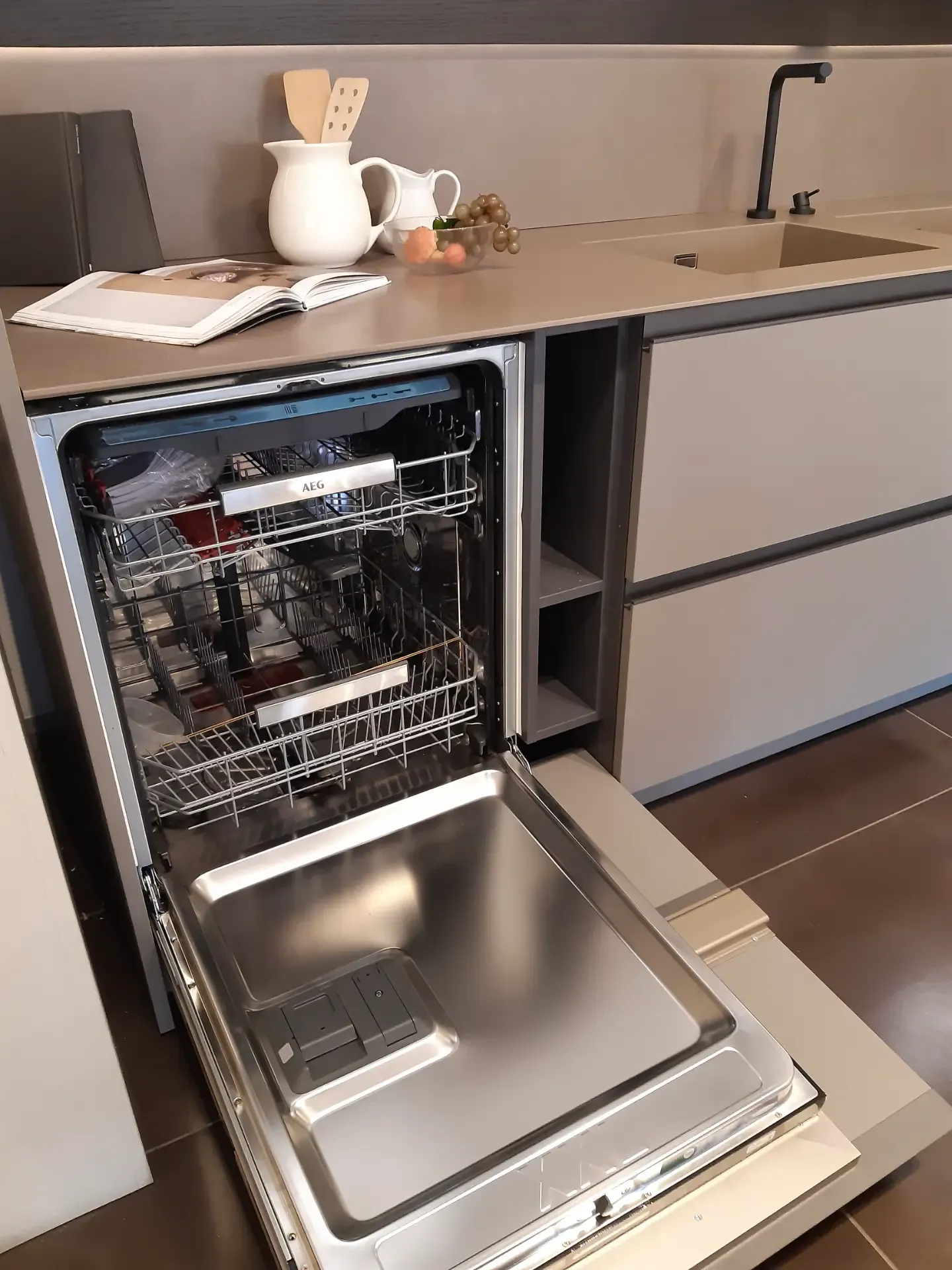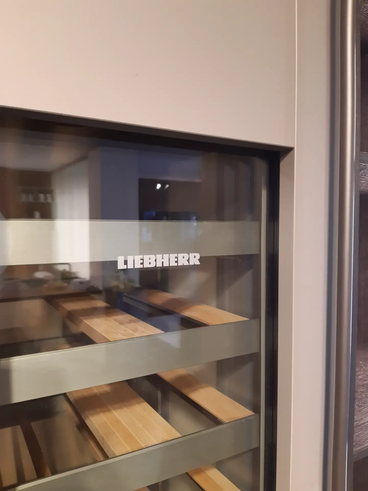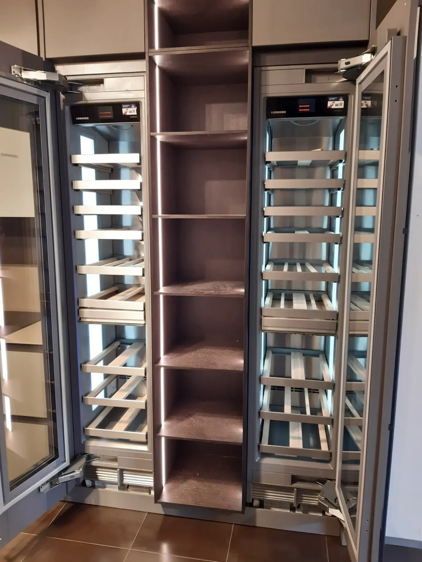 I pensili, con struttura laccata opaca colore Arena e ante in vetro lucido Greige, sono dotati di illuminazione interna a led che si attiva all'apertura. La colonna a giorno in legno Fashion Wood Rovere Carbone è arricchita da doppio led verticale integrato, mentre le due colonne cantina vini Liebherr possono ospitare fino a 75 bottiglie ciascuna.