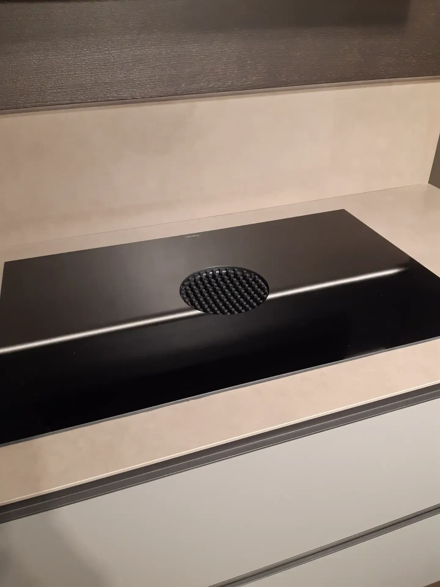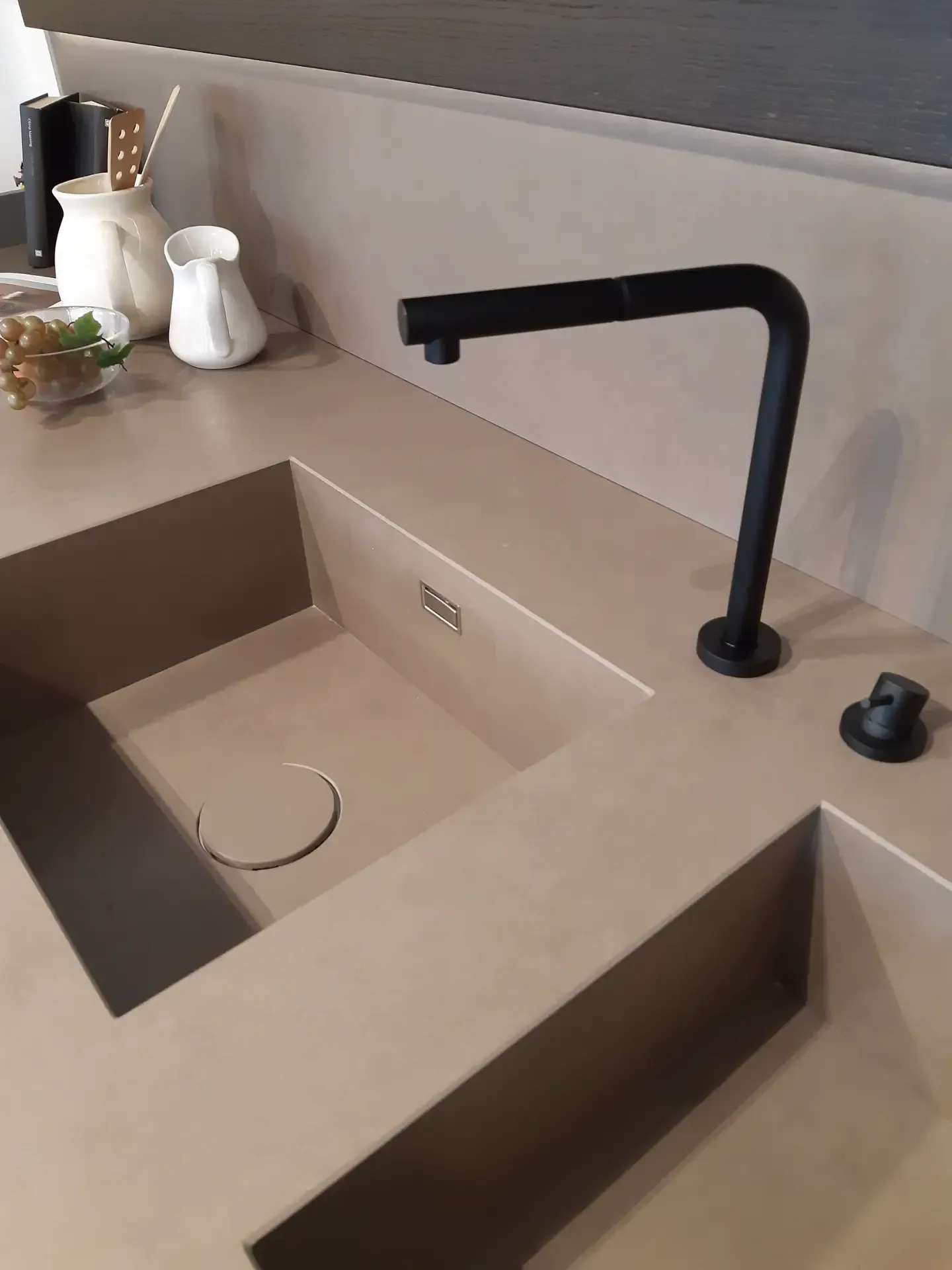 Il top e lo schienale sono realizzati in Laminam Fokos Roccia, un materiale che conferisce robustezza ed eleganza grazie al suo spessore di 12 mm e al bordo anteriore smussato. Le due vasche integrate nel top offrono un lavello dal design unico, mentre la boiserie orizzontale in legno Fashion Wood Rovere Carbone (retroillumanta led), aggiunge un tocco di calore all'ambiente.