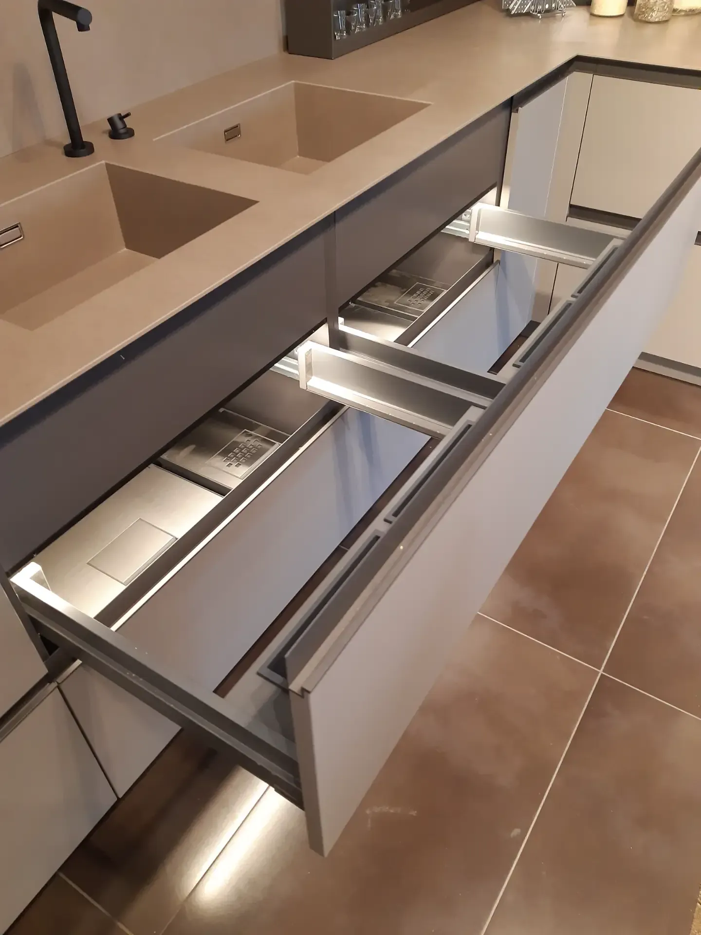Il cuore della composizione è costituito da basi con profondità maggiorata, dotate di cassettoni estraibili illuminati da led, che si accendono automaticamente grazie a sensori integrati. Gli interni dei cassettoni hanno il fondo in Laminam e accessoriati con portaposate, portapiatti e altri elementi utili per organizzare al meglio lo spazio.