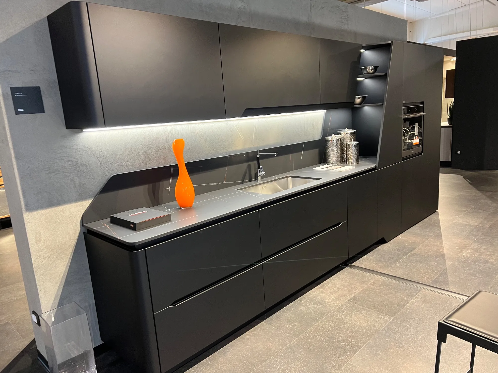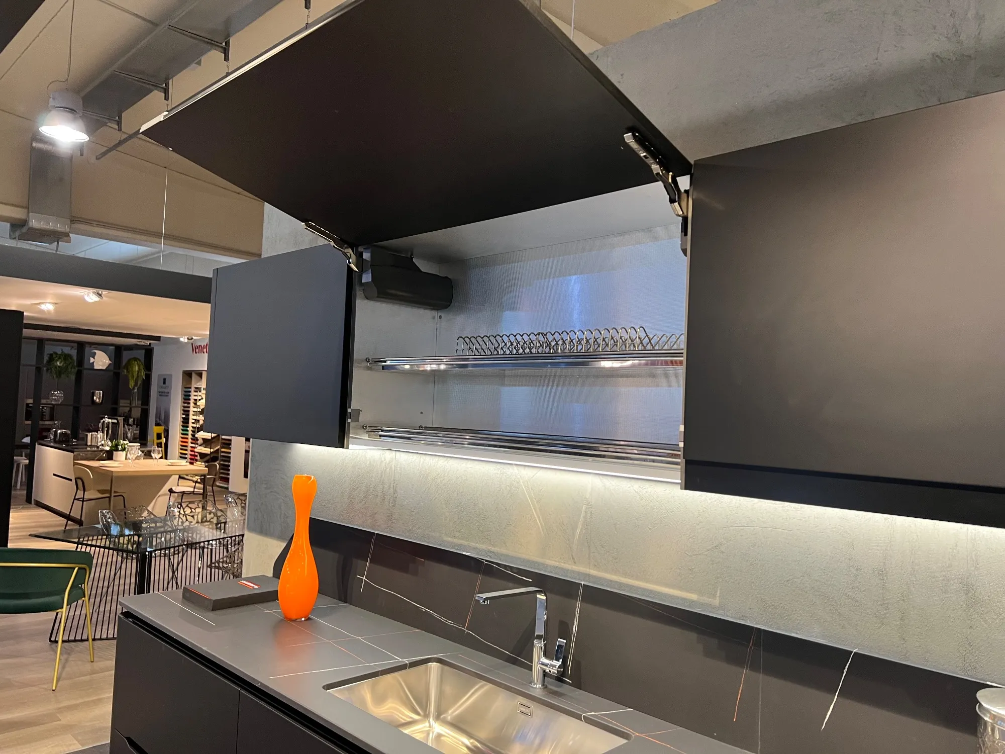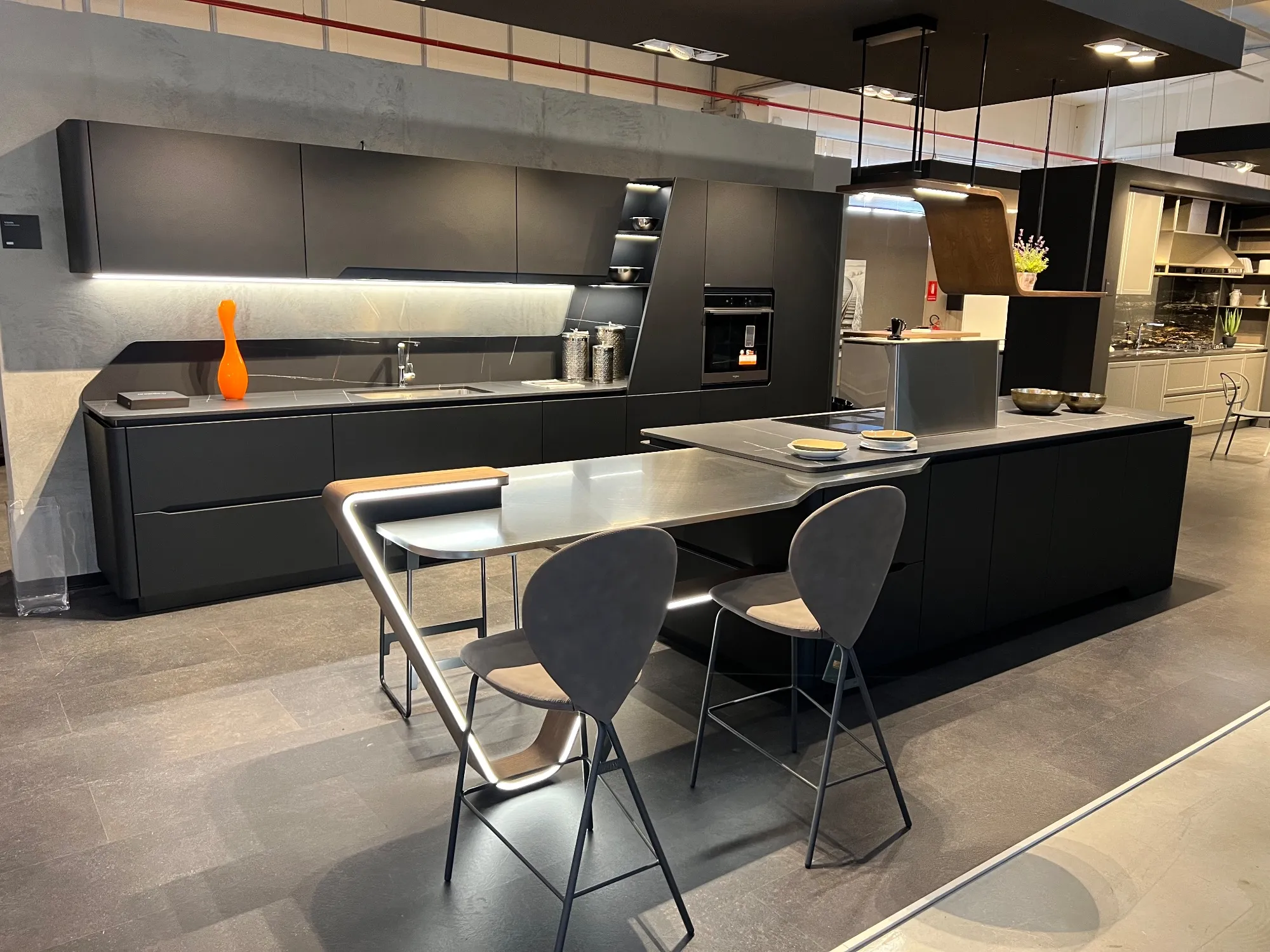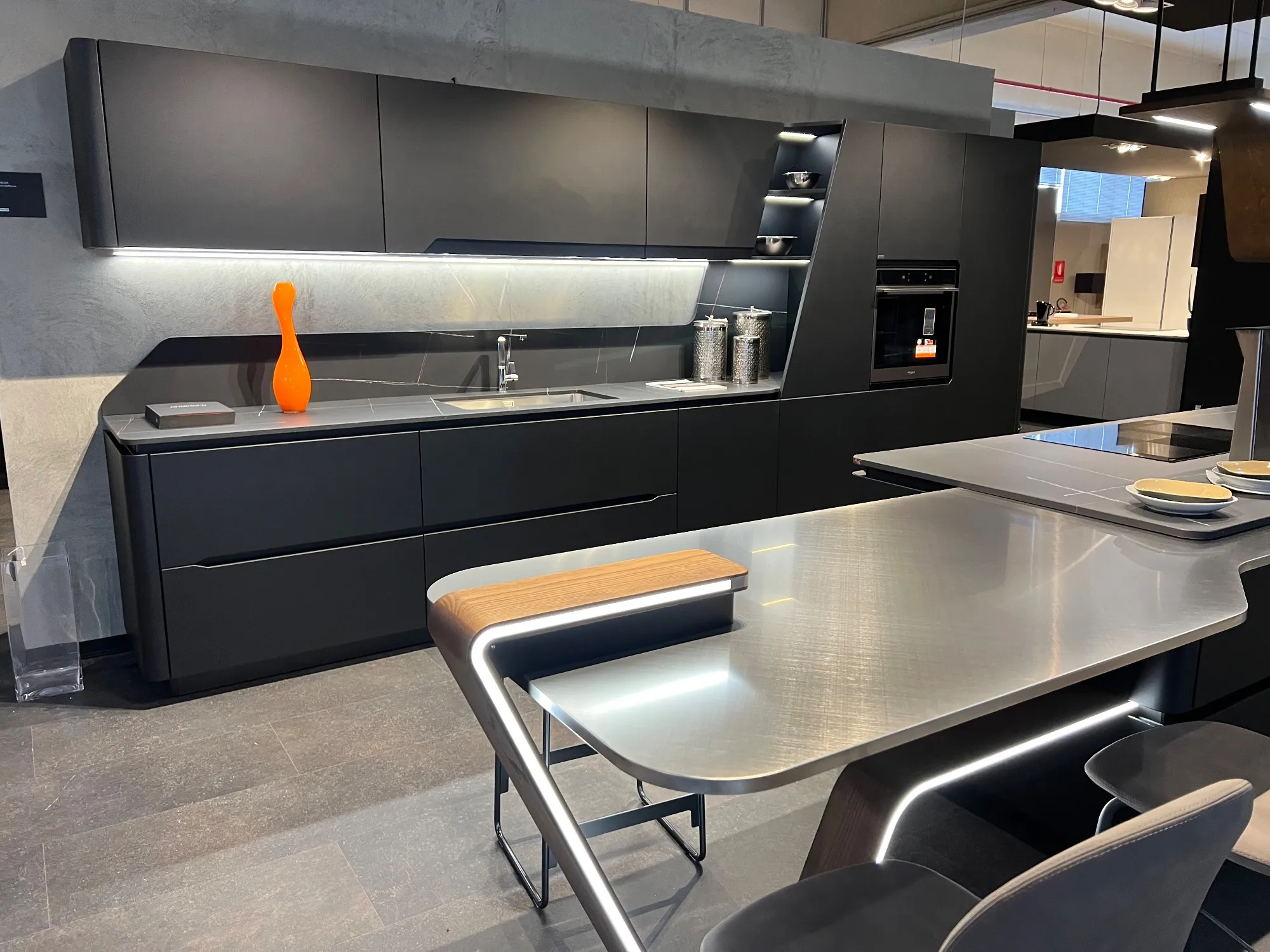 Finiture Laccato opaco Nero Puro Super mat Piano e schienale in Quarzo Nero venato Pensili con apertura elettrica Zona pranzo in acciaio Illuminazione a led