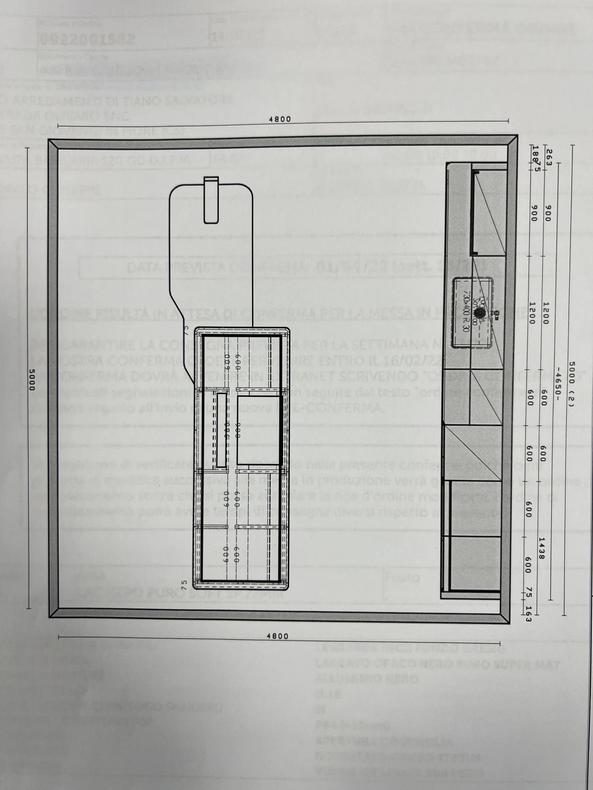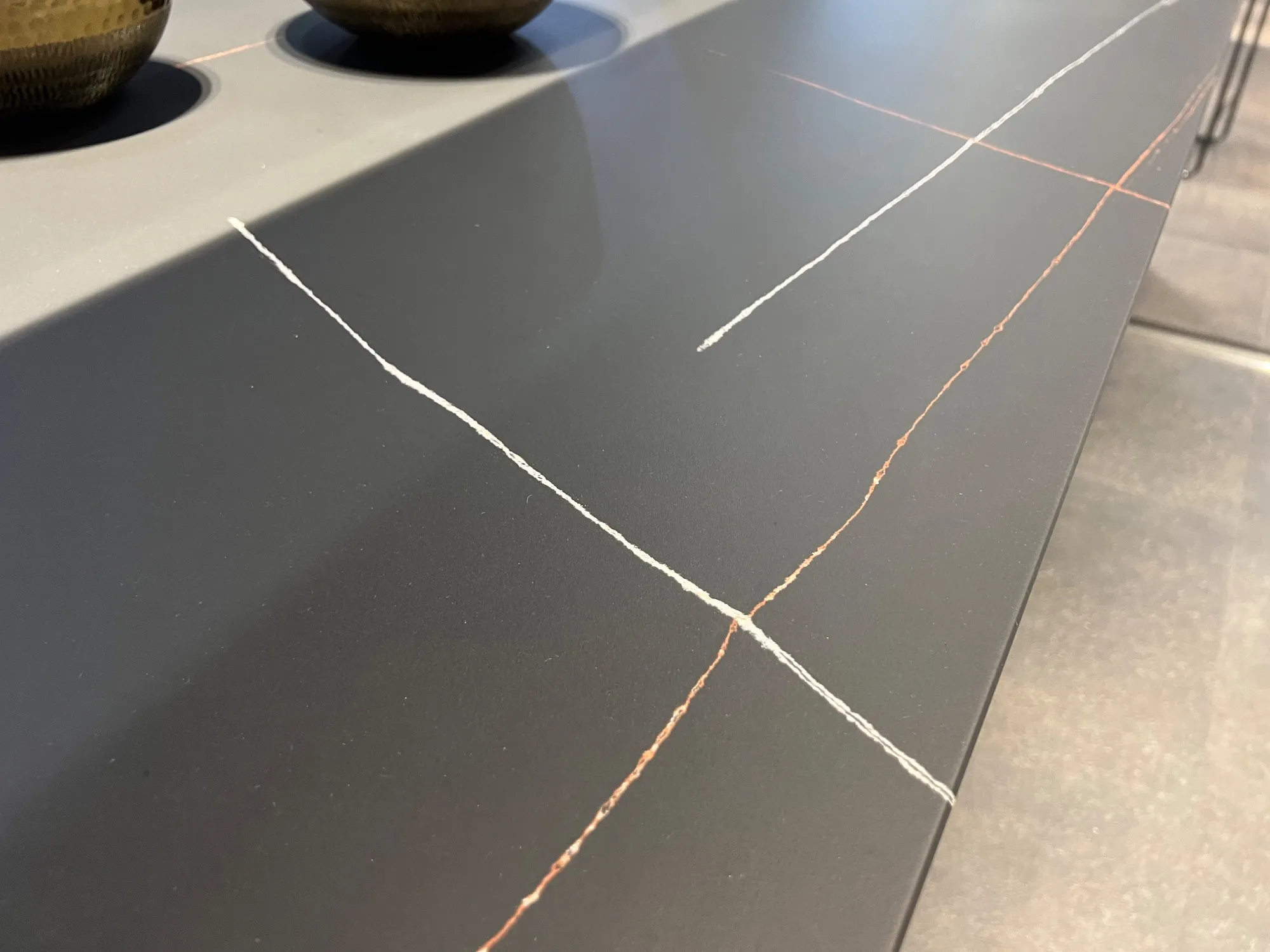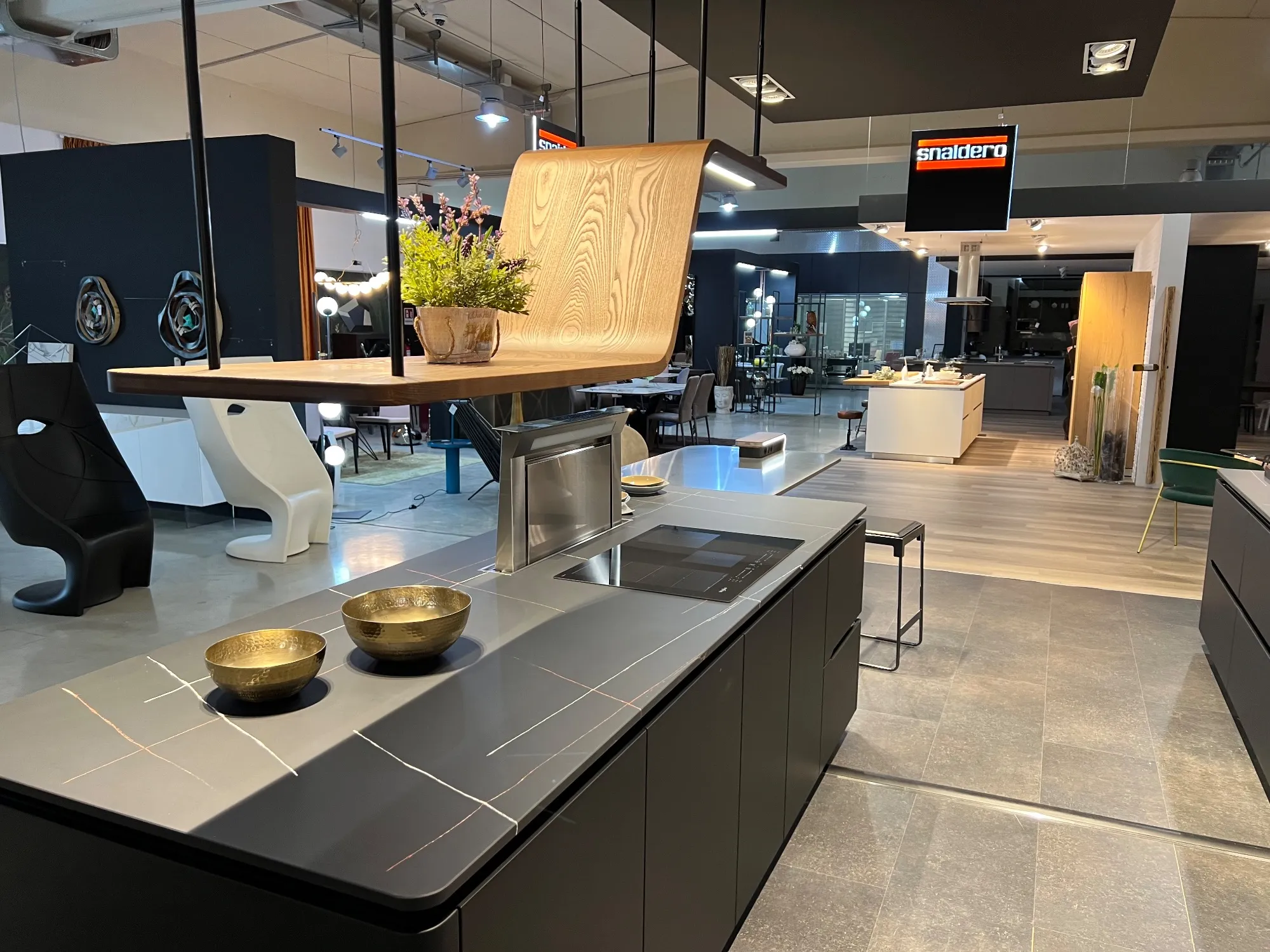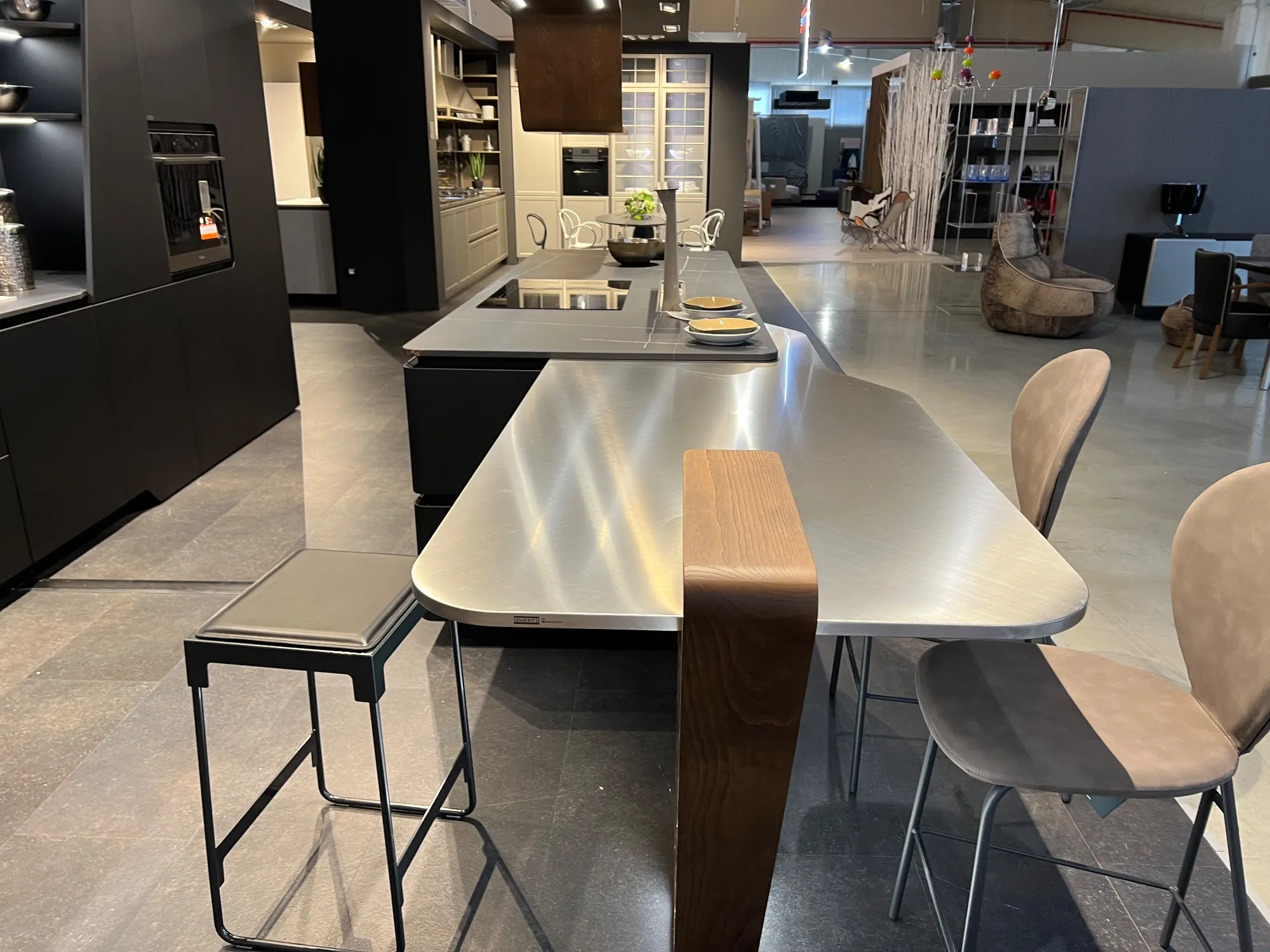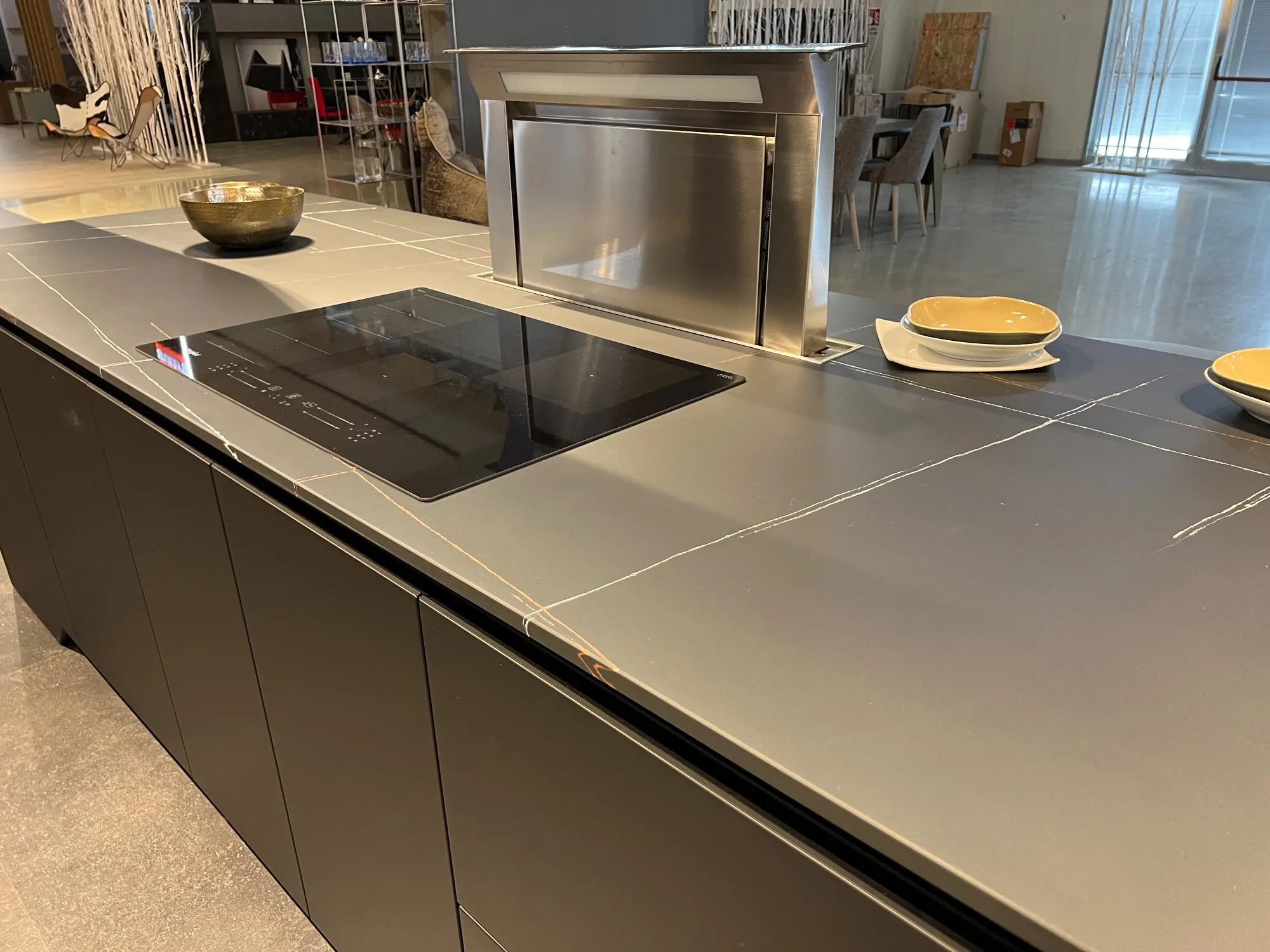 Finiture Laccato opaco Nero Puro Super mat Piano e schienale in Quarzo Nero venato Pensili con apertura elettrica Zona pranzo in acciaio Illuminazione a led