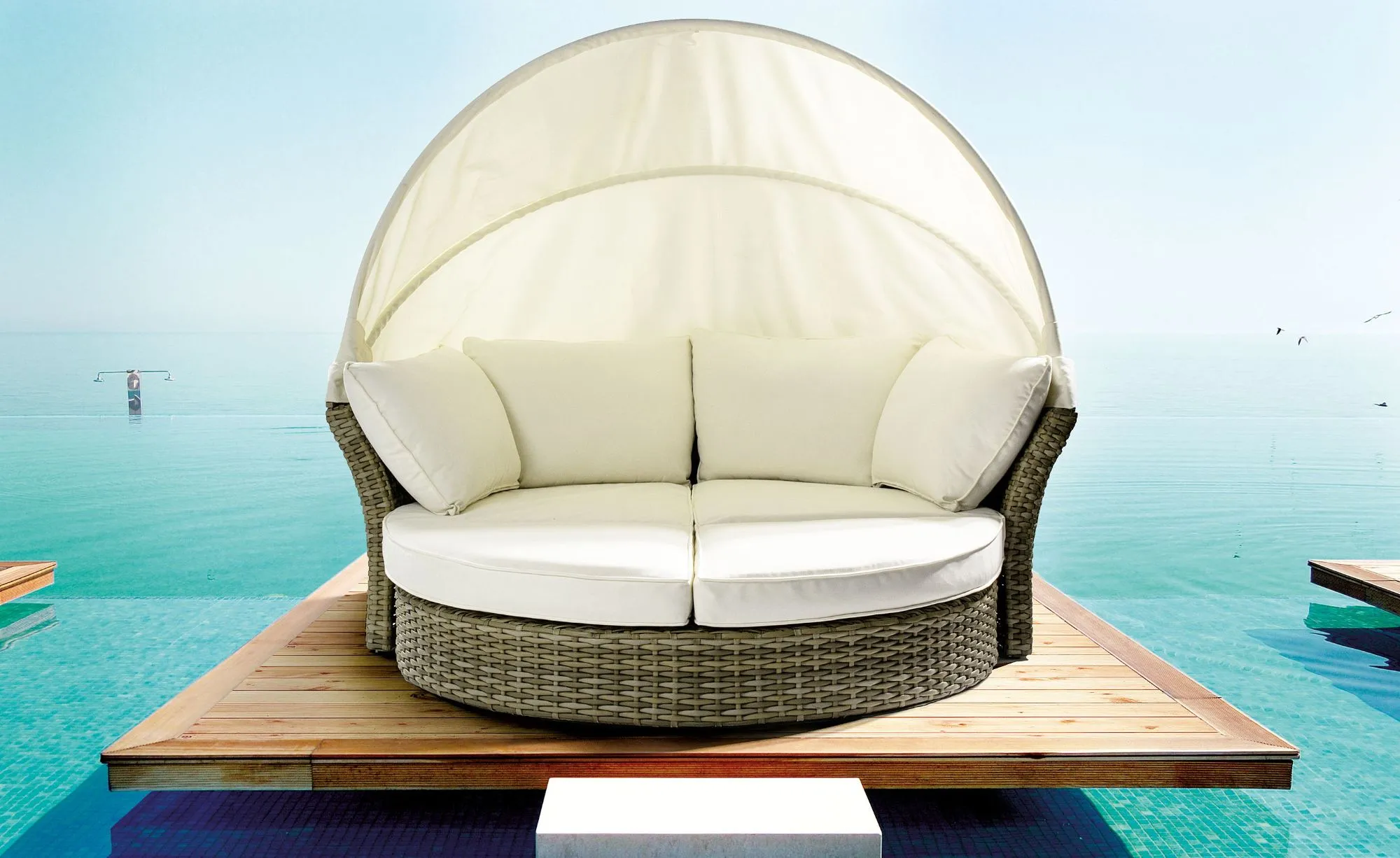 Soluzioni d’arredo versatile ed estremamente confortevole nei contesti outdoor. Grazie al poggiapiedi rotante e alla cappottina richiudibile, in pochi istanti si trasforma in un comodo divano
