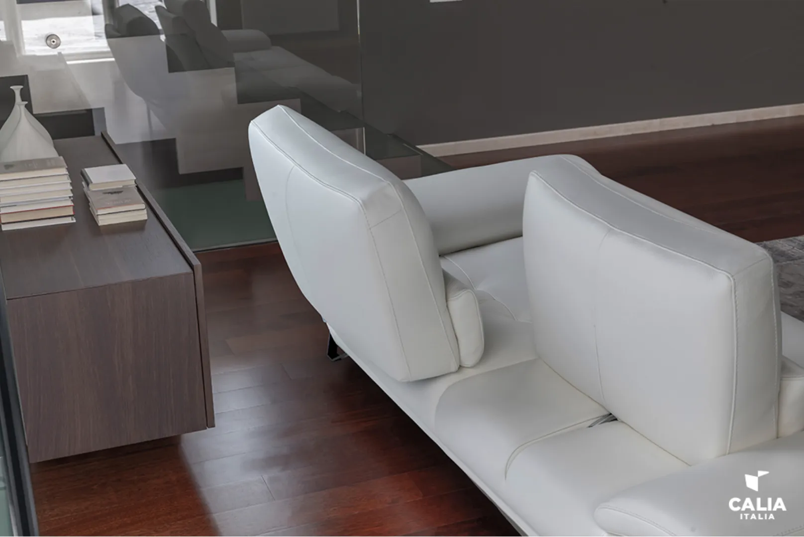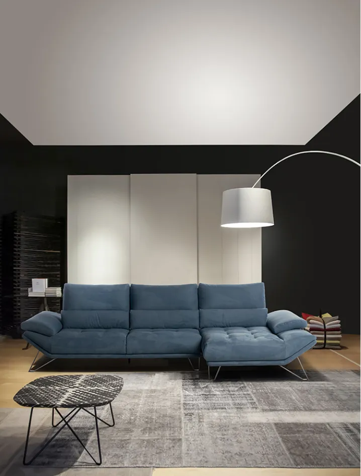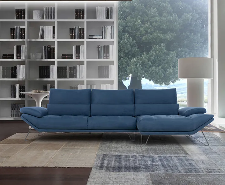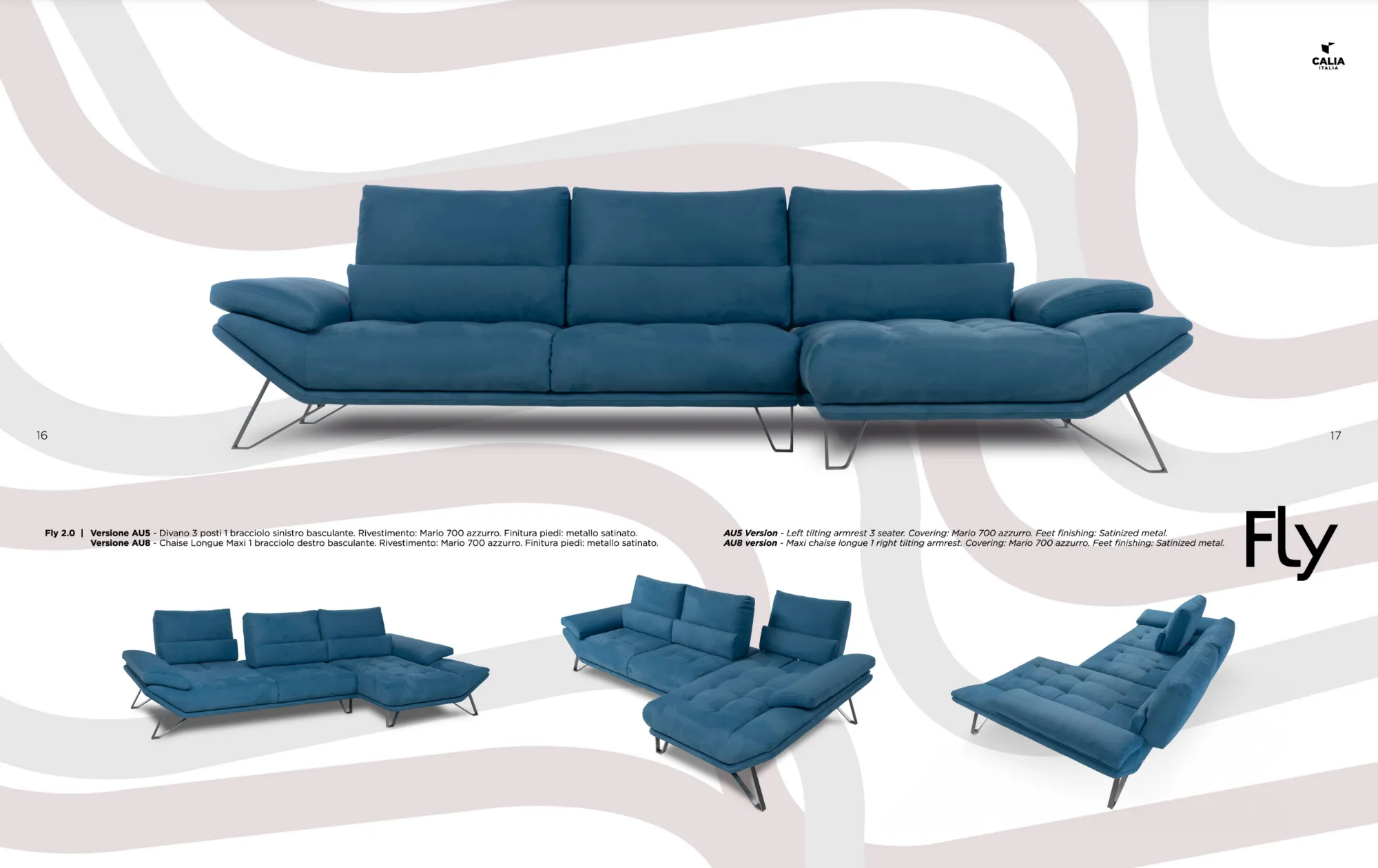 Divano Calia mod Fly composto da elemento terminale sx art. F5641AU5 + chaise longue dx art. F5641AU8 - braccioli e schienali orientabili. Rivestimento cat. TB tessuto art. MARIO col. 705 BLUETTE - PIEDE METALLO LUCIDO Dimensioni: cm L 304 x P 116/138 x H 90 - HS 42