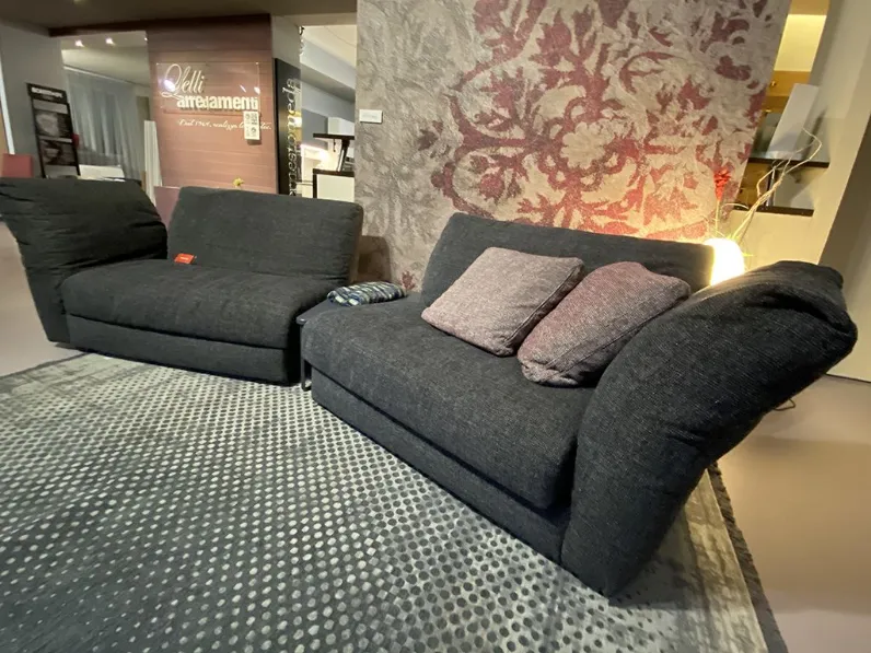 Divano due moduli simmetrici L145cm P105cm, lunghezza totale composizione L 290cm. Caratterizzano il modello Cortina di BONALDO i braccioli flessibili che garantiscono un ottimo confort anche sui braccioli laterali. Il tavolino triangolare colore antracite può essere posizionato tra i due moduli o separatamente.