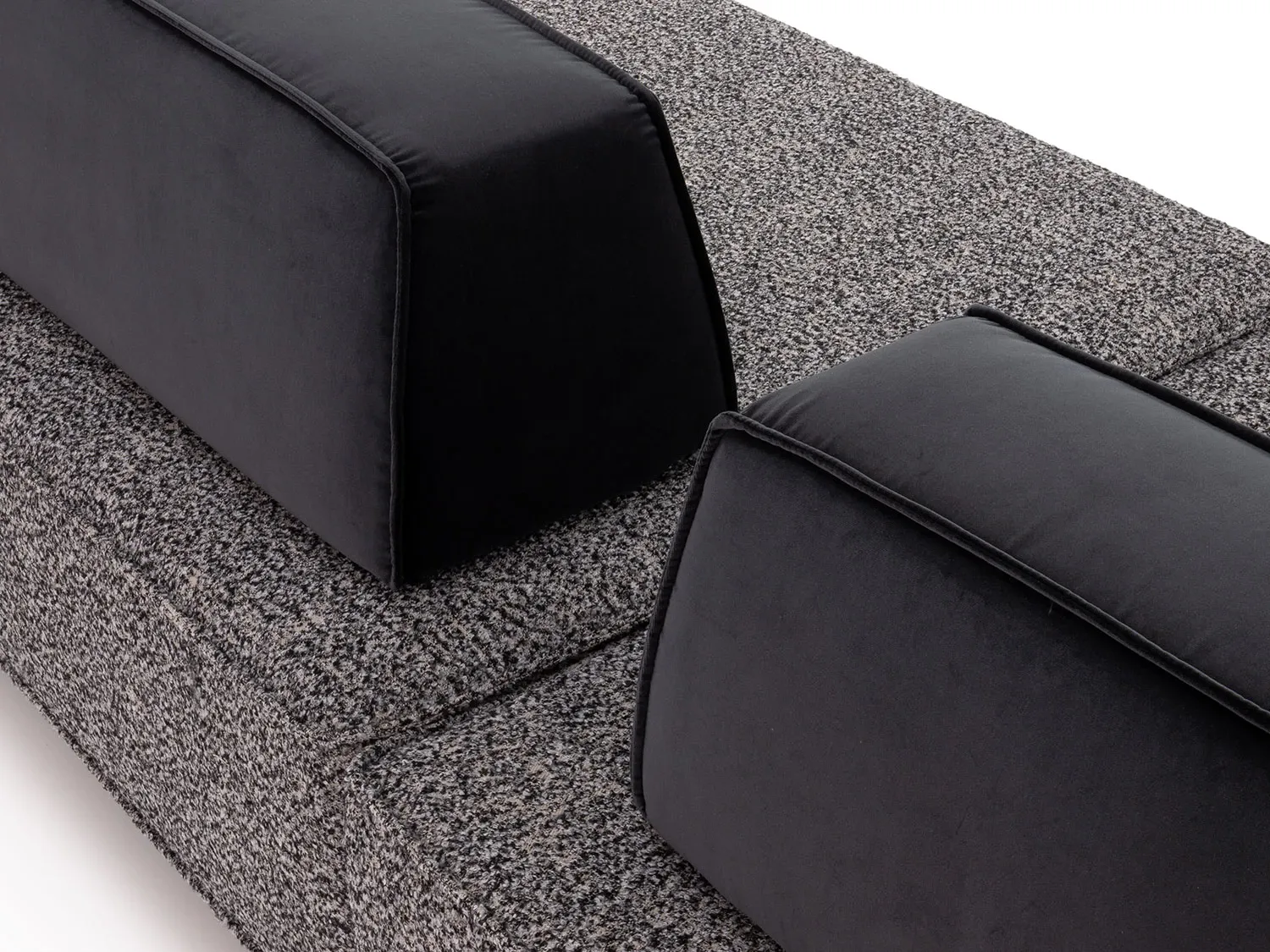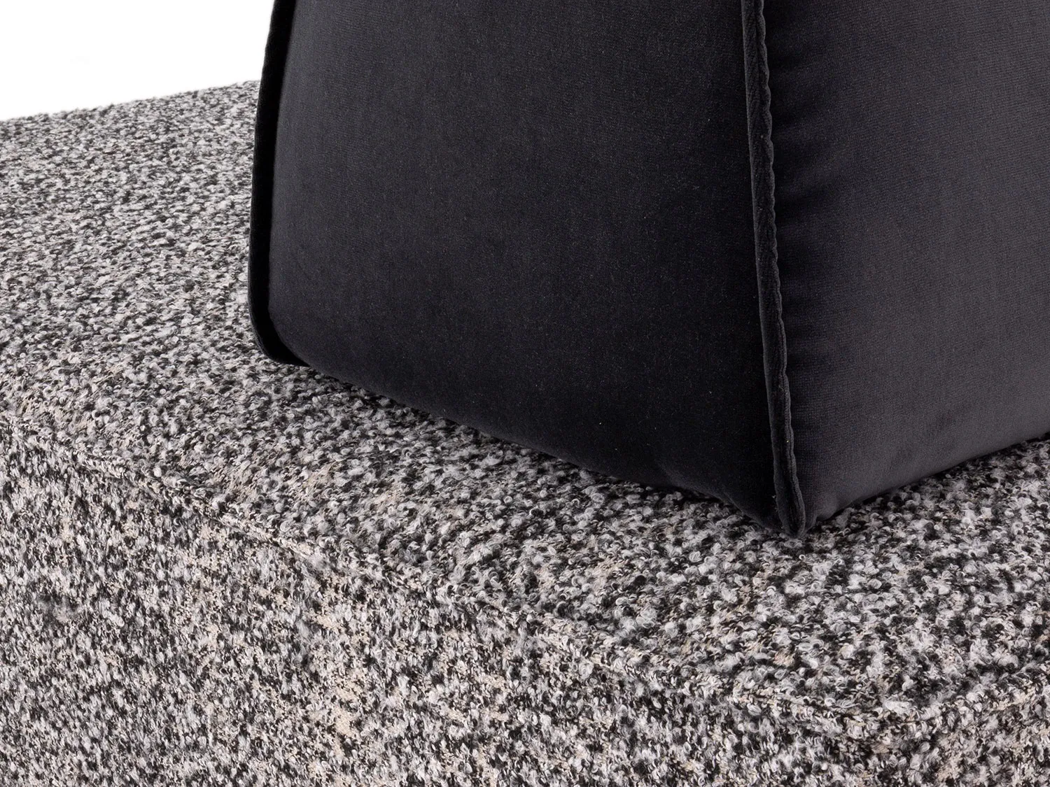 Prisma outlet è proposto con un elegante rivestimento bicolore: i cuscini di schienale sono realizzati in velluto, mentre le sedute sono rivestite in tessuto bouclè. La cura sartoriale si esprime nella raffinata rifinitura con cucitura a nervetto pizzicato.