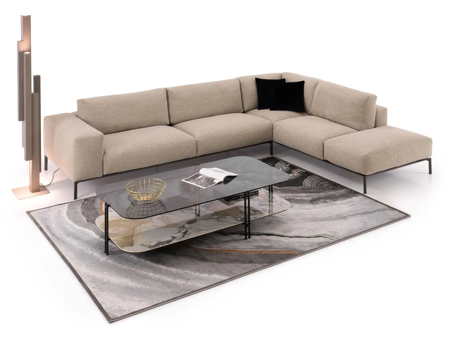 Il divano è proposto nella versione angolare con pouf panoramico e un elemento terminale con bracciolo cm 30.
