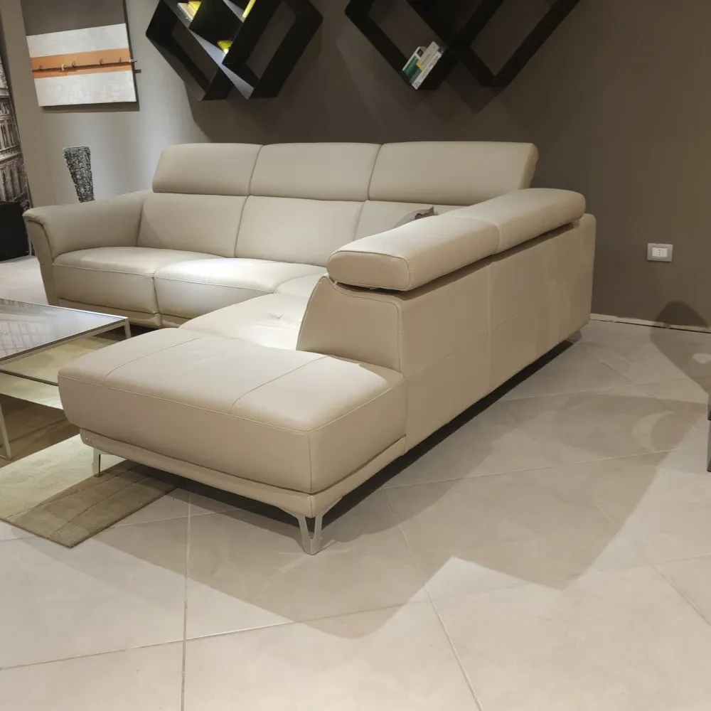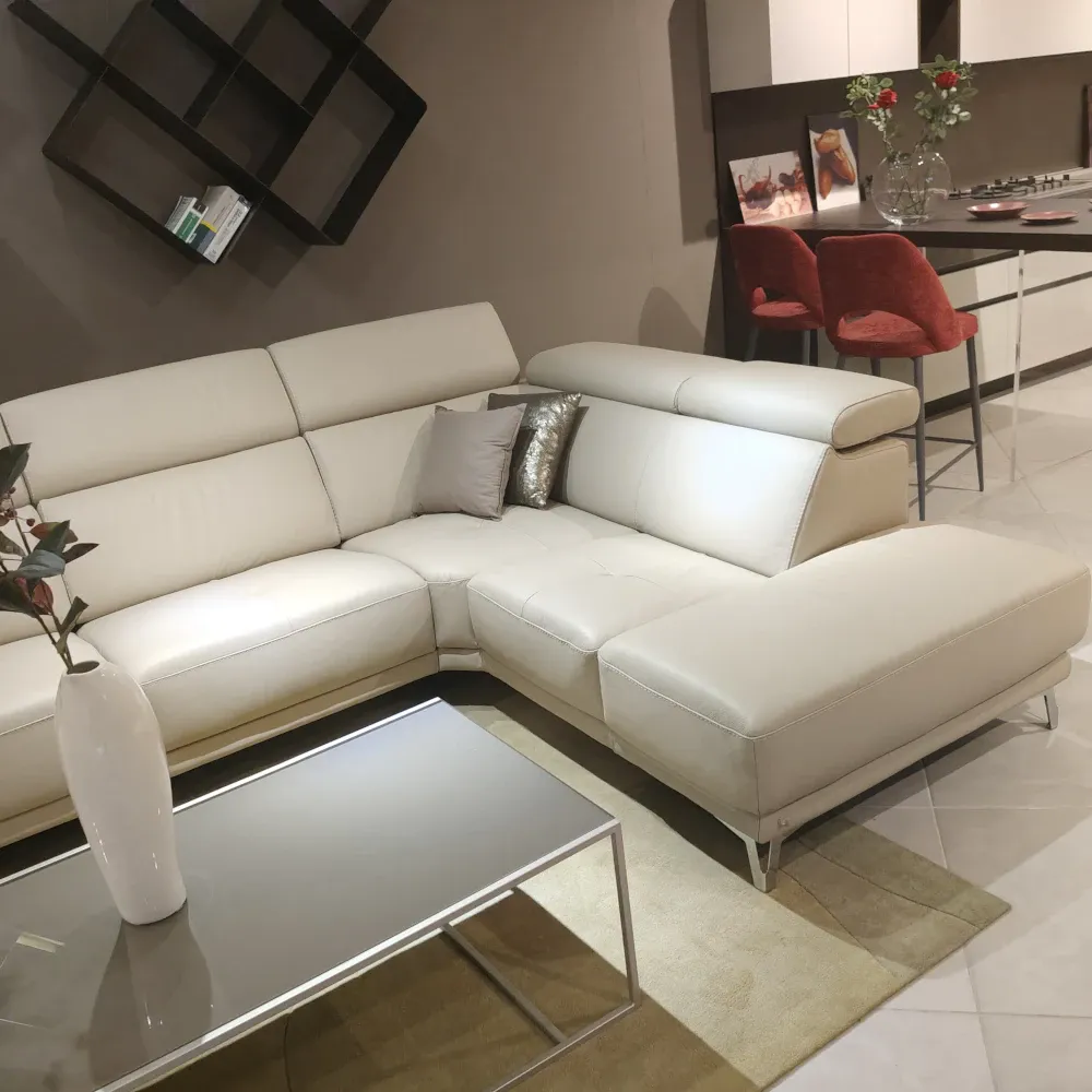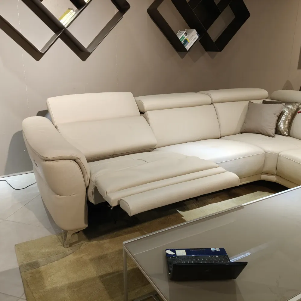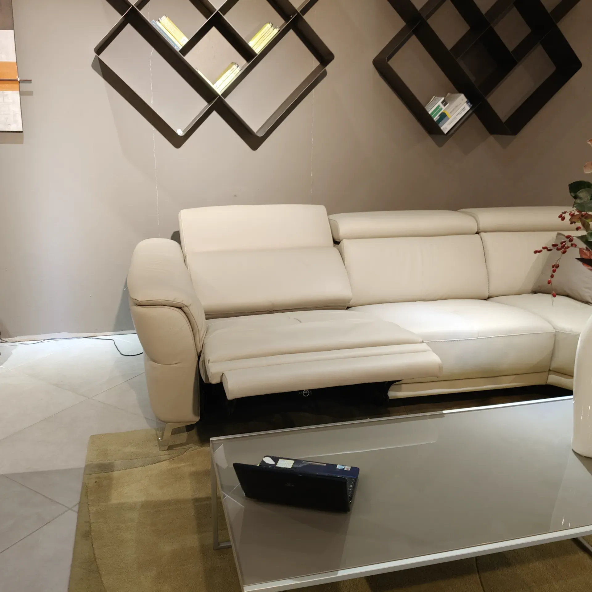 Divano componibile in pelle avorio trapuntata, dotato di una seduta relax elettrica e poggiatesta alzabili.