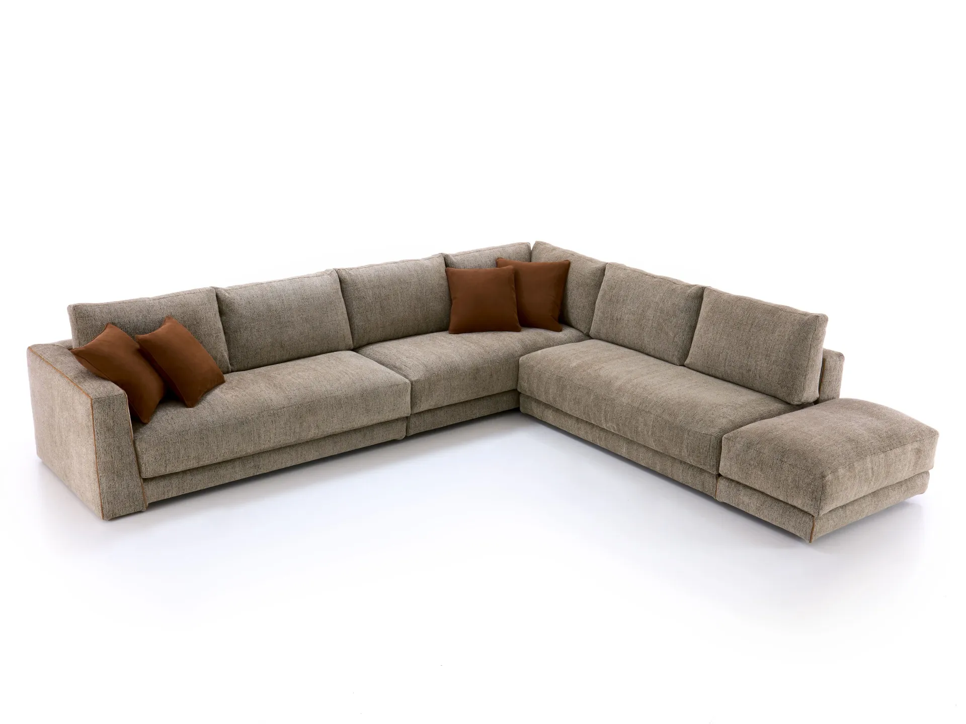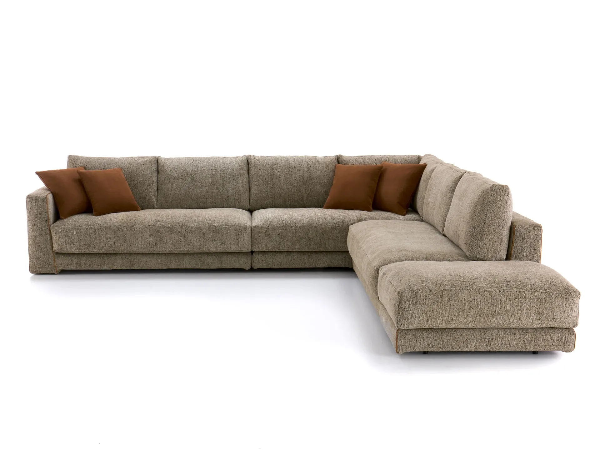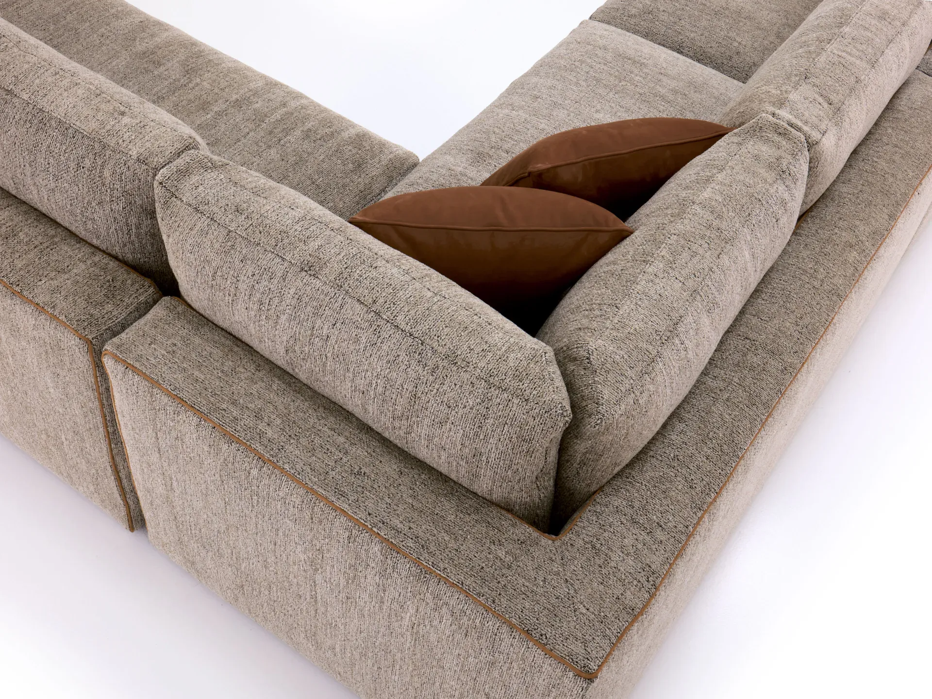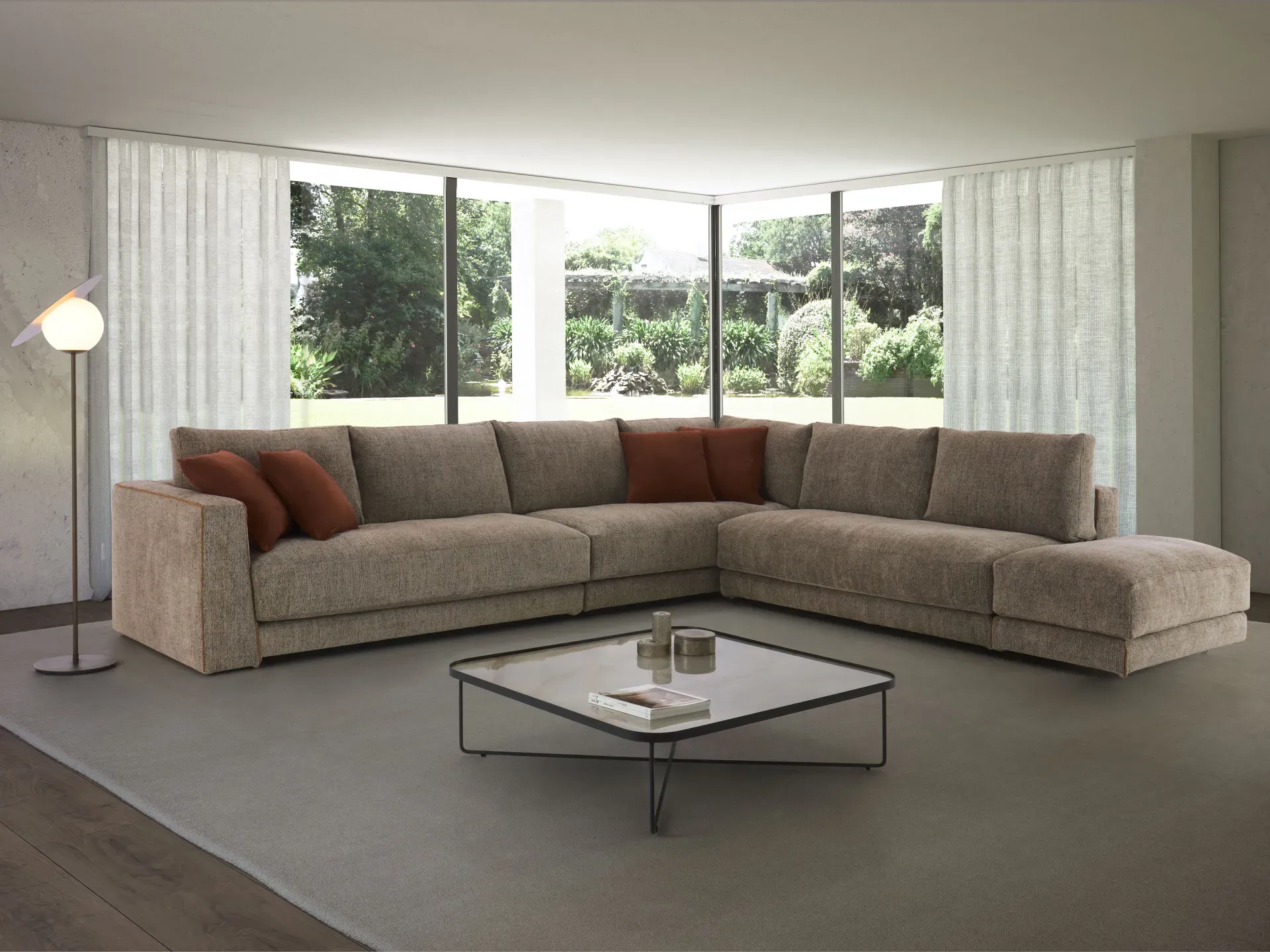 Proposto in una configurazione angolare per 7-8 persone, il divano presenta un lato aperto che termina con un pouf facilmente spostabile a seconda delle esigenze. Clive outlet fonde eleganza sartoriale e cura del dettaglio, espresse nelle cuciture artigianali a contrasto che ne definiscono i profili.