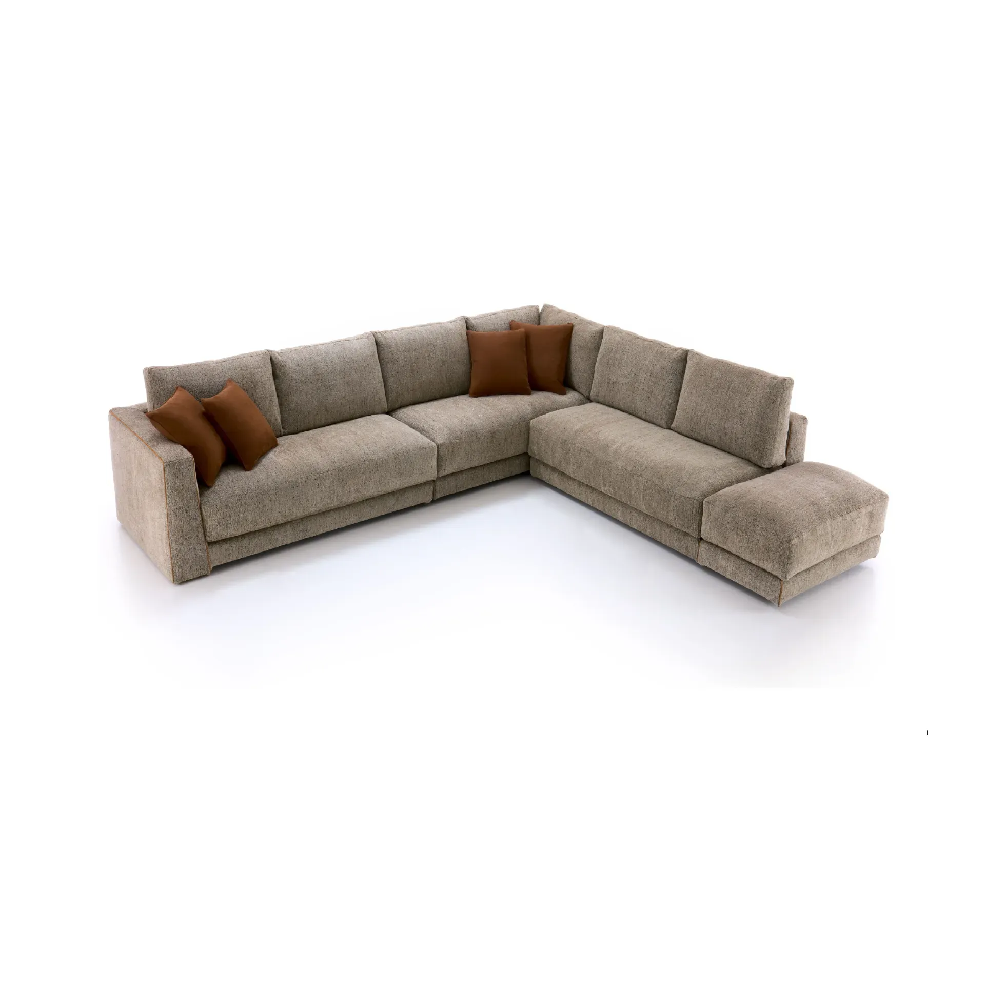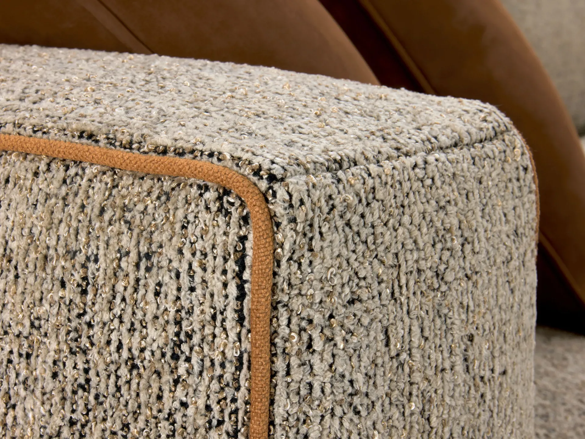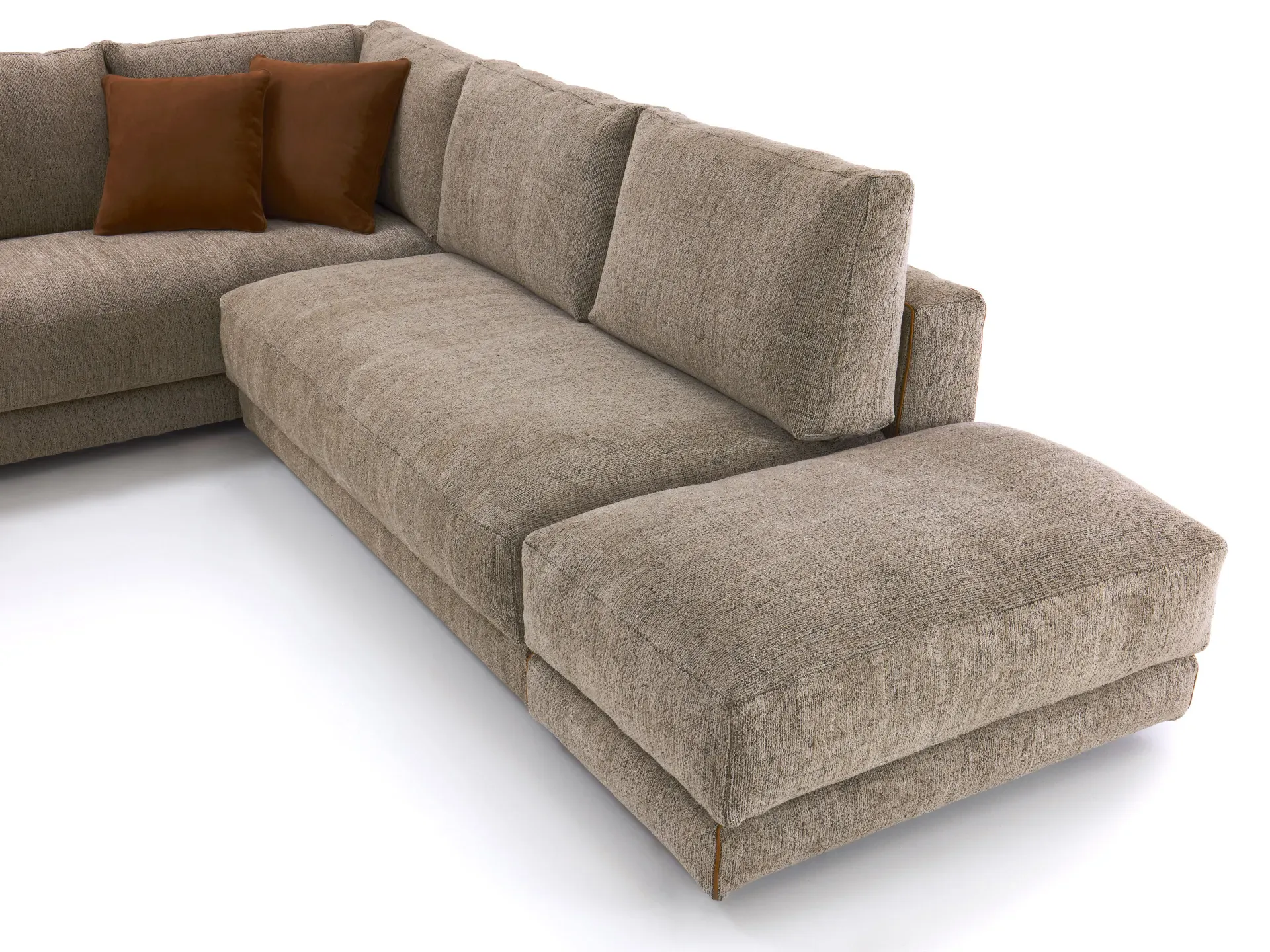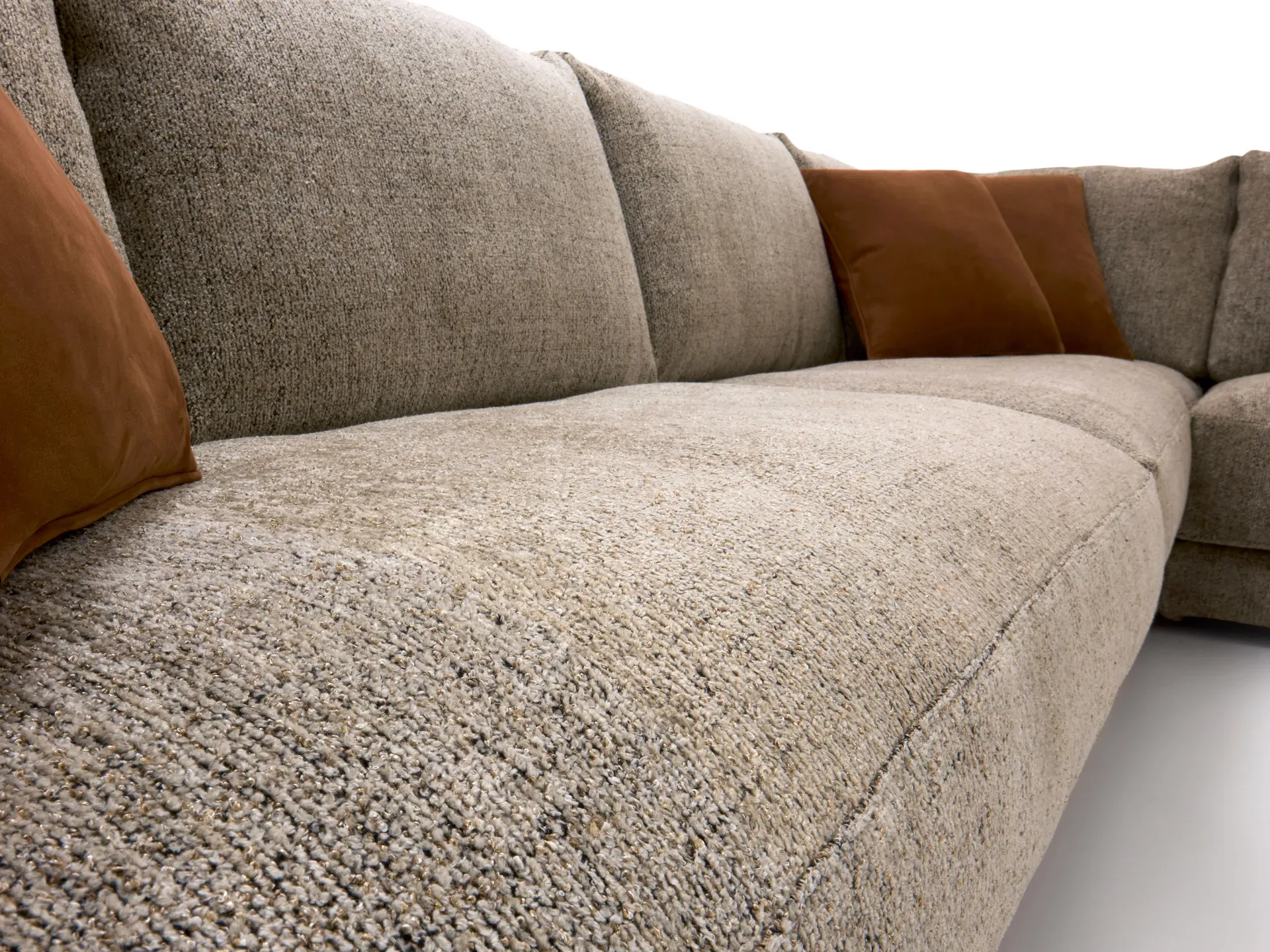 Proposto in una configurazione angolare per 7-8 persone, il divano presenta un lato aperto che termina con un pouf facilmente spostabile a seconda delle esigenze. Clive outlet fonde eleganza sartoriale e cura del dettaglio, espresse nelle cuciture artigianali a contrasto che ne definiscono i profili.