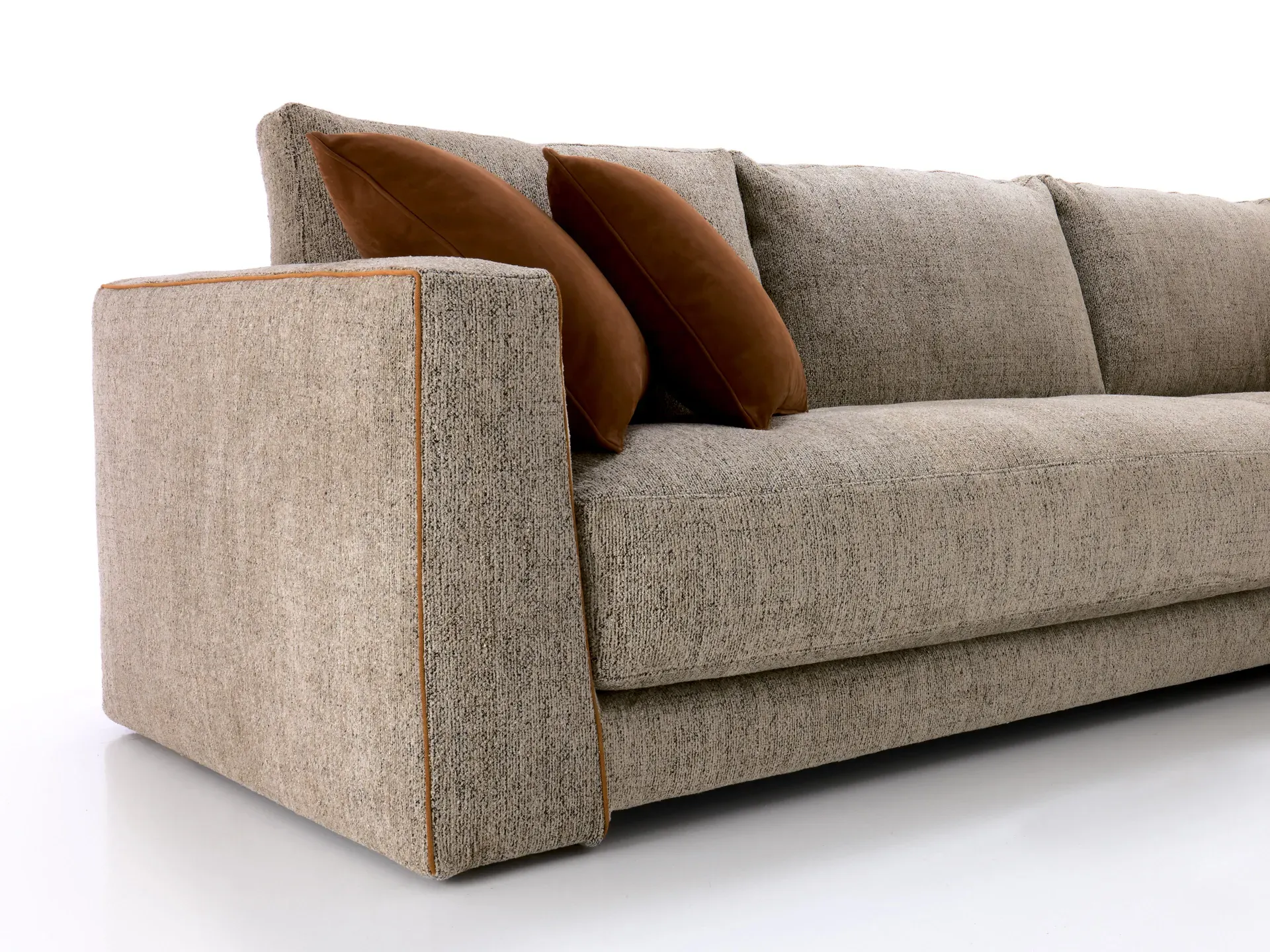 Il bracciolo e il controschienale, dal design squadrato e pulito, accolgono schienali in piuma canalizzata, assicurando una comodità ottimale.