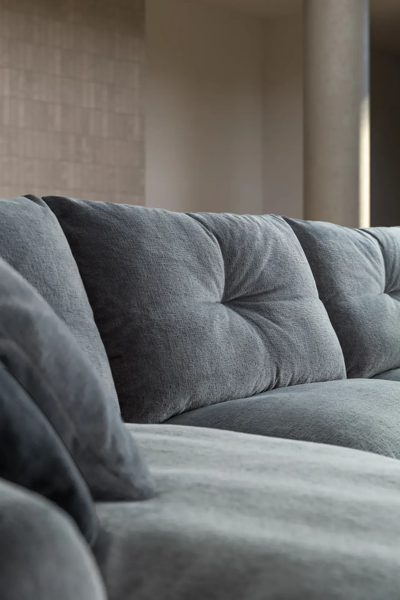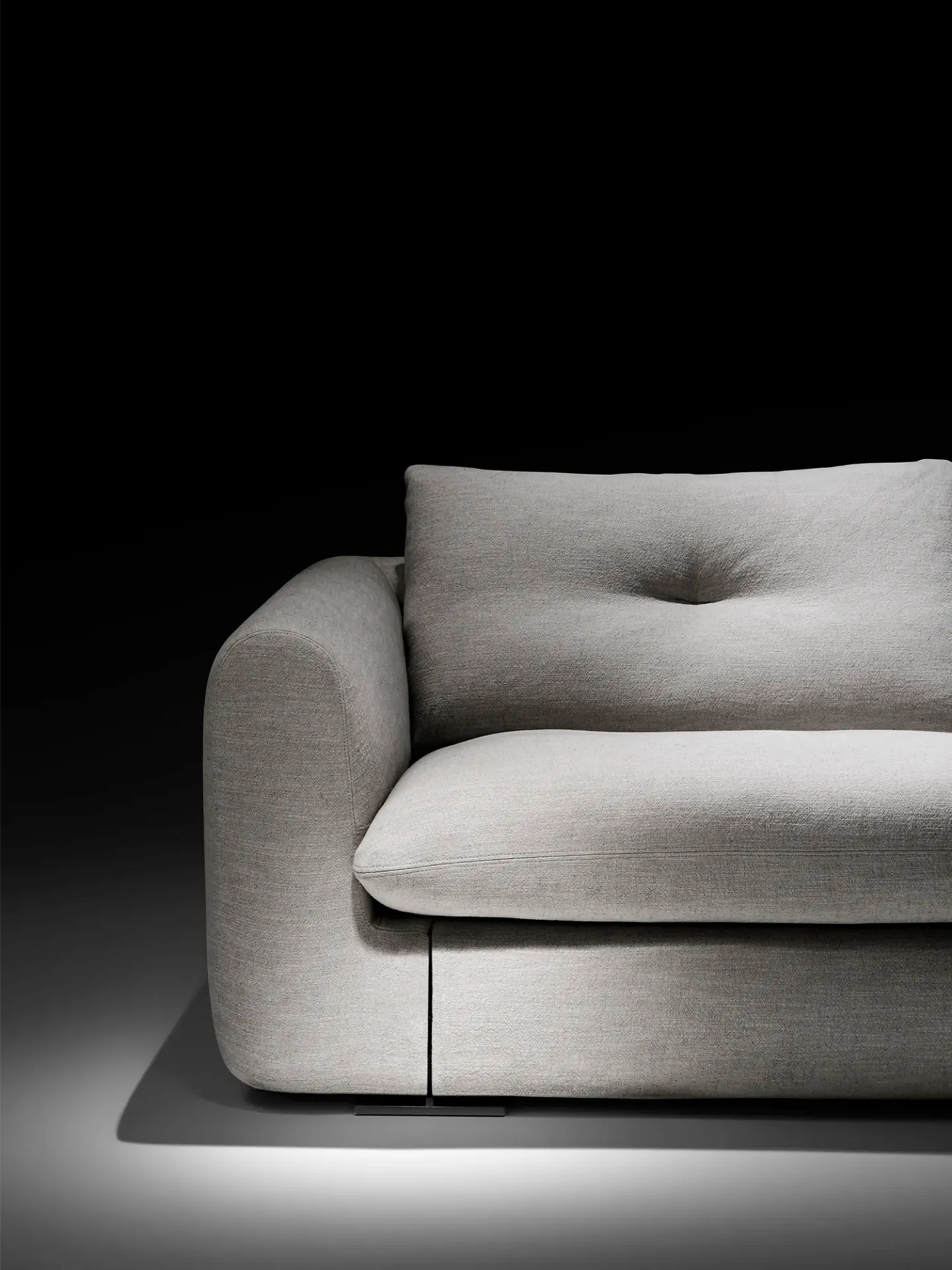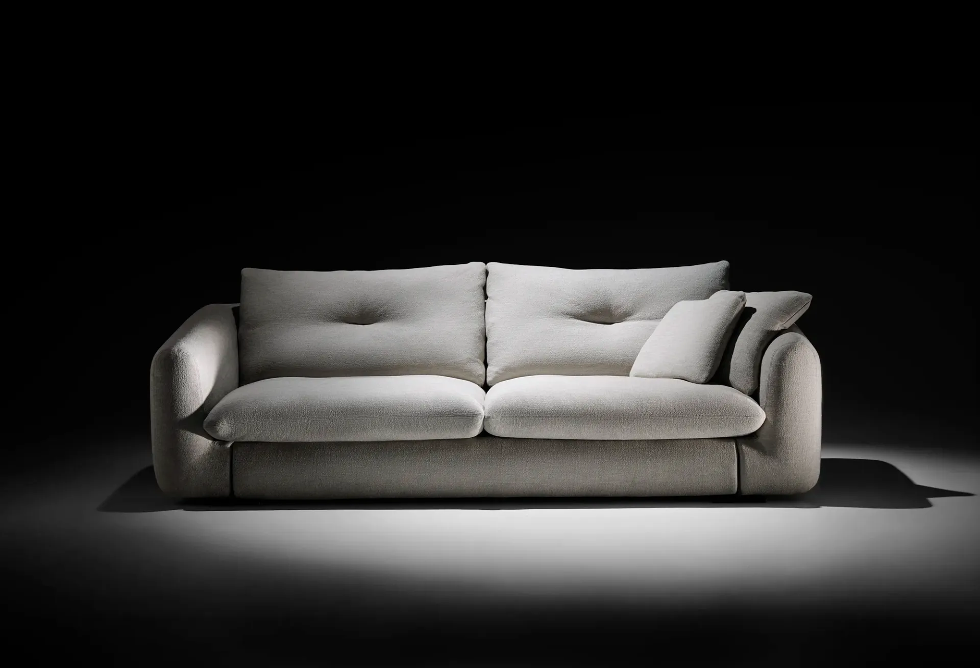 Il modello Kumo si distingue per i suoi morbidi cuscini in fiocco di microfibra cava siliconata, progettati per offrire un comfort accogliente e recuperare istantaneamente la forma originaria.