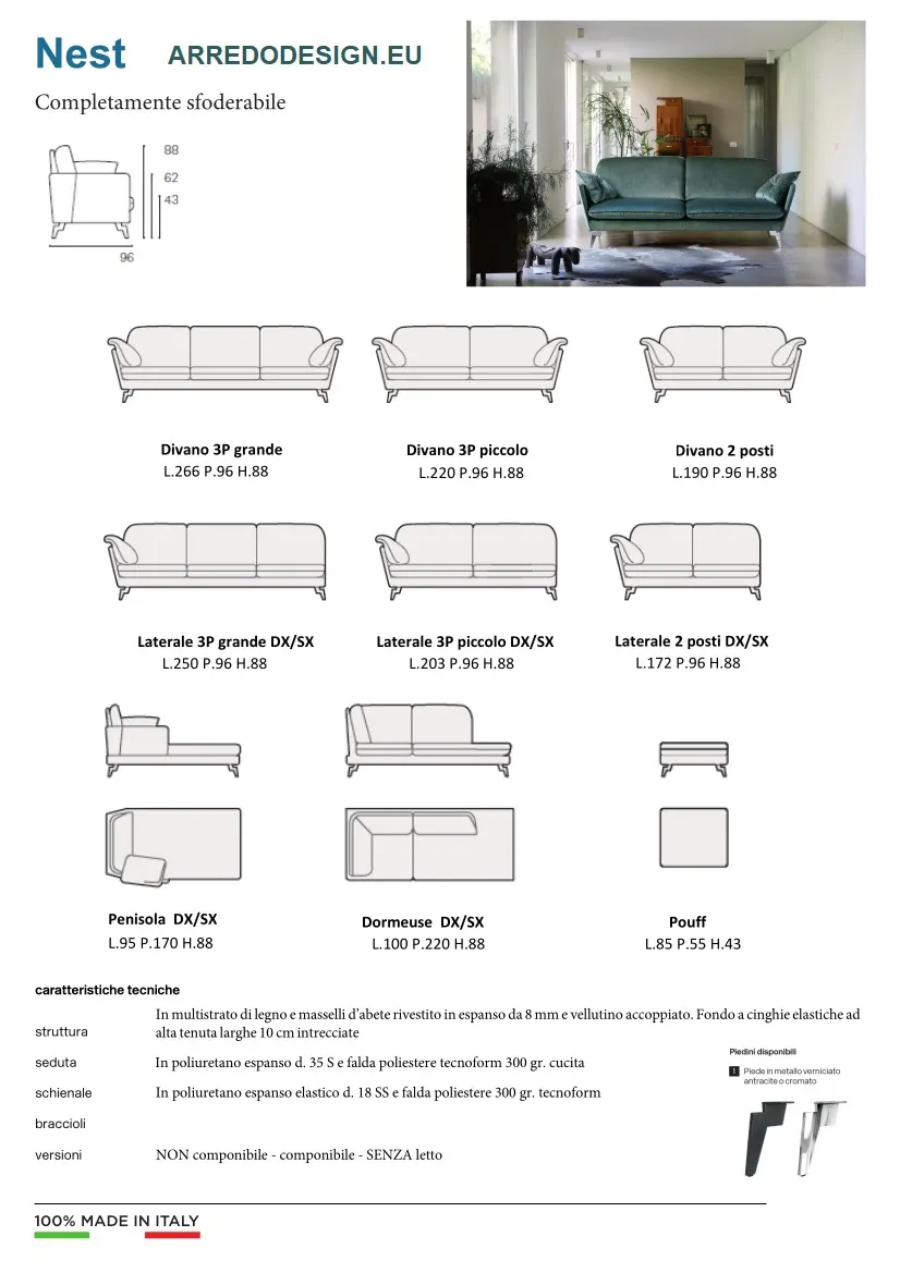 - Allo scopo di gestire perfettamente le quotidiane attività di pulizia dei tuoi imbottiti, considera di valutare pure il tipo di rivestimento che fa per te: in questo caso, Nest è in Tessuto sfoderabile.