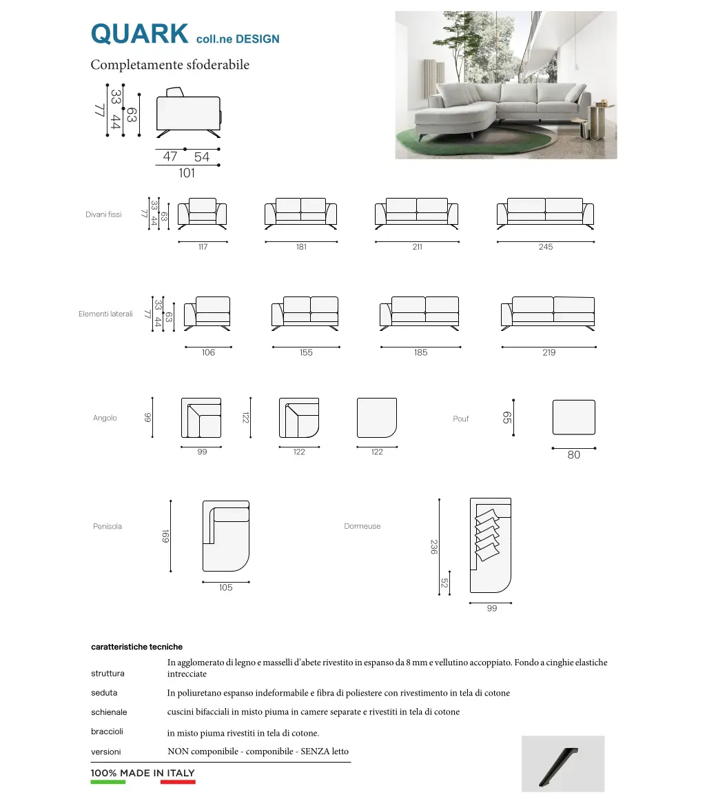 Il prezzo esposto e del divano QUARK con penisola come in foto misura cm 290x169 con rivestimenti a scelta in categoria A.