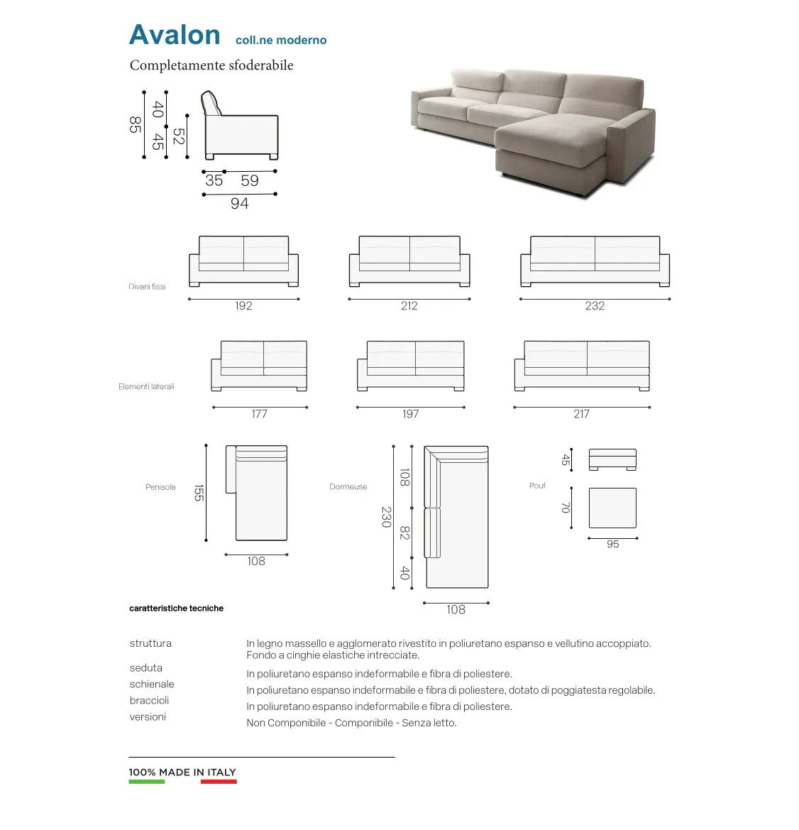 Il prezzo esposto e del divano AVALON con penisola come in foto misura cm 305x155 con rivestimenti a scelta in categoria A.