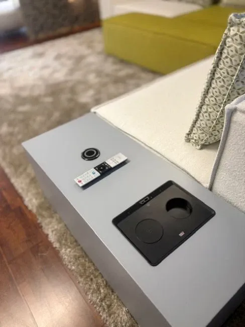 Dotato di tavolino con caricatore wireless e vassoio portabibite.