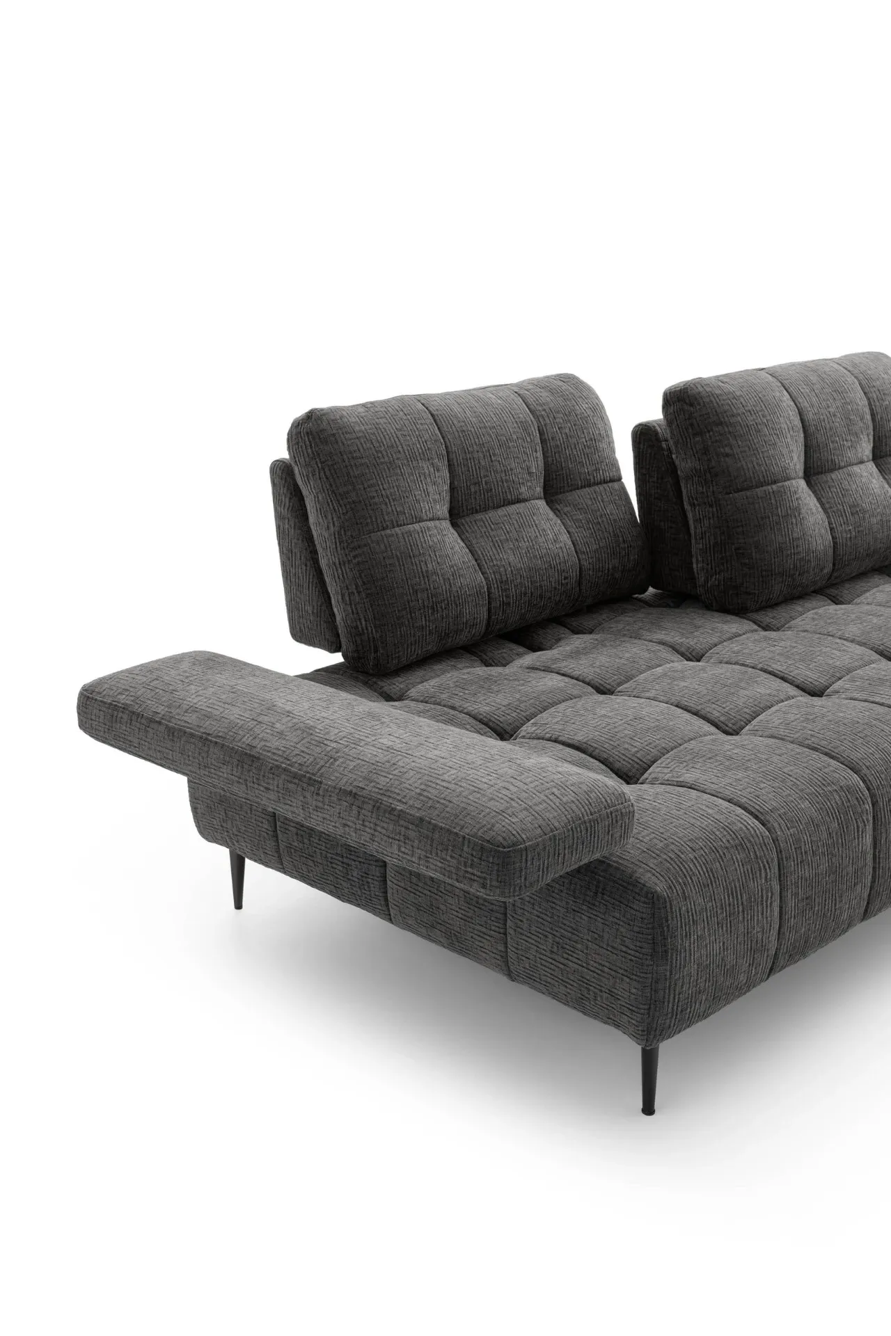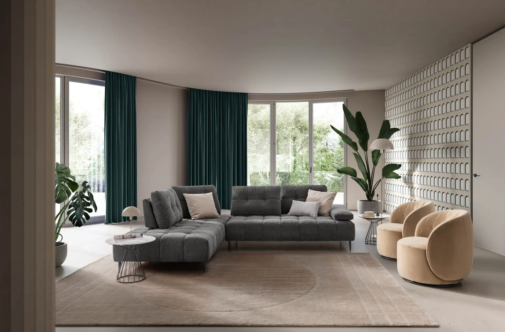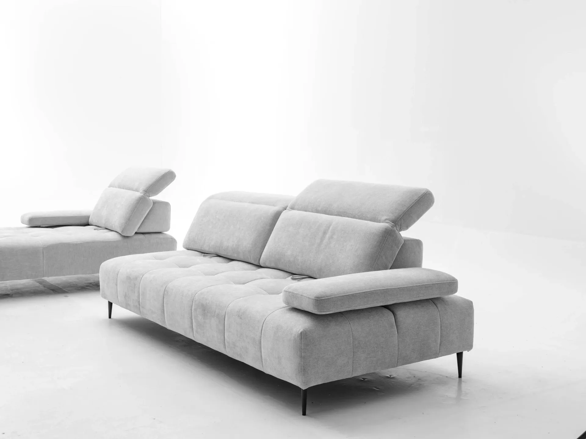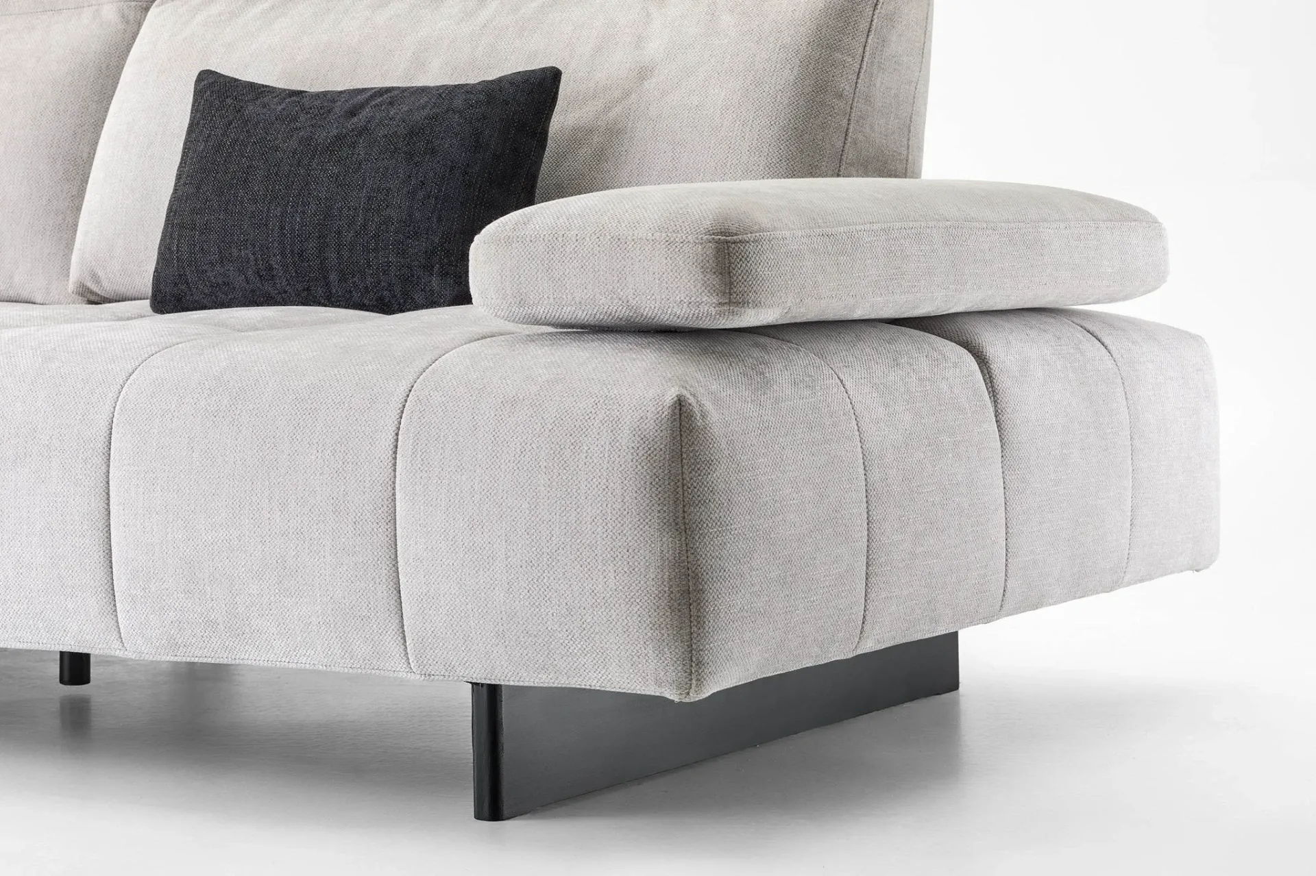 Il profilo è slanciato dai piedini alti 15 cm che alleggeriscono i volumi complessivi, mentre la seduta ampia in Tecnoform un sandwich di poliuretani indeformabile con inserto in memory foam invita al comfort profondo, ideale tanto per la conversazione quanto per i momenti di riposo.